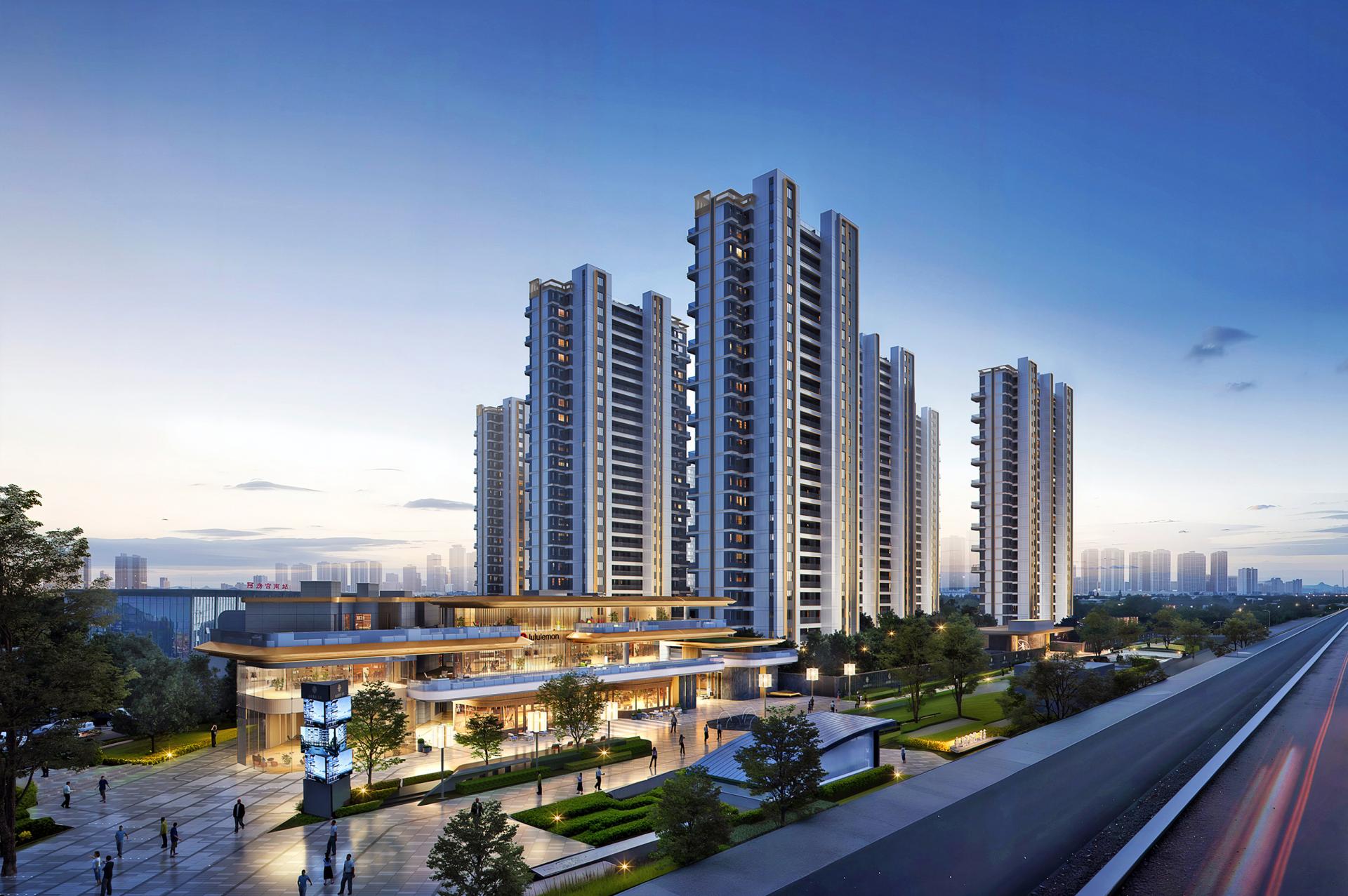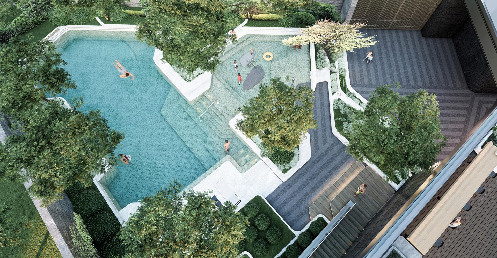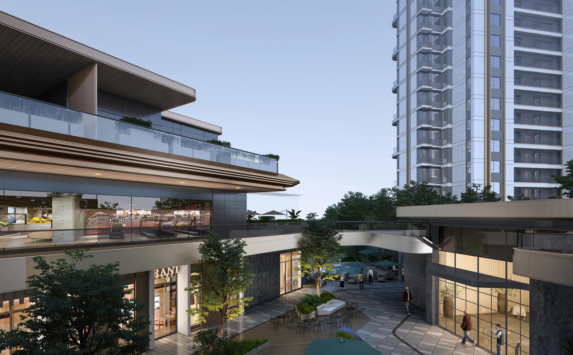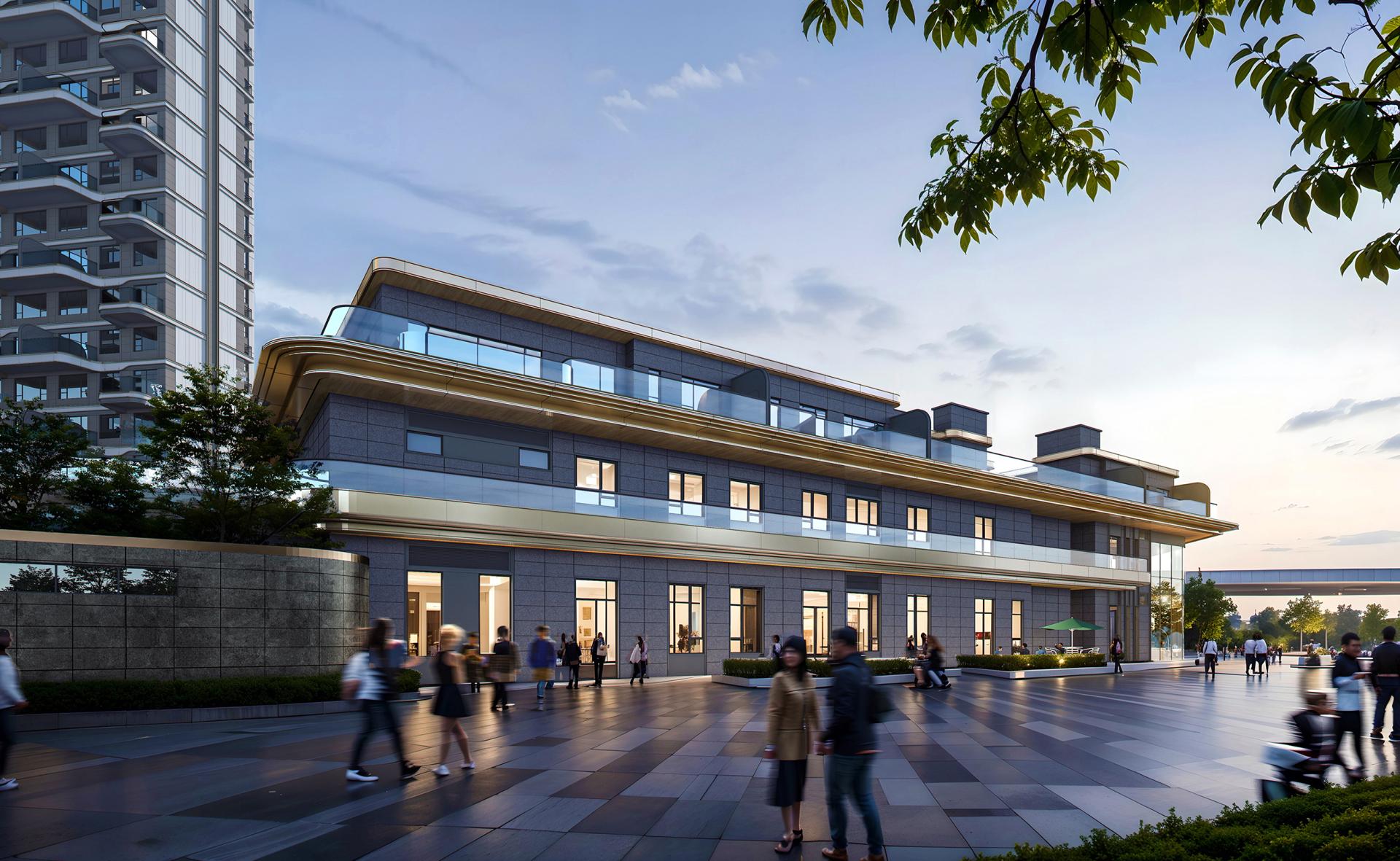 The core inner courtyard echoes the prosperous scene depicted in the cultural context— "Outside the Epang Palace, there were once nine markets, where goods abounded like stars". It integrates lifestyle amenities such as a swimming pool, coffee shop, flower shop, and sports club. The wood-toned color palette isolates the hustle and bustle of the city; the tranquil water courtyard intertwines with vibrant supporting facilities. This not only revives the lively atmosphere (comparable to the "vitality of markets" around the ancient Epang Palace) but also creates a warm and casual scene for modern residential living.