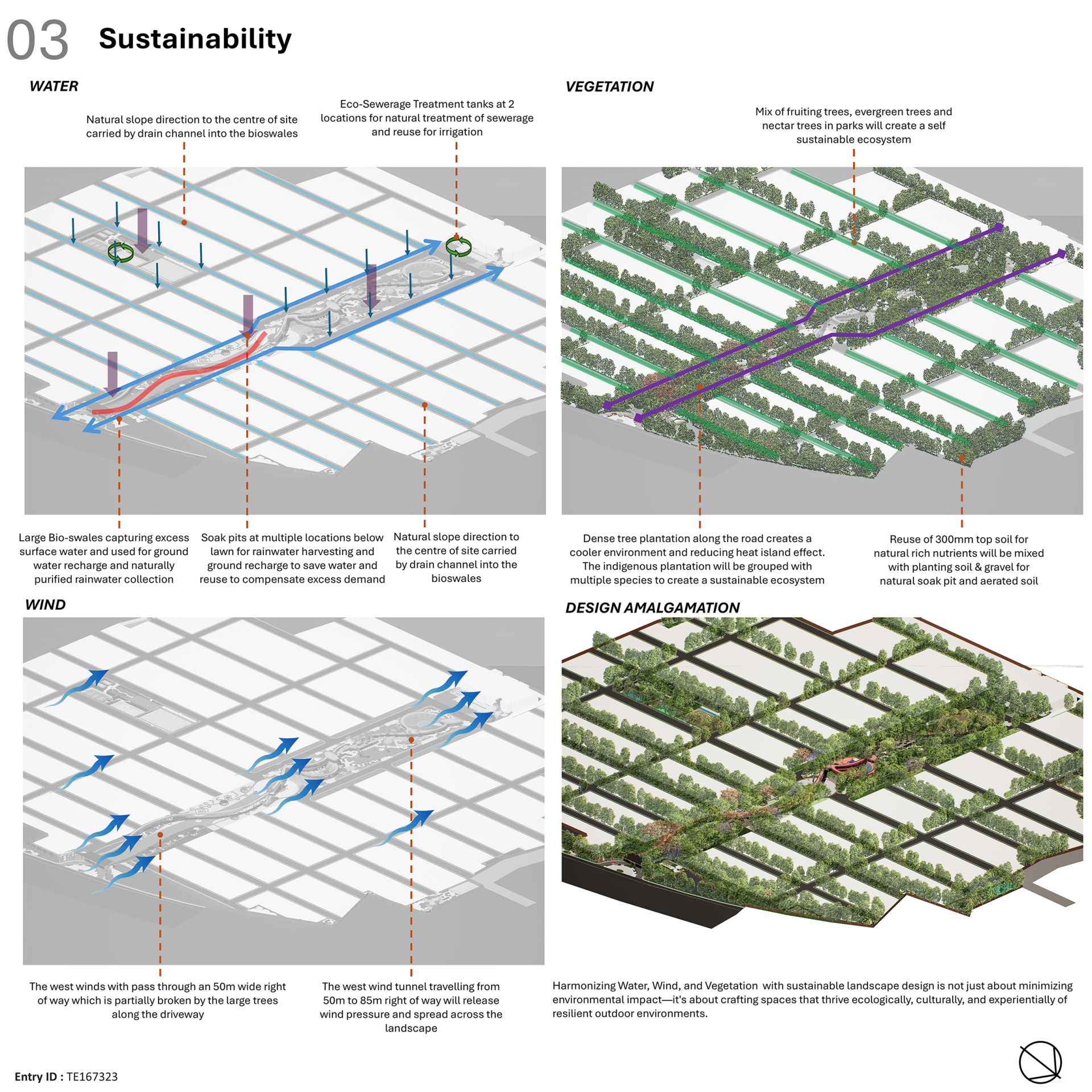 A 300-meter experiential bridge weaves through and connects these spaces, encouraging exploration and unity across the site. The design emphasizes ecological resilience, community engagement, and modular flexibility offering a future-forward model of living in sync with nature. Site Inventory and Analysis was Conducted for a thorough study of soil, drainage, climate, topography, and existing vegetation to identify natural features, constraints, and opportunities.