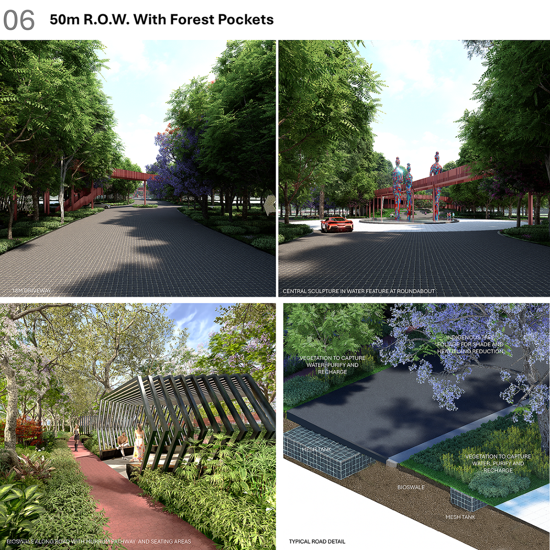 Refine designs to specify plant species, materials for the bridge and walkways, and seating formats, ensuring hexagon-based forms persist throughout. Structuring Indigenous planting in layers with trees, shrubs, grasses using various massing. Integrate sustainable systems like rainwater harvesting, Bio-swales, Eco-STP and Solar lighting to attraction to local flora and fauna. Each step embraces hexagonal patterns and forest inspiration, merging nature’s logic and human needs for a beautiful villa community.