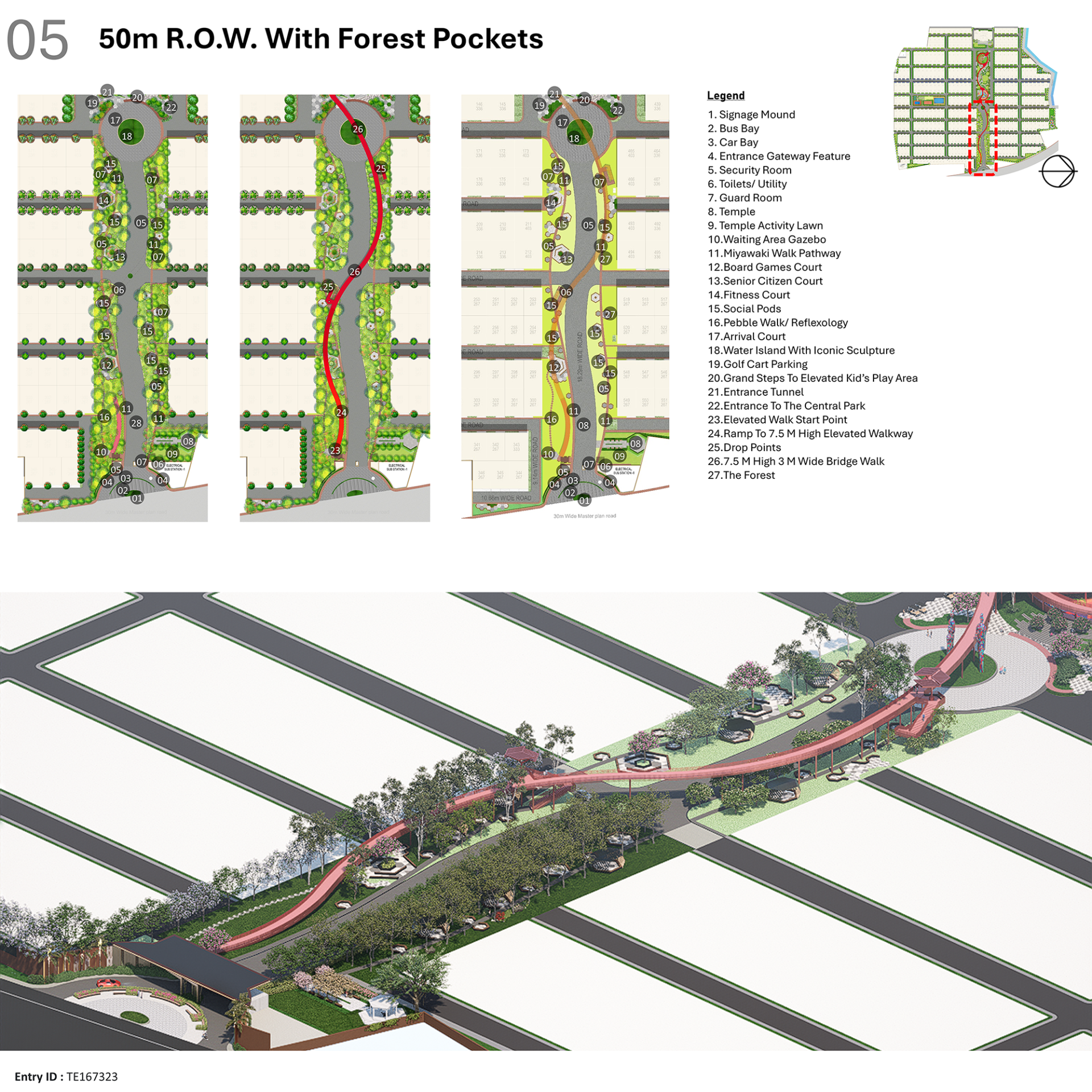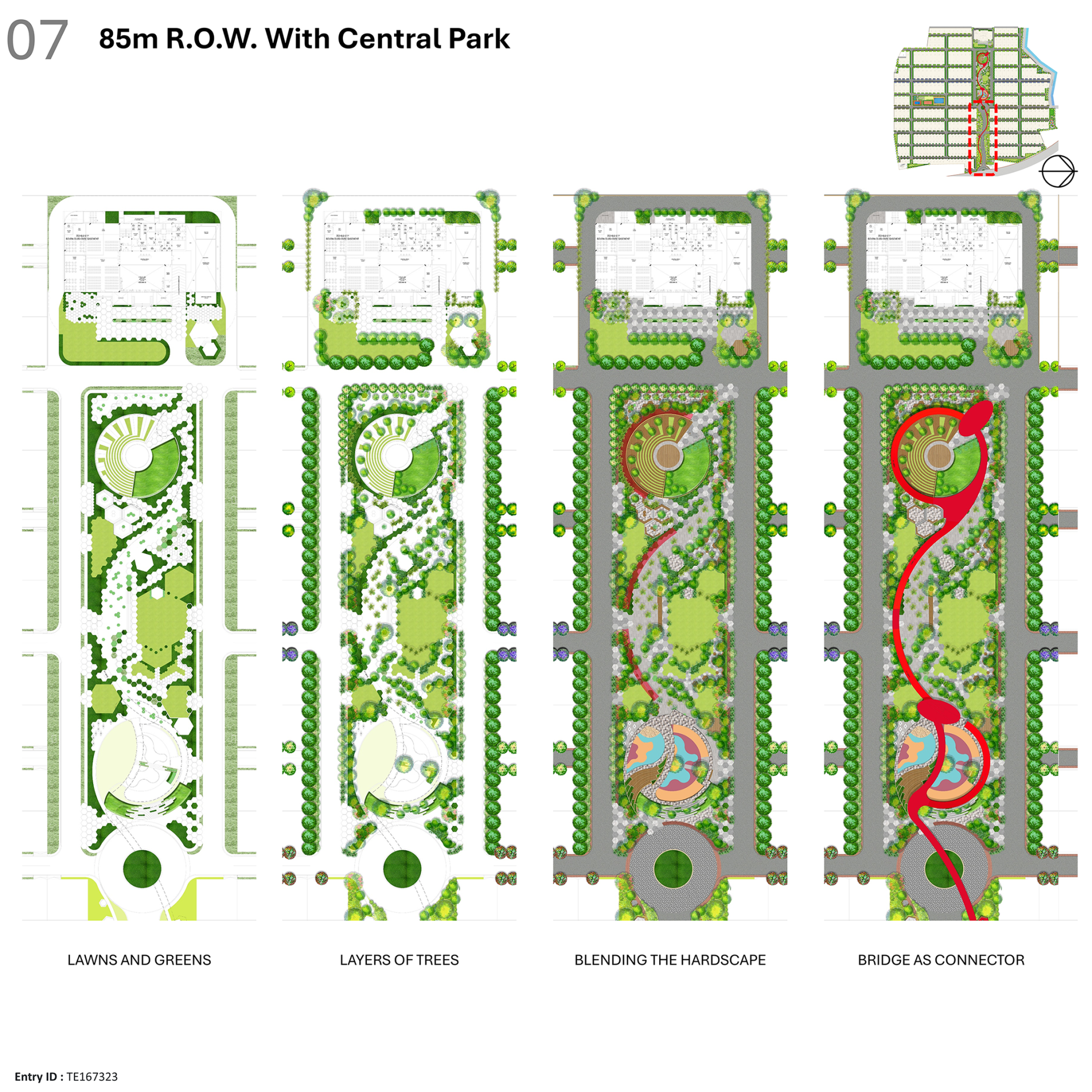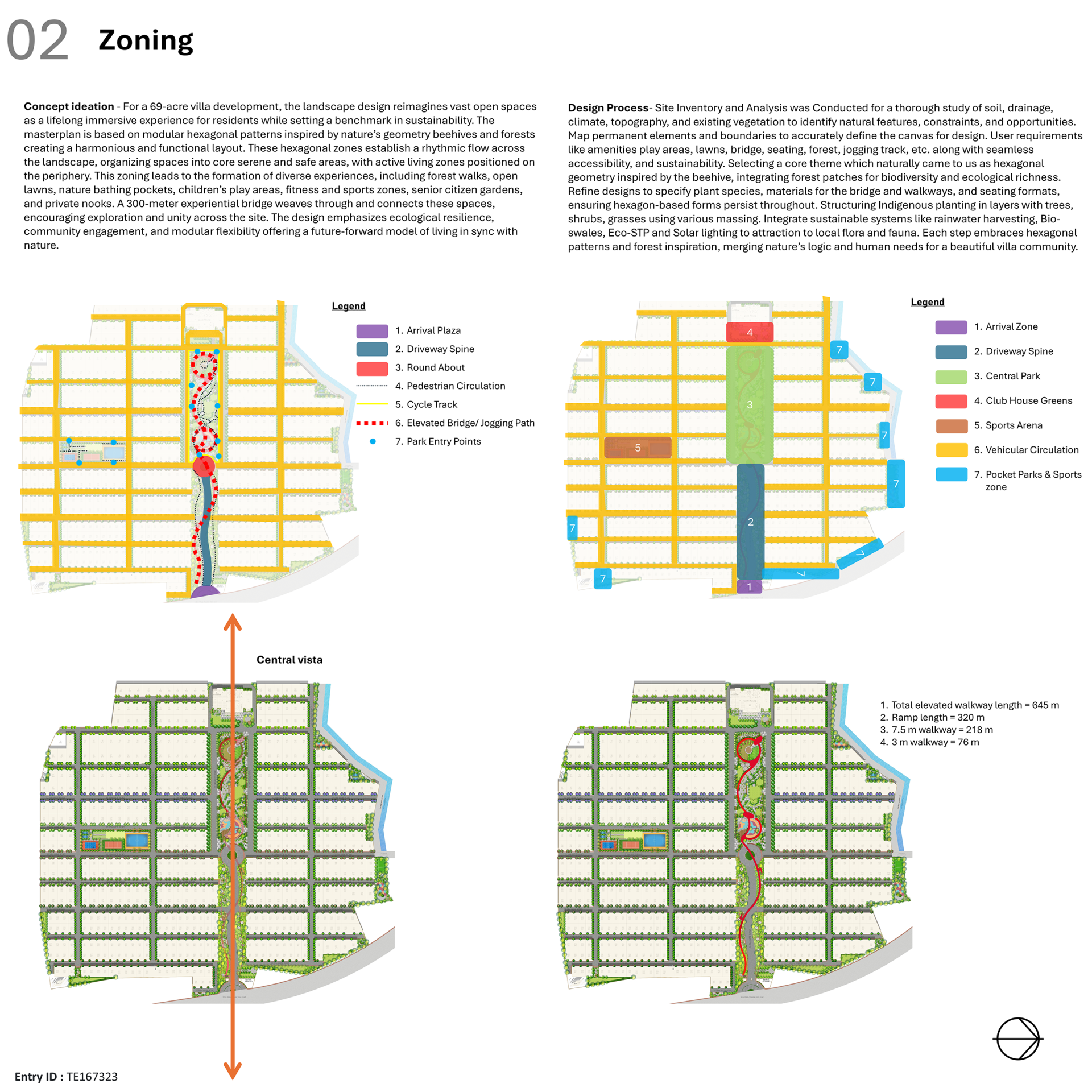 These hexagonal zones establish a rhythmic flow across the landscape, organizing spaces into core serene and safe areas, with active living zones positioned on the periphery. This zoning leads to the formation of diverse experiences, including forest walks, open lawns, nature bathing pockets, children’s play areas, fitness and sports zones, senior citizen gardens, and private nooks.