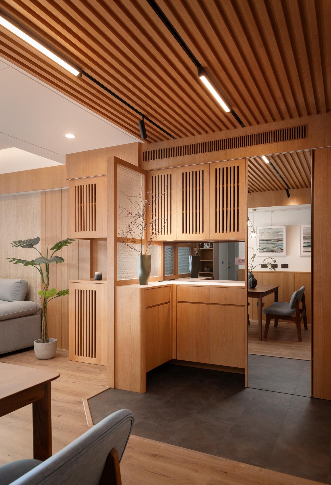 The theme of this project is Begonia: begonia glass is a classic patterned glass craft popular in Taiwan’s glass industry during the 1950s and 1960s. The pattern, designed by Taiwanese artisans, came from the flower begonia, which holds cultural significance in both Taiwan and China. The glass offers both privacy and an elegant aesthetic. The designer incorporated Begonia glass into lighting fixtures, entryway screen, and doors on the shelves, blending Japanese-inspired design with retro Taiwanese elements, seamlessly integrating culture into daily life.