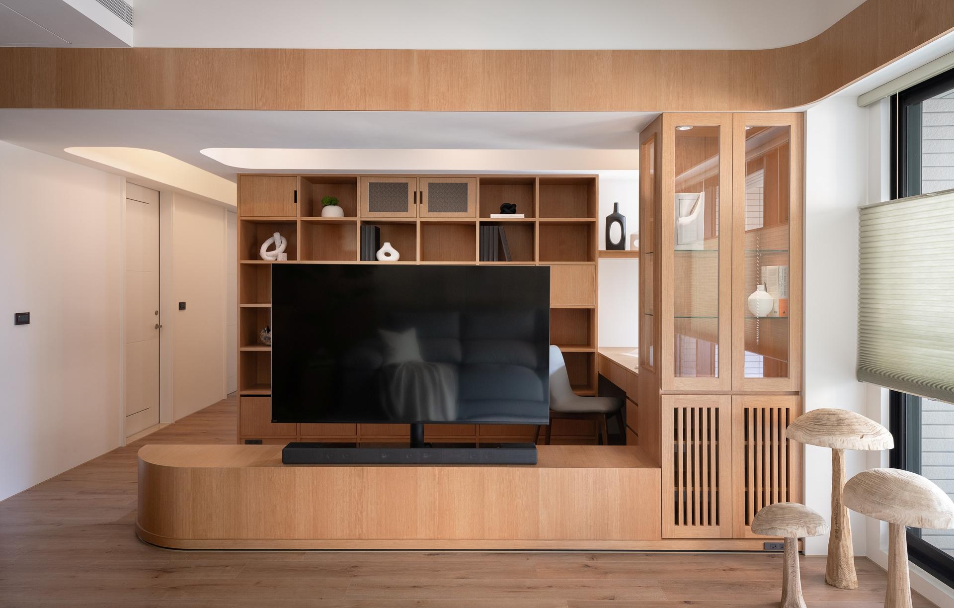 To maximize space and openness, the designer merged the study and living room without a traditional TV wall, using a swivel mount for flexible viewing. Generous storage with dust-proof cabinets caters to the homeowners' hobbies and keeps the space organized.