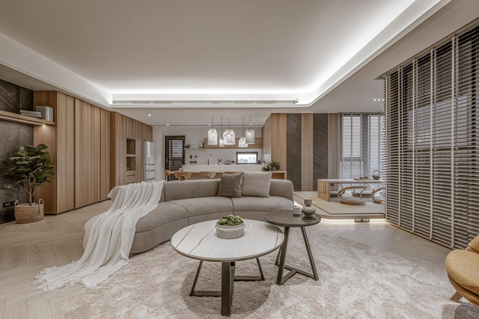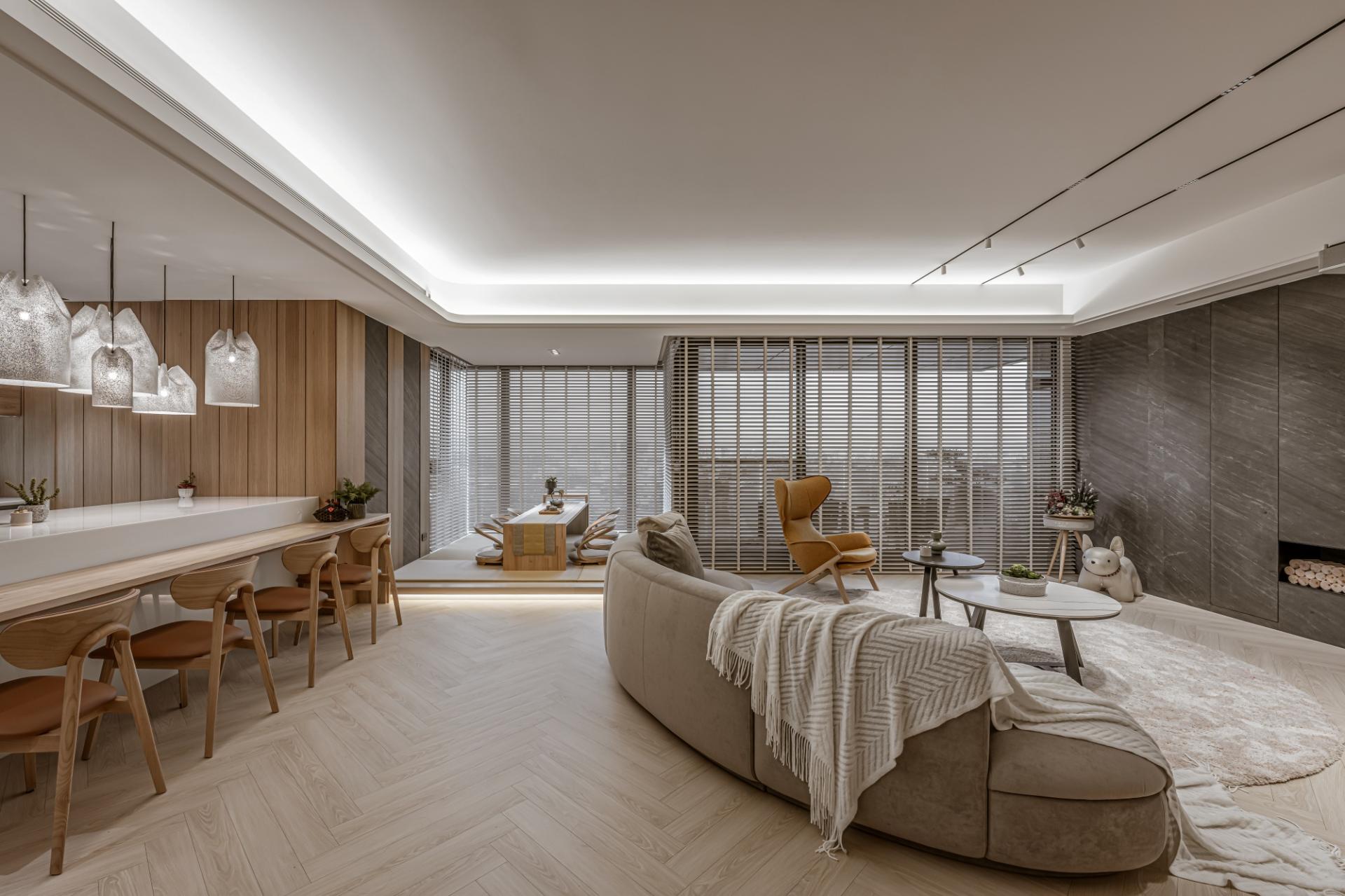 Modern style forms the serene foundation of the abode, infused with Japanese sensibilities, warmth, negative space, and a quiet sense of inward calm. Natural elements such as wood, daylight, and stone textures create a cozy, lived-in environment that the homeowner is longing for. The public areas adopt an open-plan layout that links the living room, dining room, kitchen, and tatami room. By intentionally softening the boundaries between zones, the design not only brings family and friends closer, but also allows light and sightlines to flow naturally, redefining the home as a space shaped by everyday interaction rather than strict function.