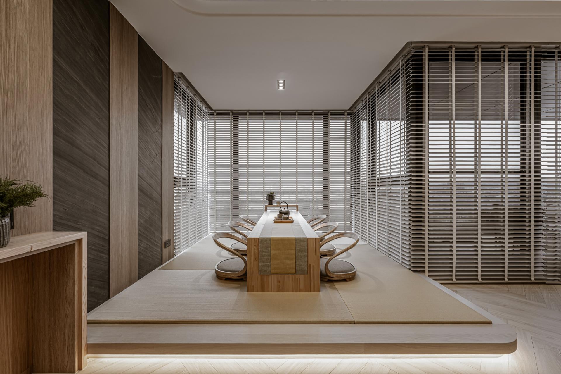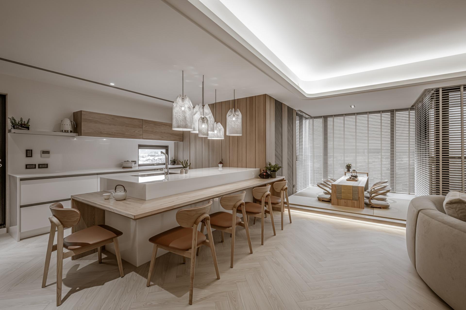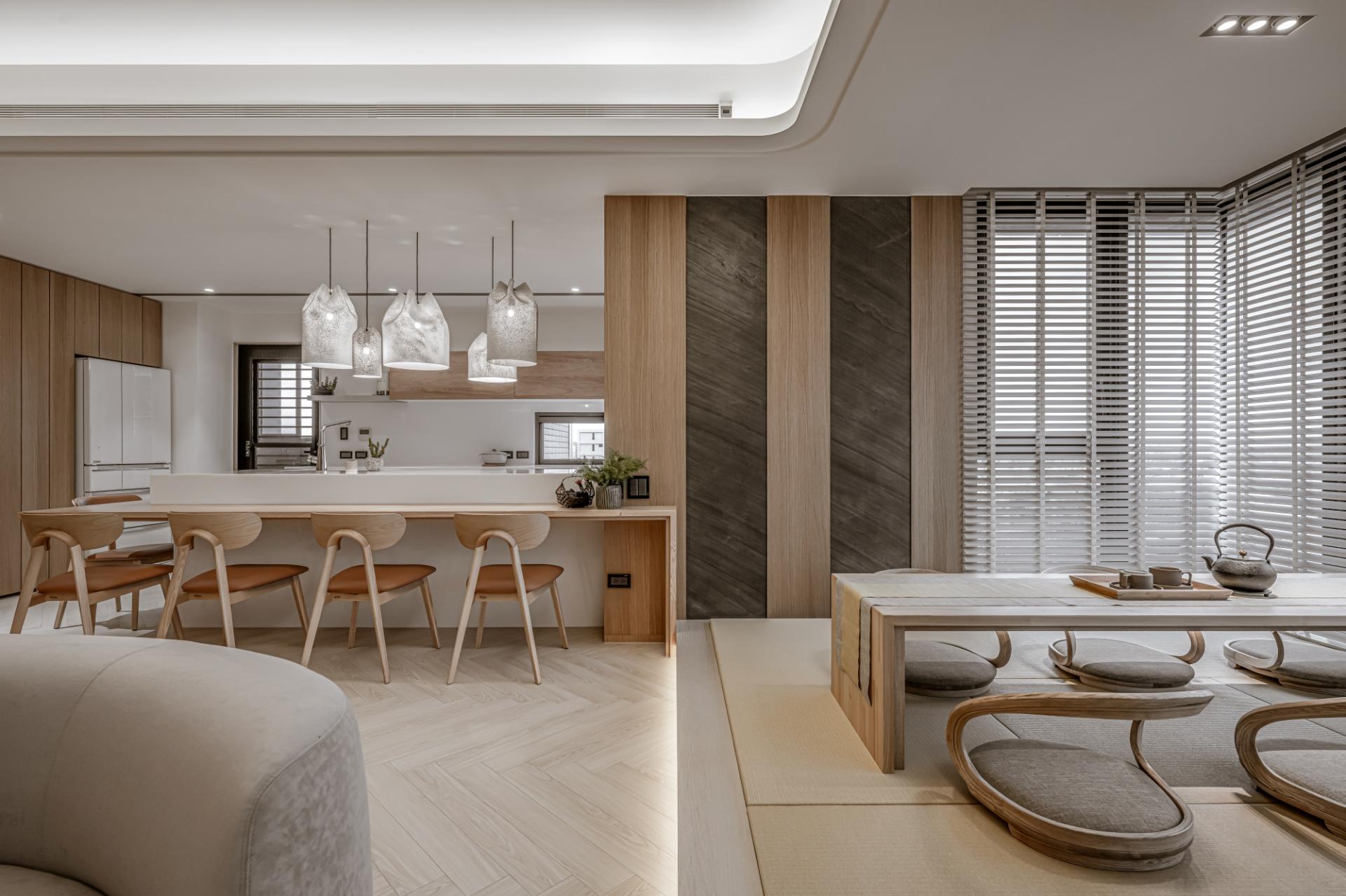 The dining area is inspired by the Japanese omakase counter. The dining table connecting to a kitchen island can maximize space. You can serve meals directly from the island to the table, reducing clutter and improving workflow. Additionally, this setup creates a cozy environment where family and friends can gather, making cooking and dining a shared experience. In a well-lit, irregular corner, a tatami room caters to both socializing and solitude, accommodating a variety of daily needs.