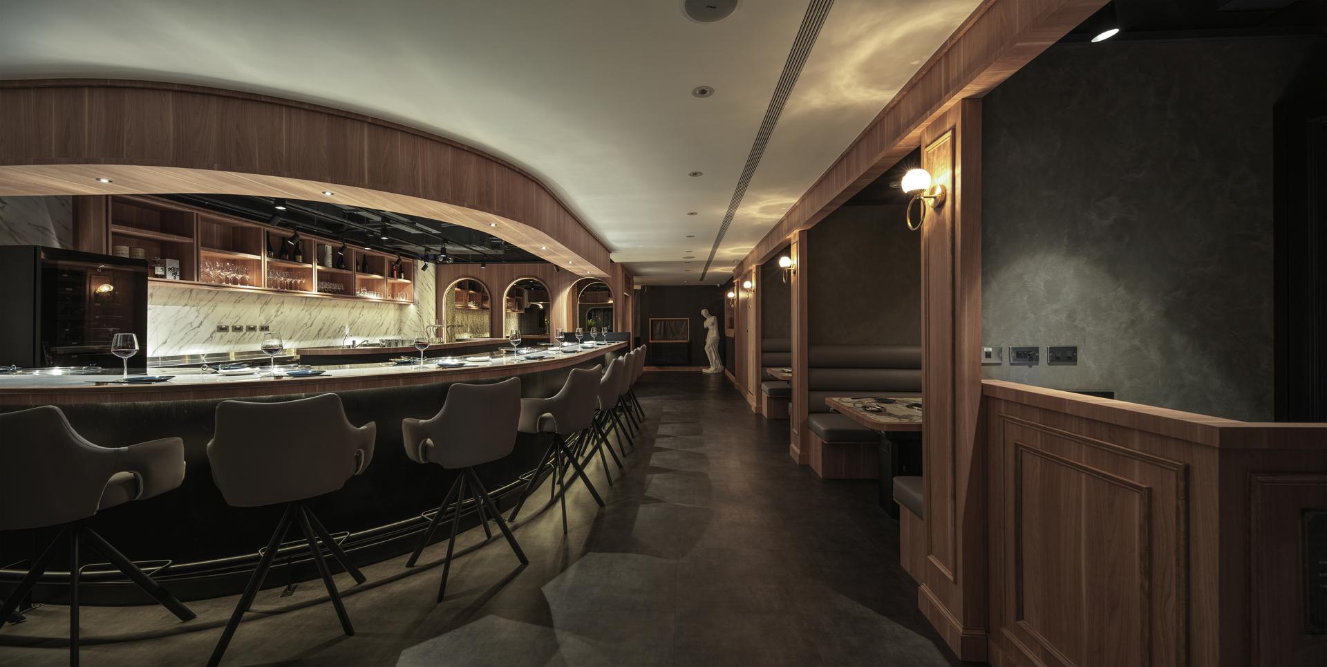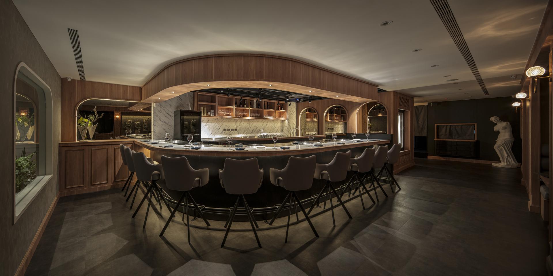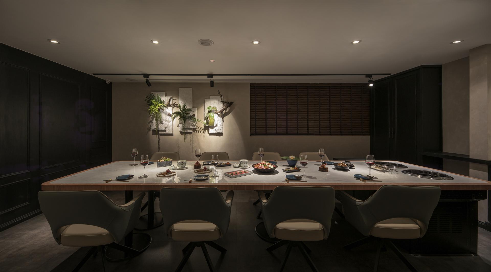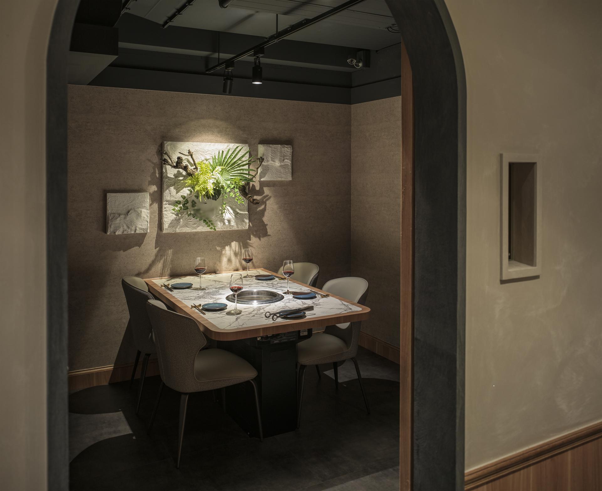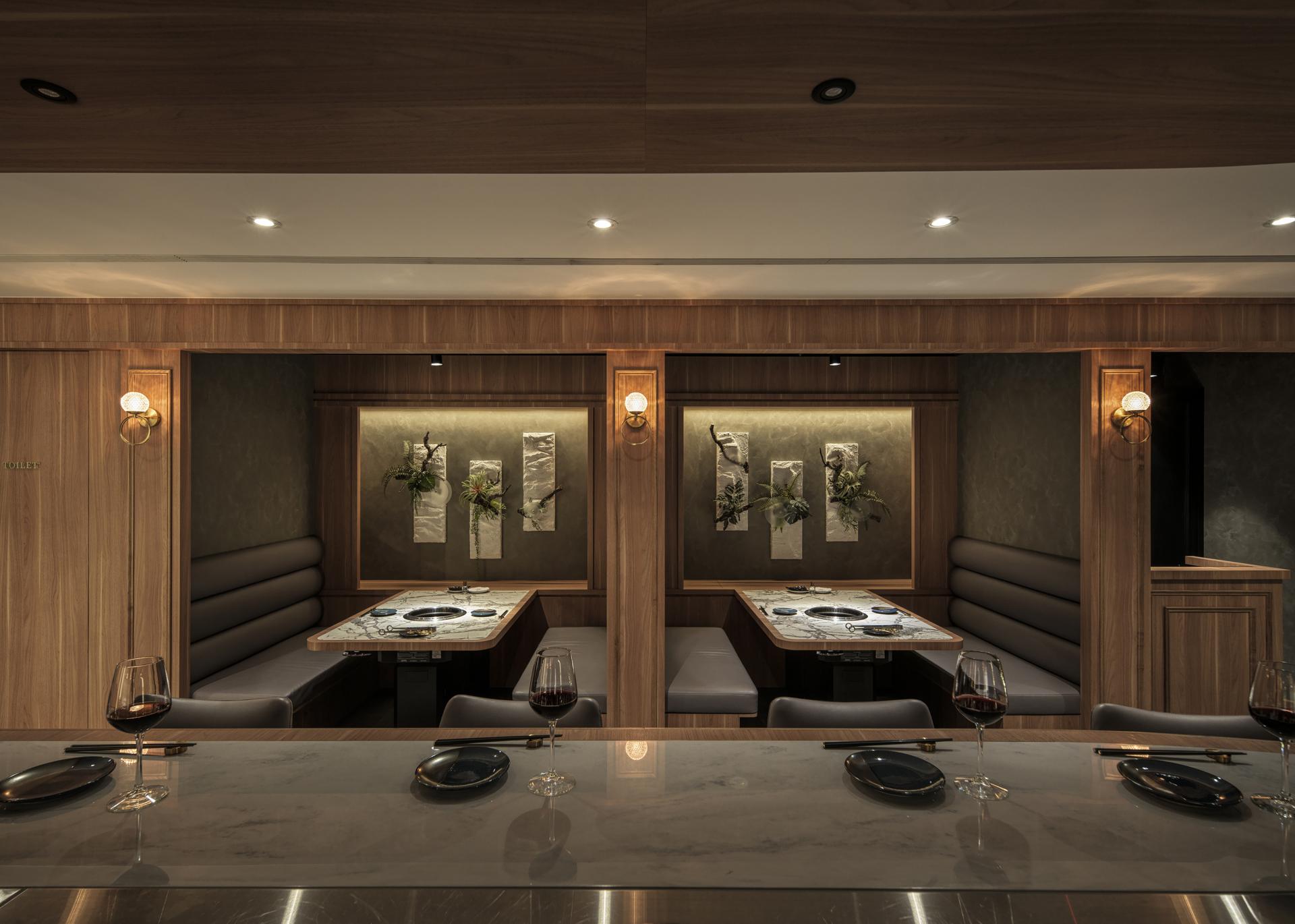 On the ground floor, a curved presentation bar anchors the spatial composition, guiding sightlines and creating openness without sacrificing intimacy. Semi-enclosed booths balance visibility with discretion, responding directly to Taichung’s dining culture. A below-10°C butchery room makes craftsmanship visible, reinforcing the brand’s commitment to ingredient quality as both a culinary and spatial statement.