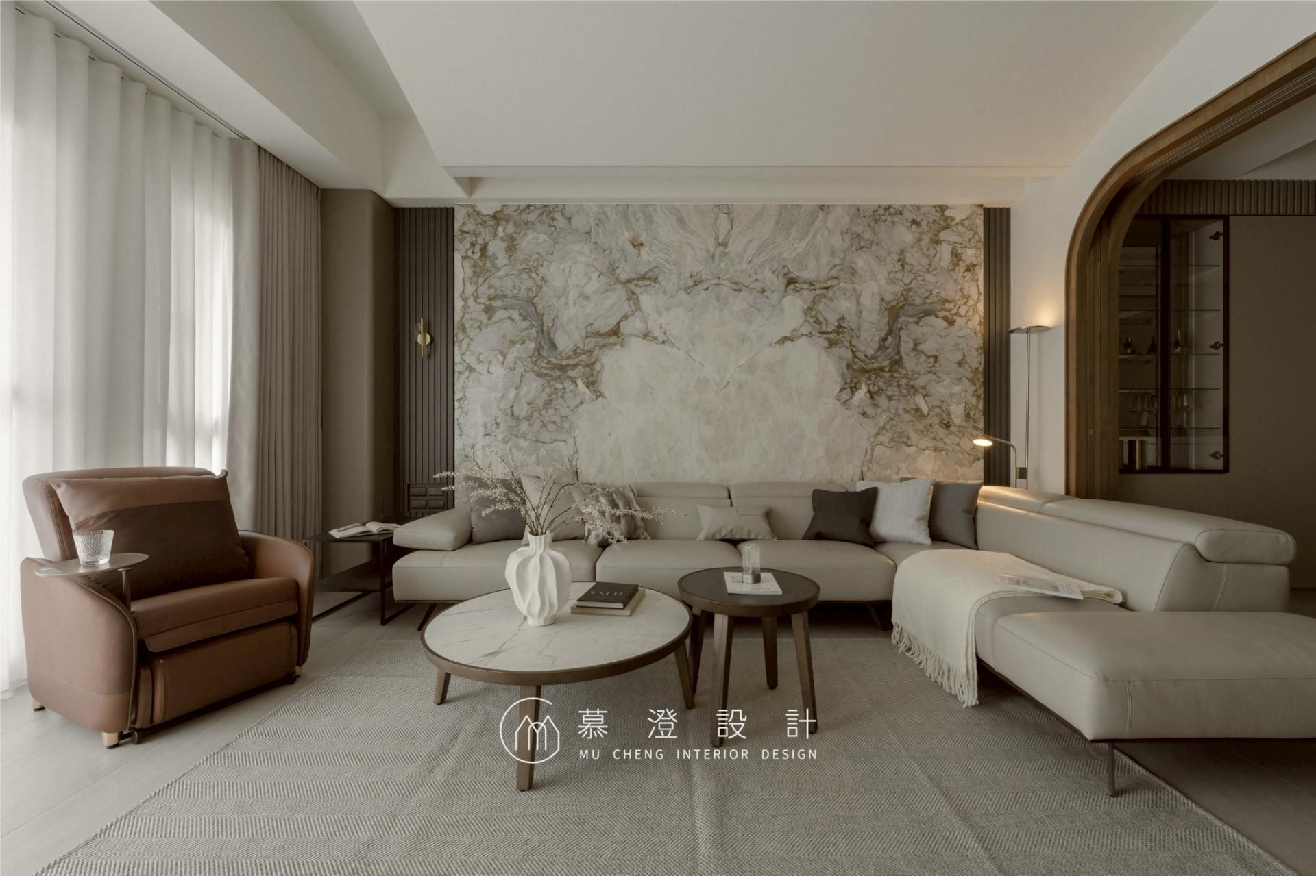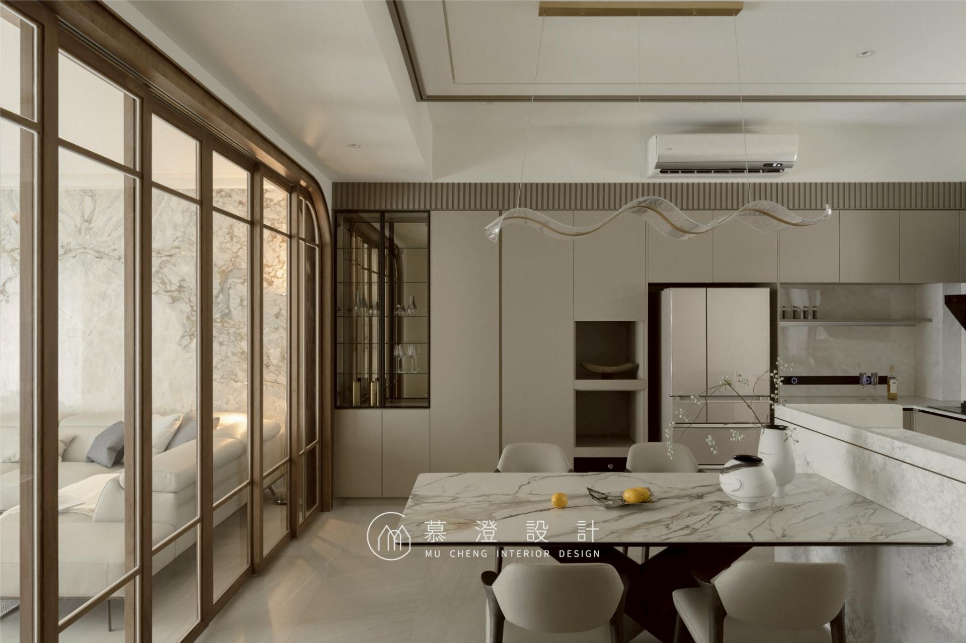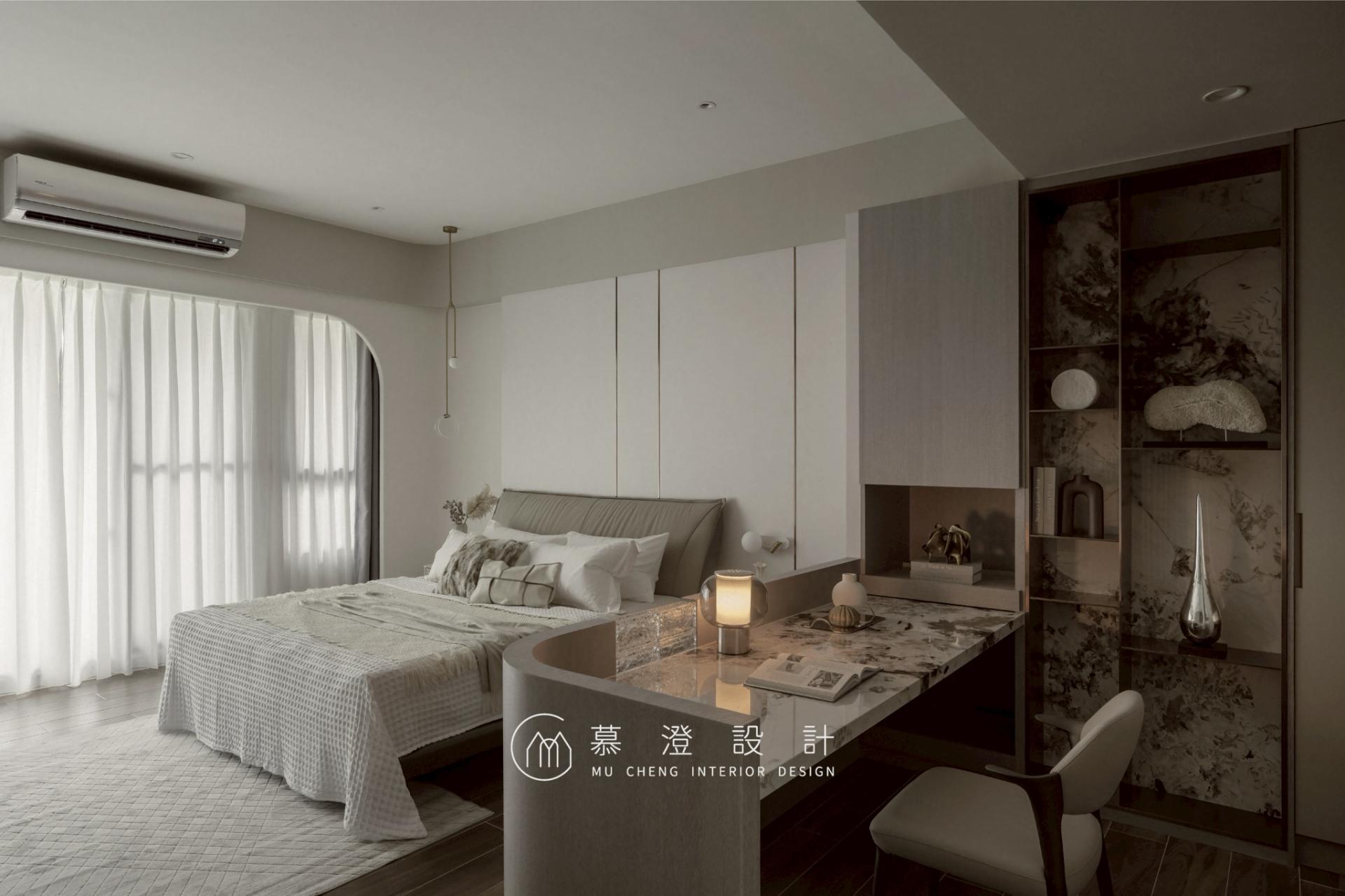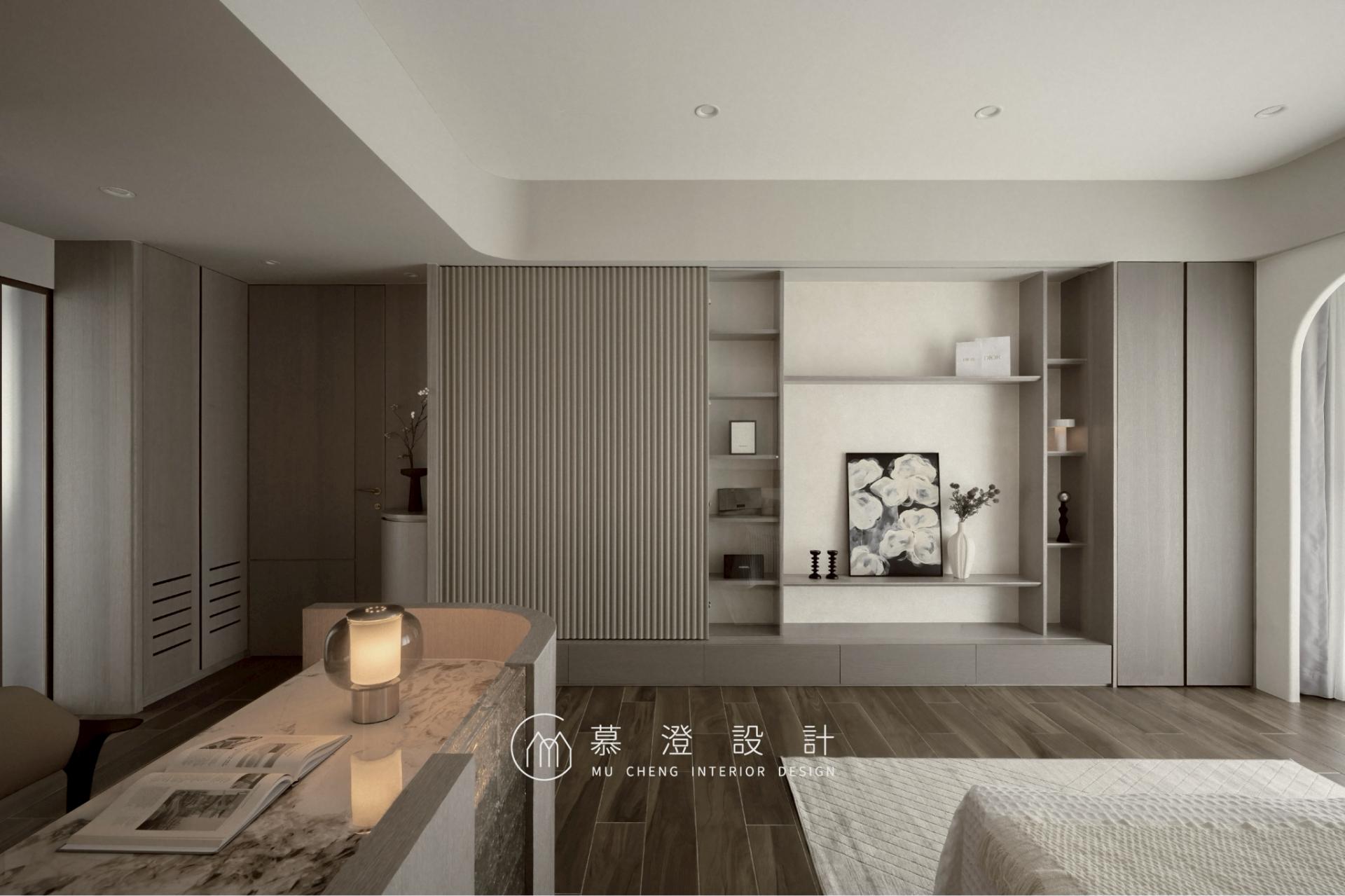 In this four-story residence, rather than following the conventional layout where the ground floor serves as the shared living space, the interior design prioritizes the needs of the elderly by locating their bedroom on the ground floor to limit the need for stairs. The second floor unfolds as the home’s shared living and dining space, conceived as a setting for daily connection and gathering, while the third and fourth floors are devoted to private spaces, offering a sense of calm. Every floor carries a distinct purpose, while seamlessly contributing to the harmony of the overall space. Embodying “Quiet Luxury Meets Nature,” the home layers beige and gray tones with marble, hand-applied finishes, and soft curves. Within the restrained palette, layers of nuanced texture give rise to a serene atmosphere of understated refinement. On the ground floor, the bedroom for seniors is designed specifically to ensure comfort, safety and easy movement. Two single beds are more versatile, accommodating individual preferences and providing flexibility. A compact sitting area and an en-suite bathroom together create a calm, peaceful atmosphere. On the second floor, the TV wall is finished with hand-applied plaster, which offers an unpretentious and natural aesthetic appeal. Behind the sofa, a marble wall anchors the space, bringing depth and quiet sophistication and allowing refinement and warmth to coexist. A glass sliding door delineates the living and dining areas. Wood envelops the porch and doors, softening light while clearly articulating spatial boundaries. The third-floor master bedroom features clean lines. The polished stone practically shines with the light it reflects, lending the space a quiet sense of elegance and understated glamour. A low glass block wall creates a private, light-filled reading nook by dividing space without blocking light, offering a cozy retreat. On the fourth floor, the secondary bedroom features a plaster-finished headboard wall with softly curved edges, creating an enveloping, restful atmosphere. A reading area is located behind the bed to fulfill various needs.