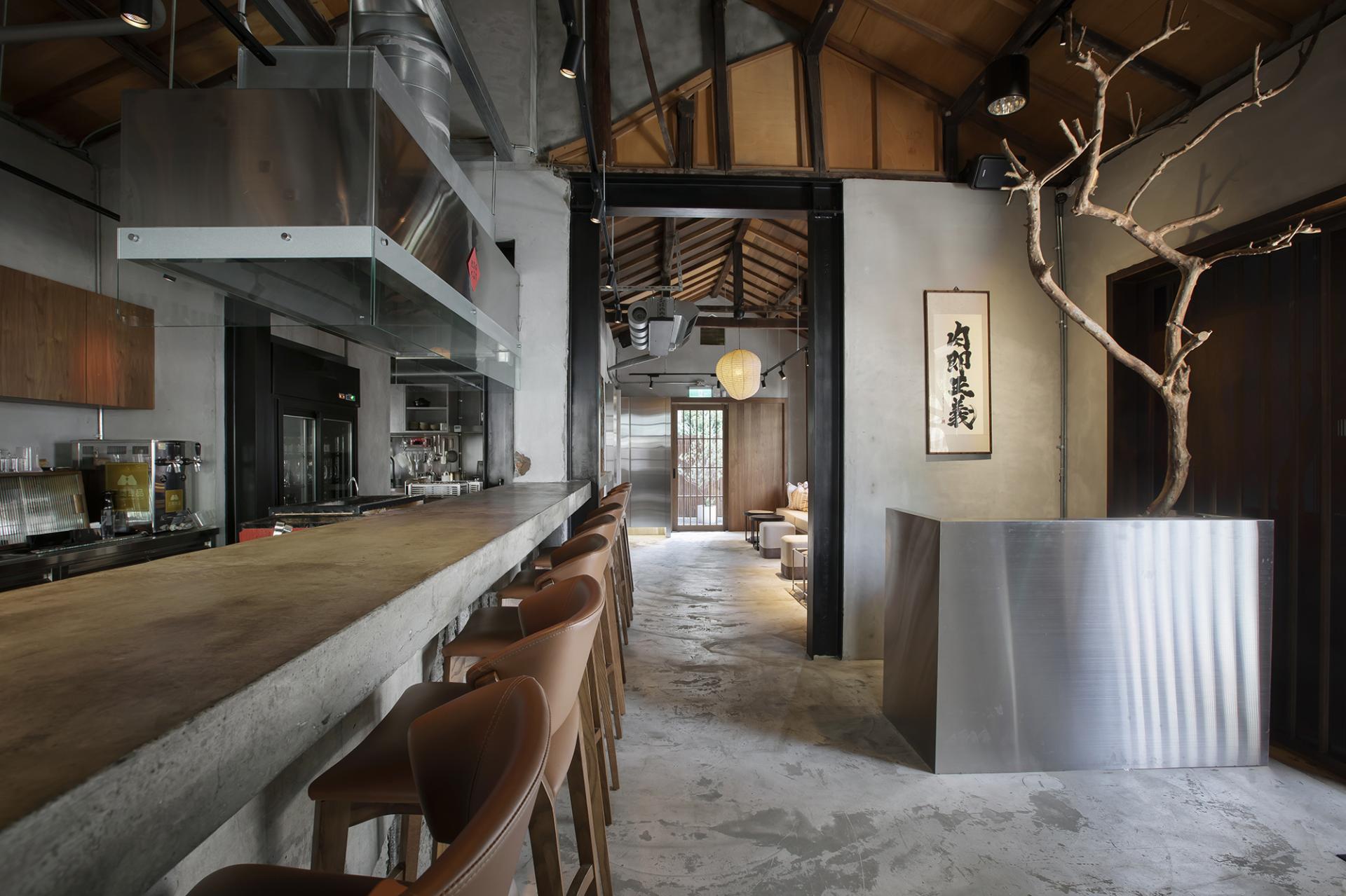 The outdoor landscaping draws inspiration from Japanese gardens and kare-sansui (dry landscape) aesthetics, seamlessly integrating natural elements into the urban environment. Both storefronts feature interior walls that combine concrete with red brick, emphasizing the rugged beauty of layered materials. The yakiniku area showcases an industrial design with a soaring sloped roof and exposed wooden beams, while the bar section reflects modern sophistication through stainless steel facades and expansive glass panels. The diverse use of materials—metal, ironwork, and wood—enhances the spatial experience, creating a dynamic and expressive atmosphere.