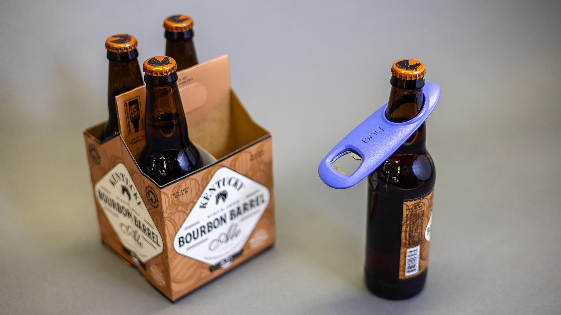 HUG features an angled, tapered cavity shaped from the familiar profile of common beverage bottles, allowing it to rest naturally against the bottle’s surface. This “hugging” relationship is both practical and symbolic, emphasizing that the opener is meant to stay with the bottle rather than exist as a separate tool. The sculpted opening at the center of the form clearly signals its function, requiring no instructions or learning. Another key functional detail of HUG is its integrated magnet, positioned around the metal opener. This magnet captures the bottle cap the moment it is removed, preventing it from being launched across a table or dropped onto the ground. While seemingly minor, this feature addresses a frequently overlooked moment in the interaction: what happens to the cap after opening. After use, HUG slides onto a nearby bottle, making it easy for the next person to find and use.