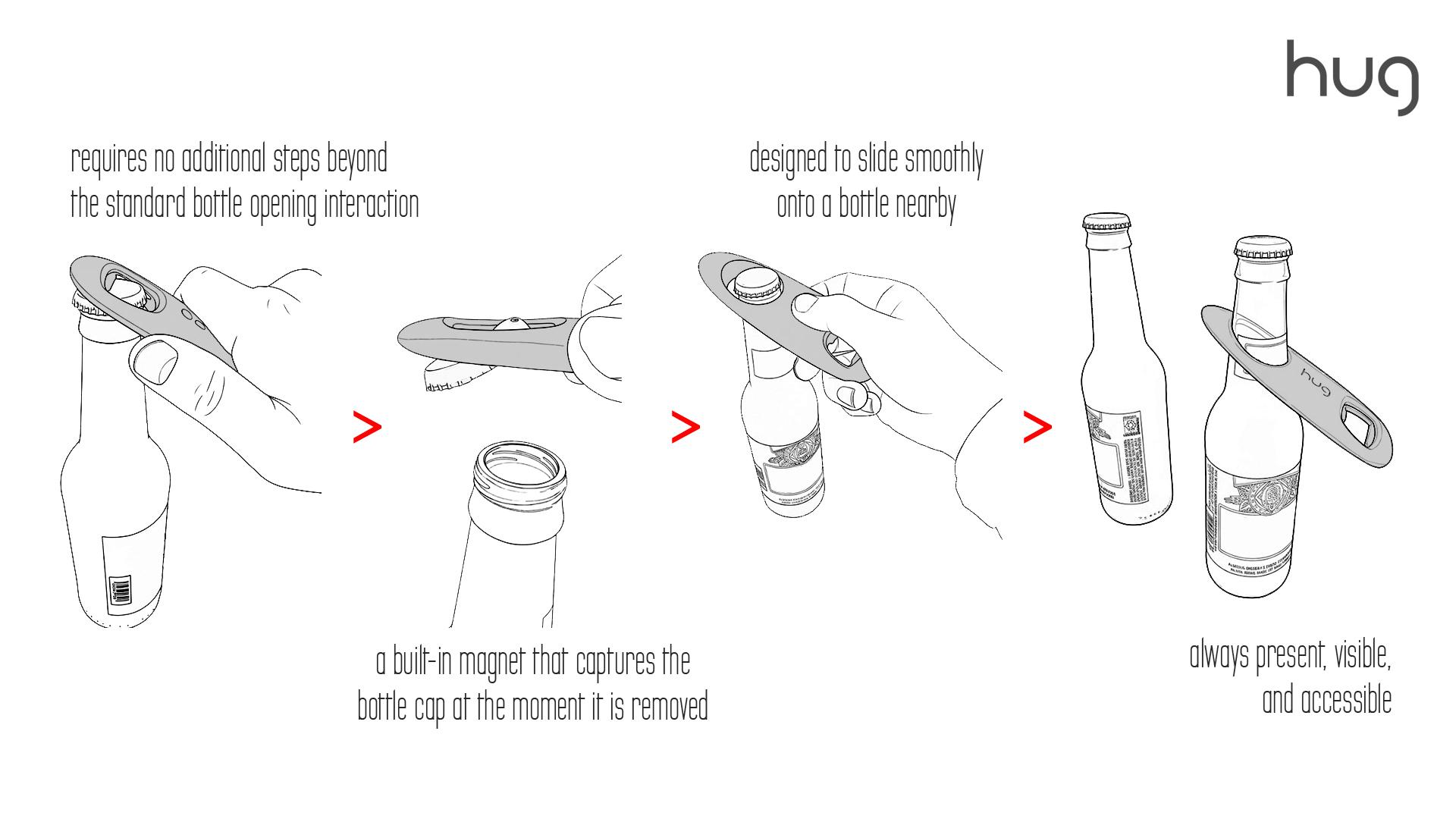 The HUG bottle opener emerged from close observation of everyday social behaviors and the small disruptions that occur during shared moments. While opening a bottle is typically perceived as a trivial action, it often introduces unnecessary friction in group settings. Bottle openers are frequently misplaced, borrowed, or passed around, and bottle caps tend to roll unpredictably across surfaces or fall to the floor. These moments, though brief, interrupt the flow of interaction and shift attention away from the social experience.