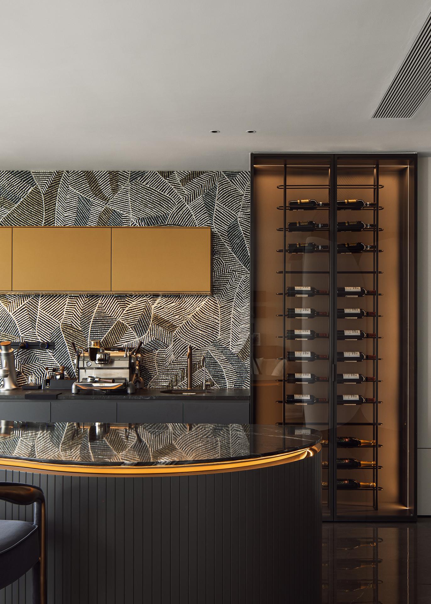 Innovations include a custom-shaped ceiling that discreetly conceals original beams and columns, preserving the space's aesthetic purity. A whole-house intelligent lighting system adapts to various scenarios and moods. The wet bar area features a thoughtfully lowered curved island and a wall adorned with crystal mosaics, meticulously laid by hand by a master artisan, transforming daily hydration into an artistic experience.