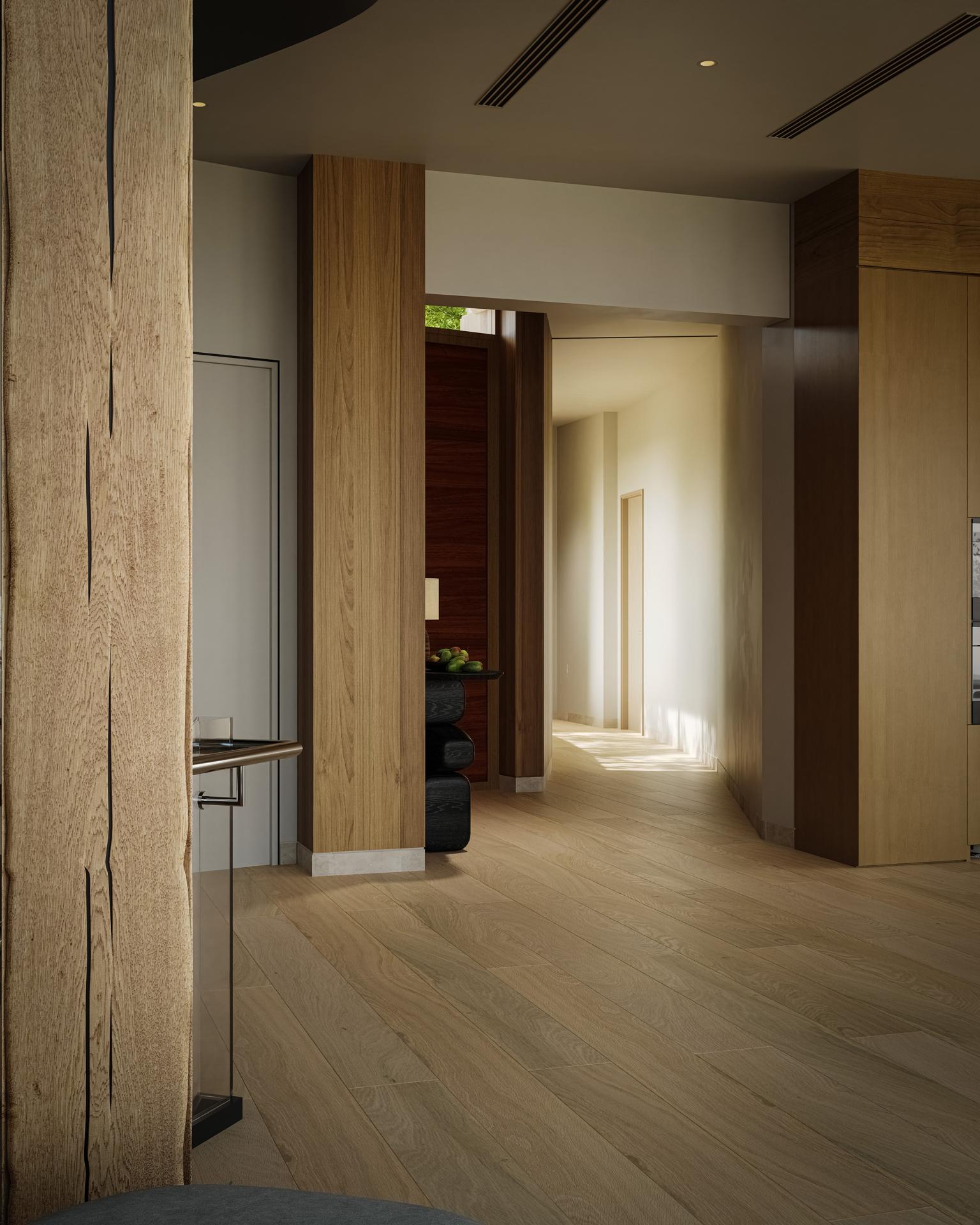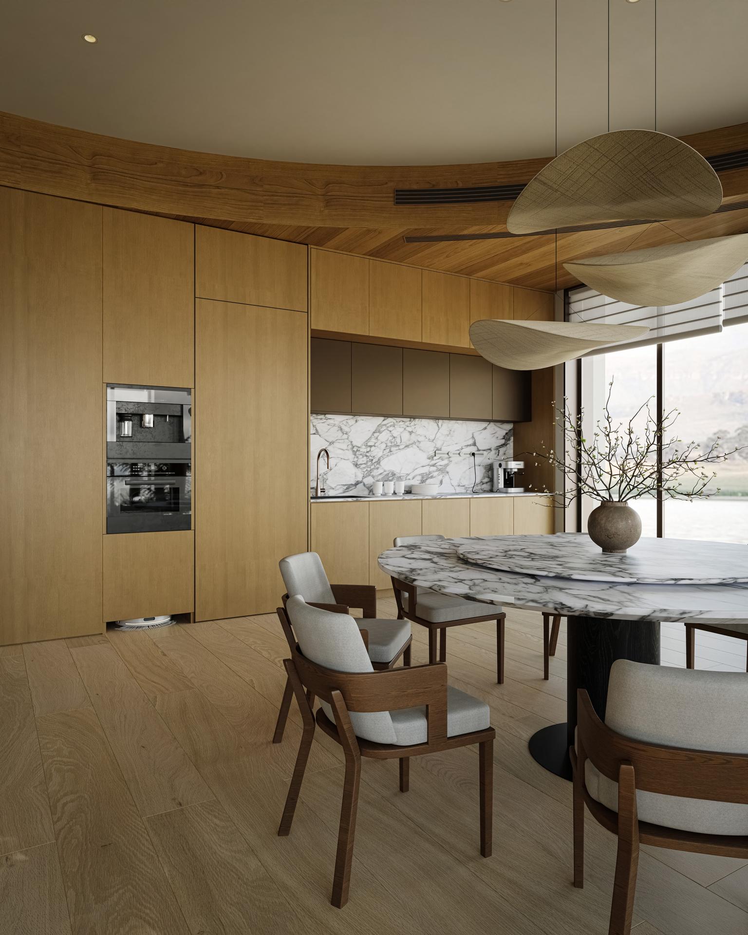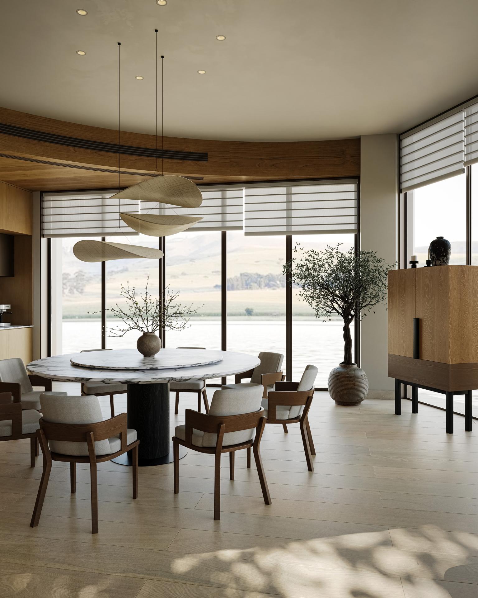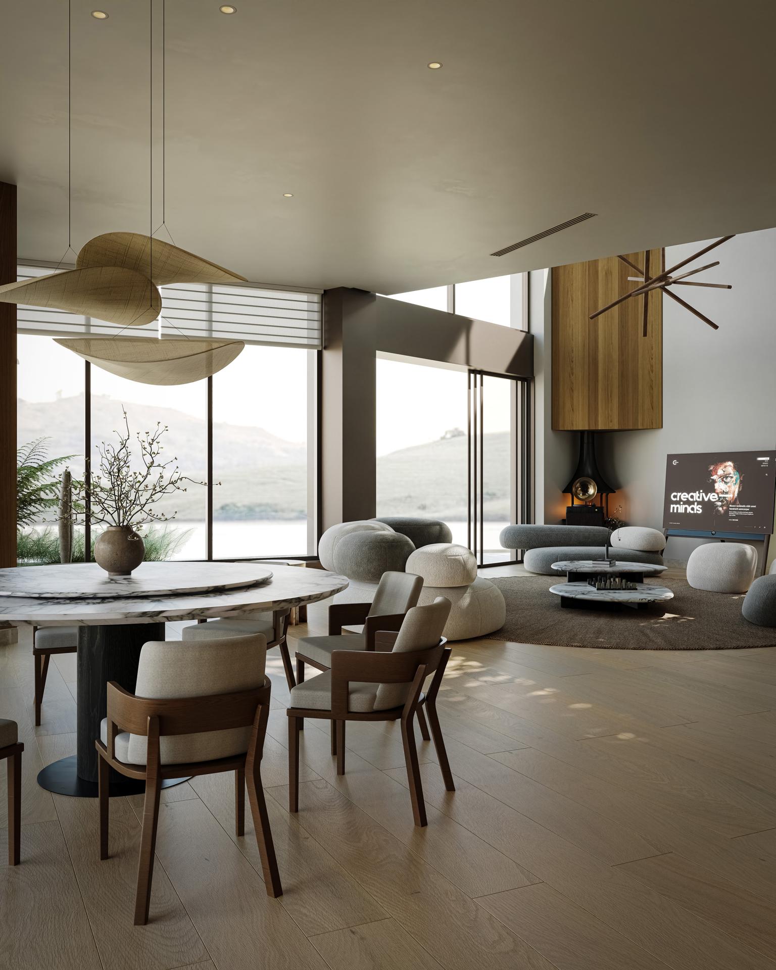 The 650-square-meter villa's key challenge was making the lake and mountain views central to daily life. A double-height living room and full-height glass walls blur indoor-outdoor boundaries. Consistent stone and wood materials strengthen spatial unity, immersing residents in the landscape.