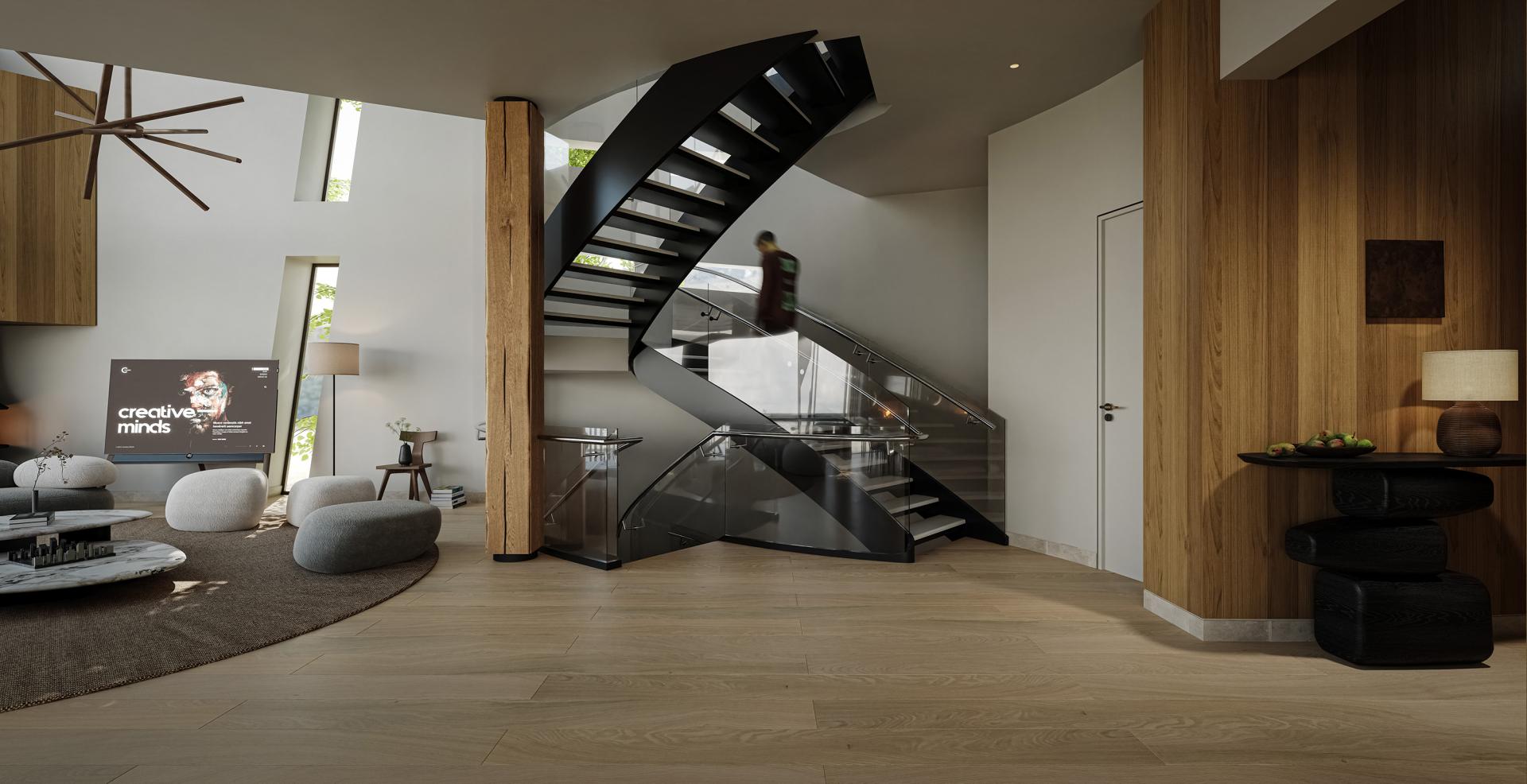 Materials like raw wood, natural stone, and clear glass were chosen for natural origin and durability, developing a patina over time. Spaces maximize views and circulation. Sustainability is achieved through passive design, maximizing daylight, and a water recycling system.