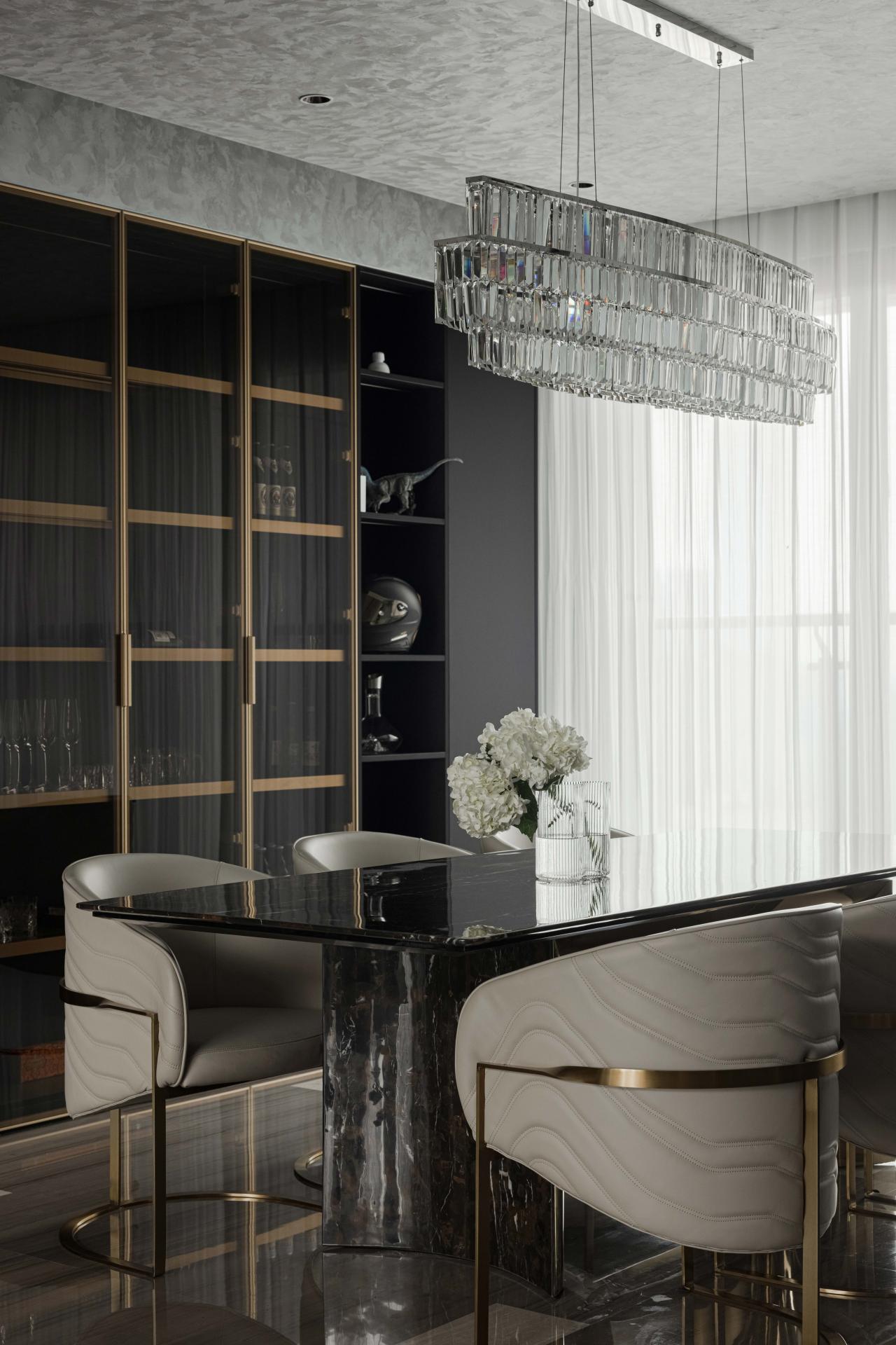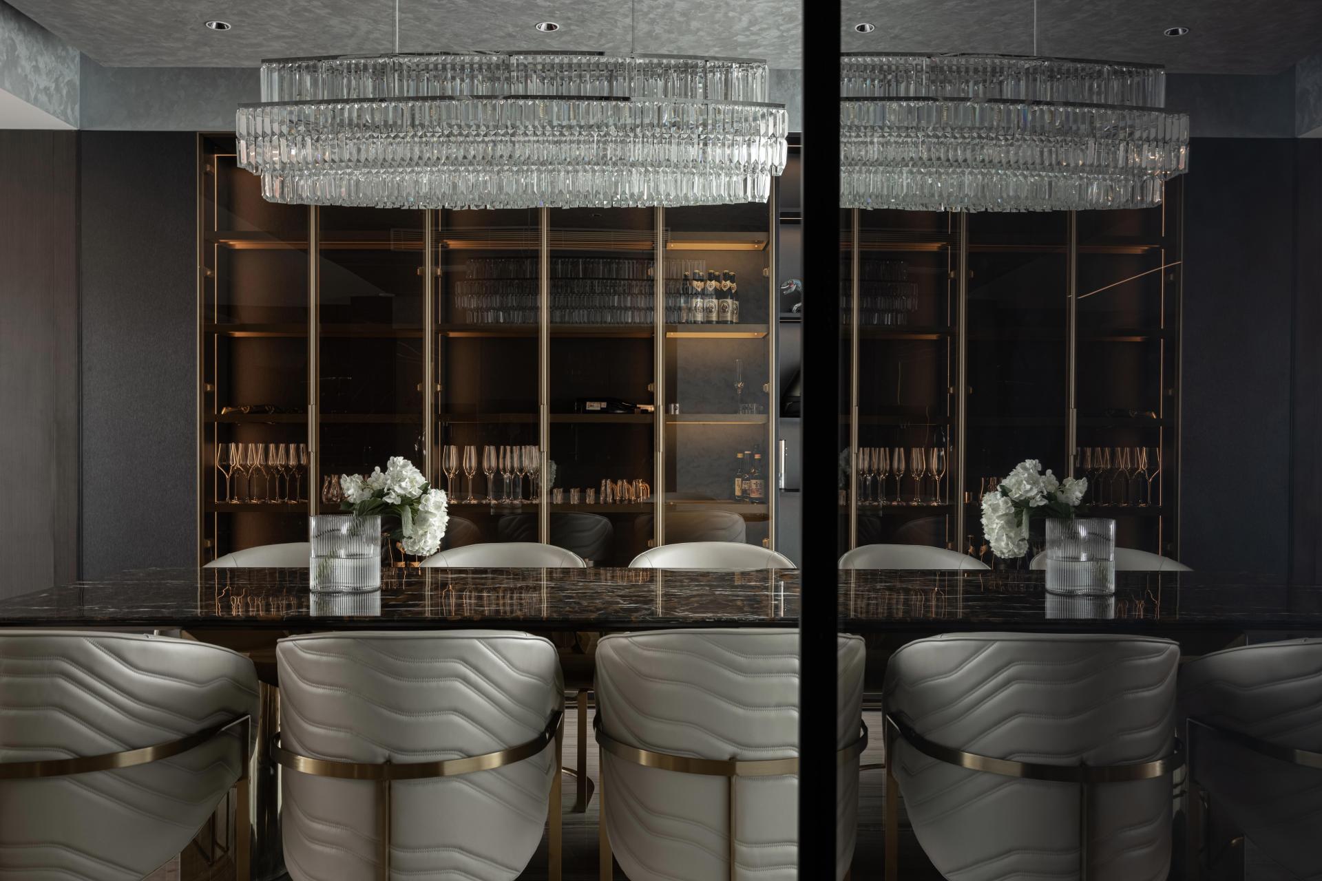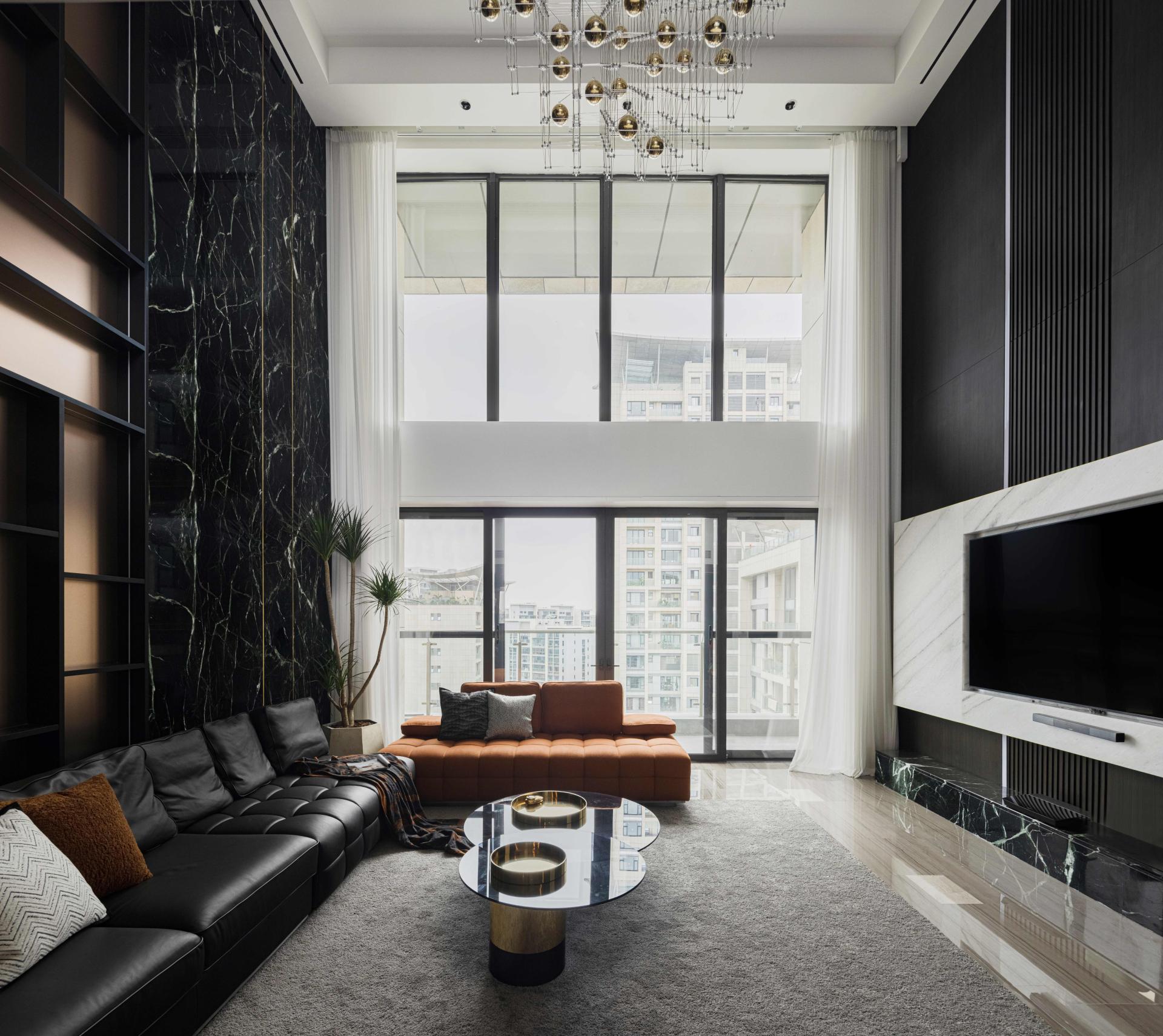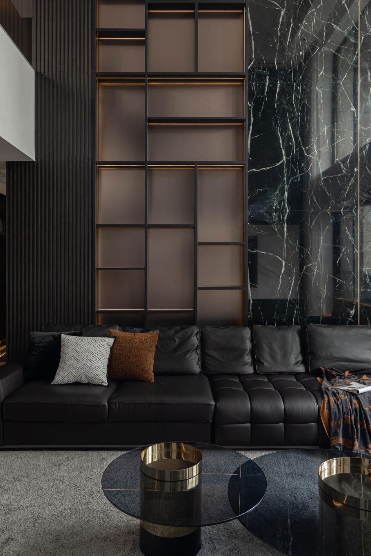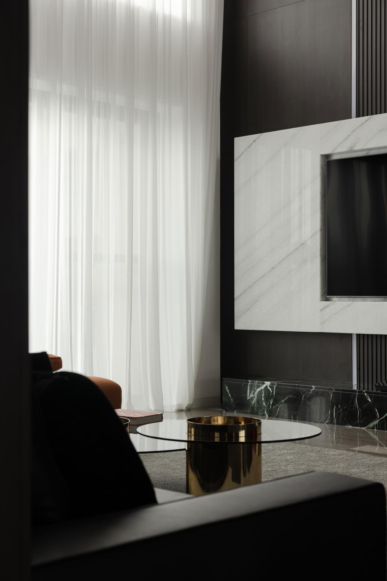 Color and material serve as the key carriers for conveying personality and taste in this project. To cater to the male homeowner’s preference for a dark aesthetic, the main color palette adopts deep brown and jet-black tones, laying a calm and restrained foundation for the space, with refined metallic elements as local accents to add the finishing touch. The metal not only appears in fluid and soft forms, breaking the heaviness of the dark color scheme, but also inadvertently defines the fashion-forward and sophisticated temperament of the space. Meanwhile, the integration of natural materials—whether warm wood veneers, rugged yet delicate natural stones, or soft textiles—establishes a delicate balance between coolness and warmth, modernity and nature, ultimately interpreting a new urban residential aesthetic that is both comfortable and highly textural.