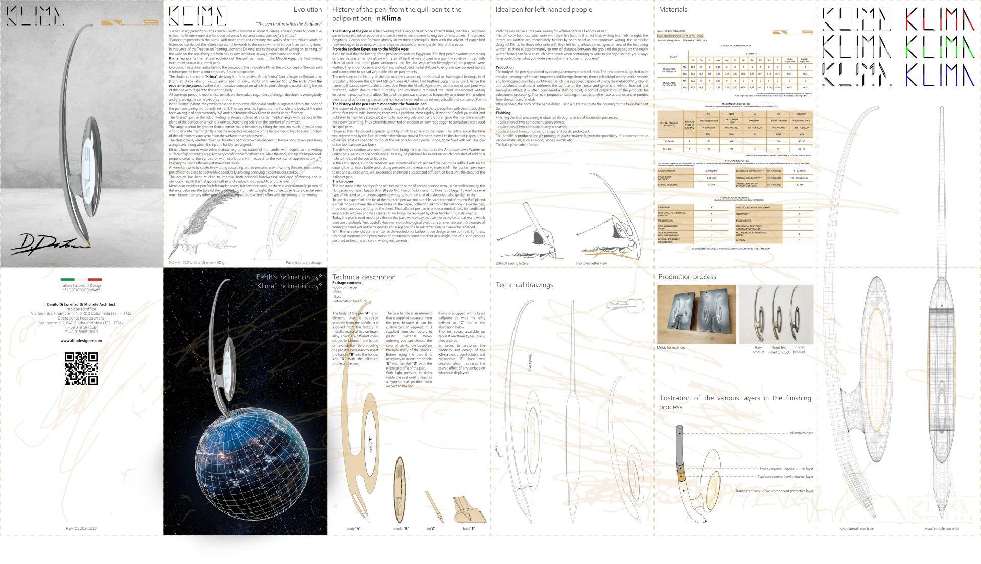 Evolution, this is the mantra behind the concept of the innovative Klima; the age-old concept of the quill pen is reinterpreted with a contemporary-future perspective. The choice of the name "Klima," derived from the Ancient Greek "clima" (ant. clìmate or clìmato) n. m. [from the Latin clima -ătis, Greek κλίμα -ματος (derived from κλίνω "to bend, to incline") "the inclination of the earth from the equator to the poles"], evokes the innovative concept underlying the pen's design: angling the tip of the pen with respect to the writing body.