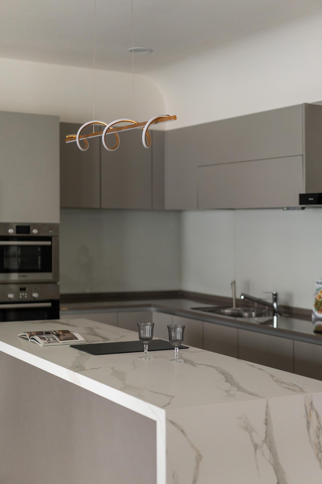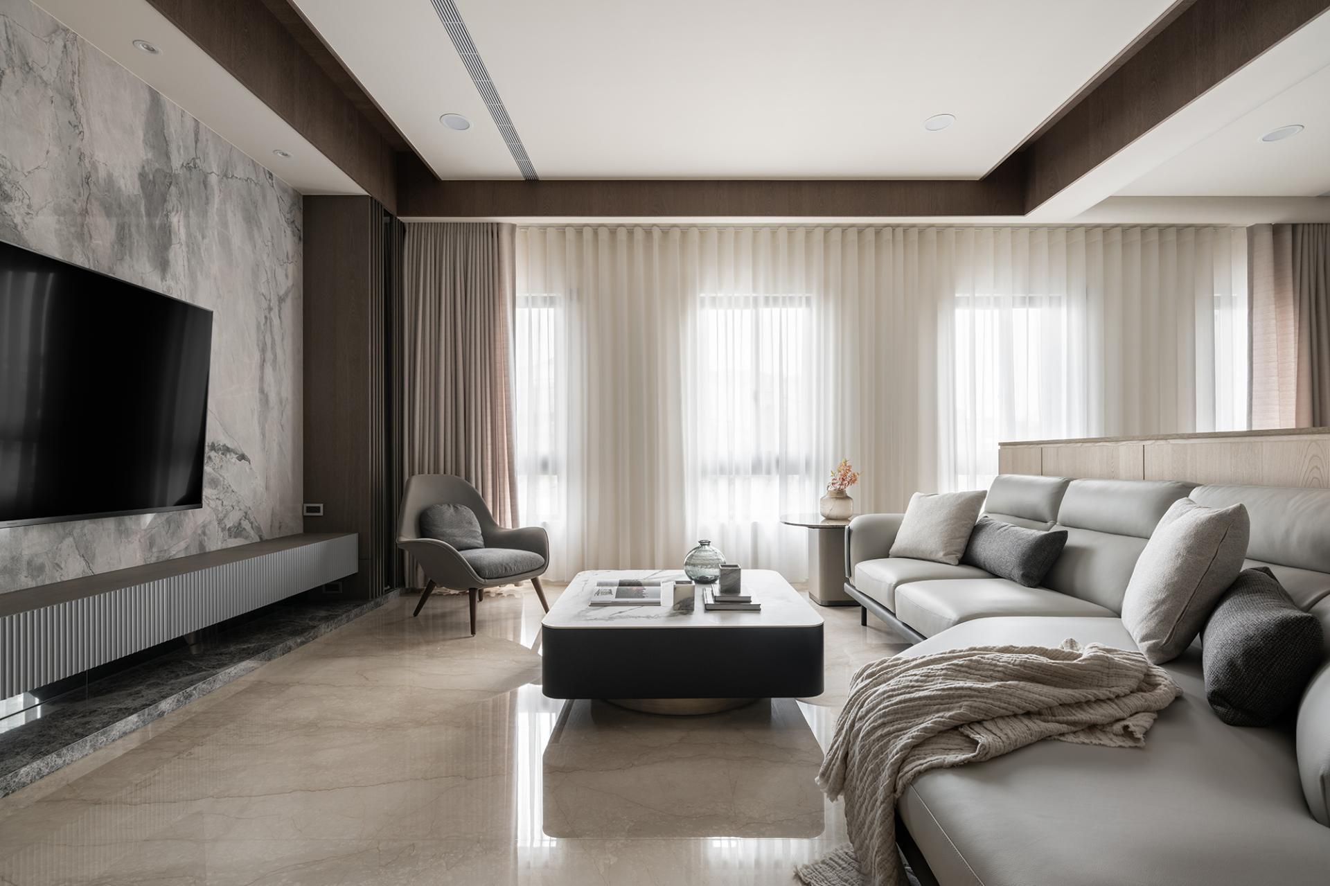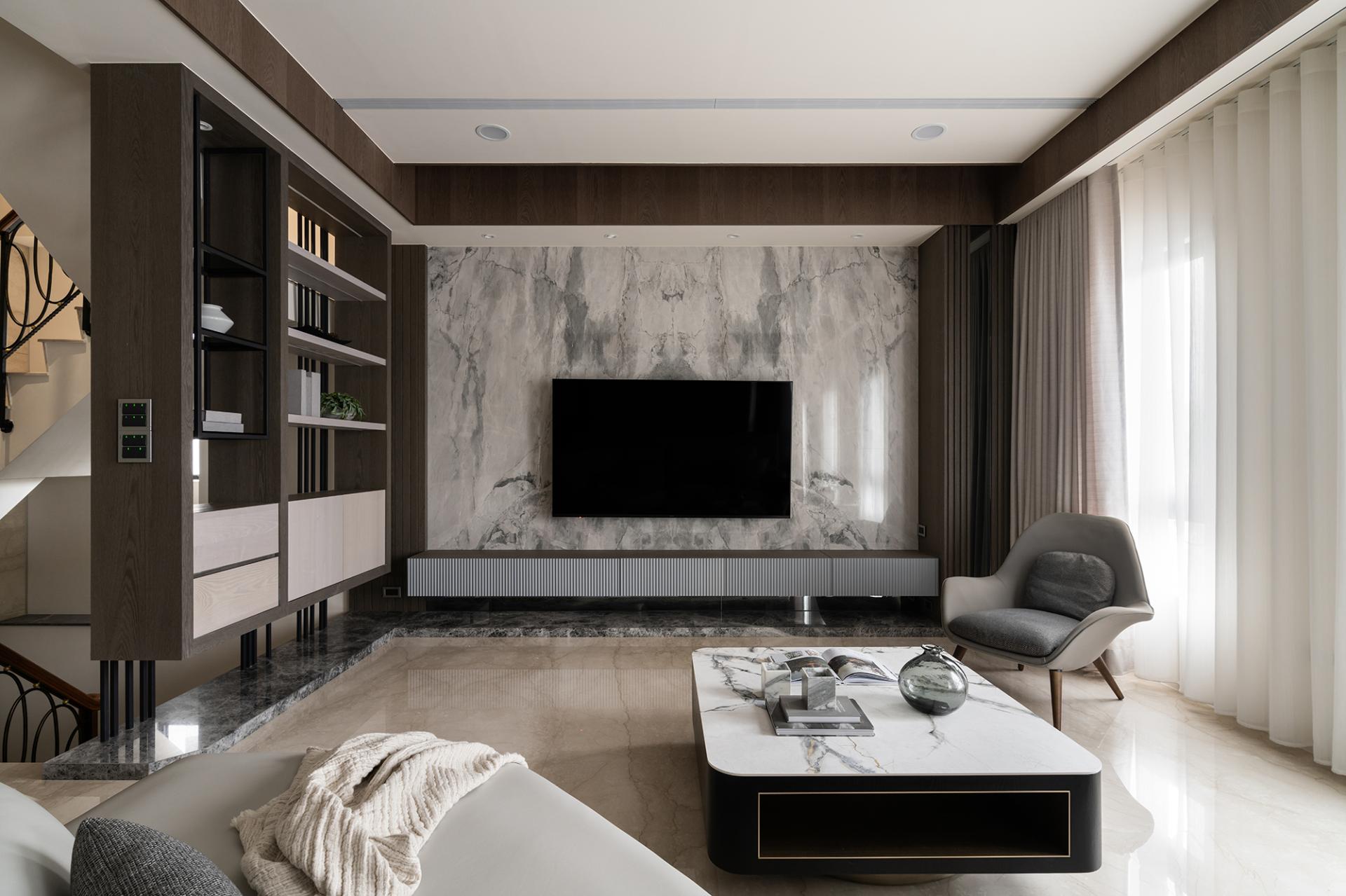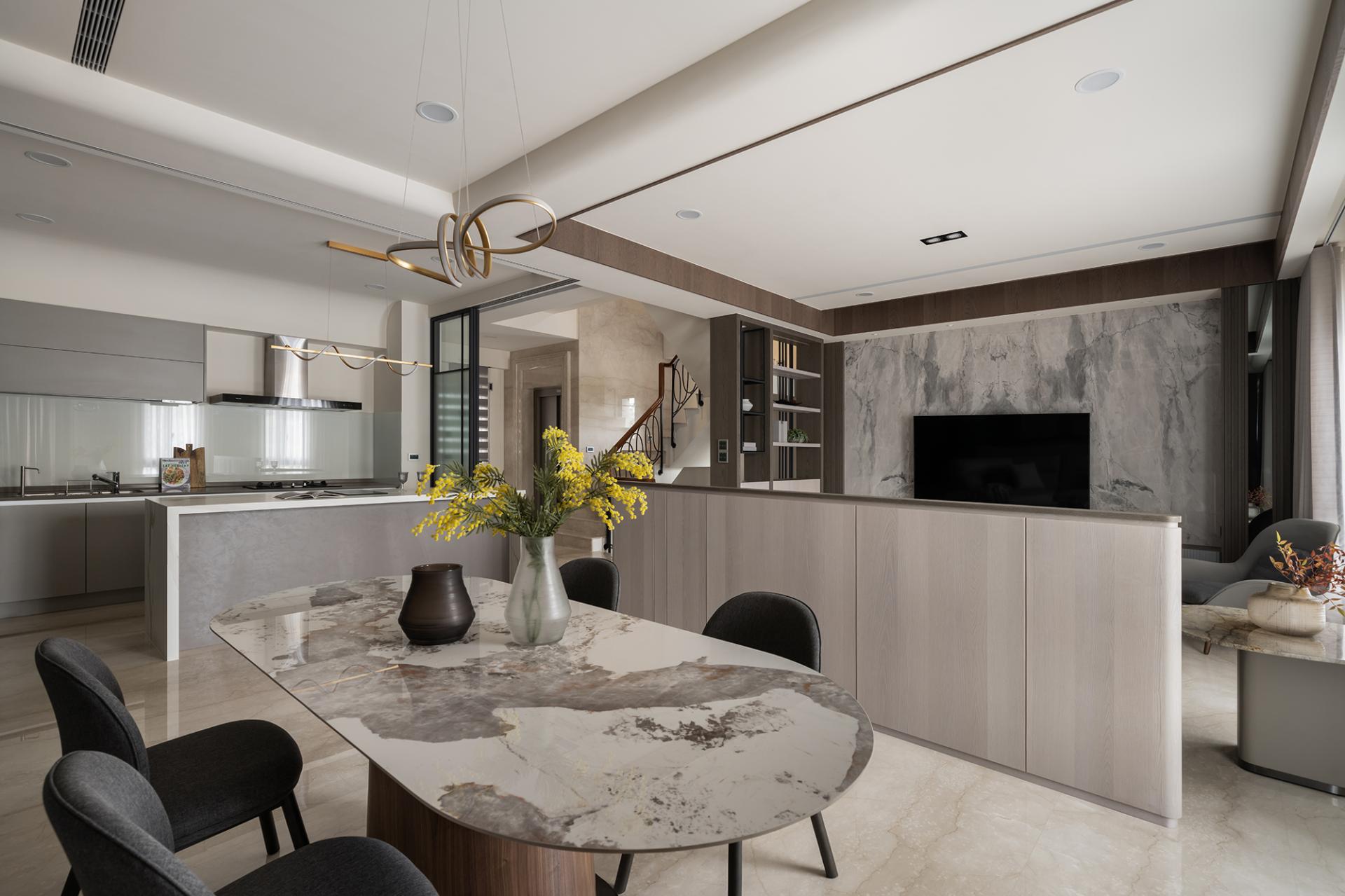 The interior space is thoughtfully designed to create a continuous axis that seamlessly links the living room, dining area, and kitchen, forming a cohesive public zone. In the living room, the ceiling showcases a striking recessed, U-shaped design that draws the eye upward. Dark wood veneer elegantly wraps around the perimeter, skillfully concealing linear lighting and air conditioning vents while simultaneously enhancing the spatial scale, providing a warm contrast to the rich beige stone flooring below. Adding a sophisticated touch, the feature wall behind the television is adorned with marble featuring a unique splashed ink effect, which serves as a stunning visual focal point. Below this captivating wall, a sleek gray, grille-style floating cabinet interacts with a bold black stone podium, together crafting a dynamic interplay of layered depth and textures.