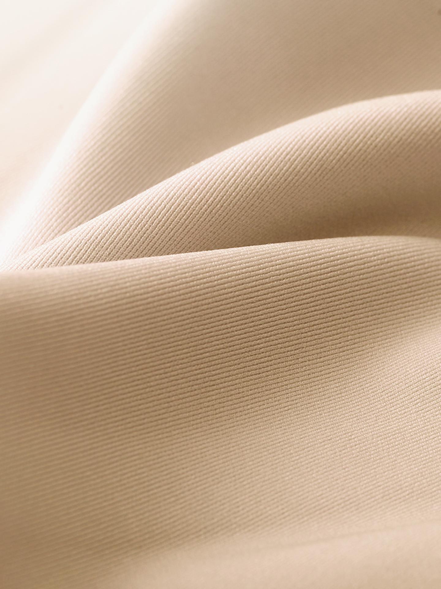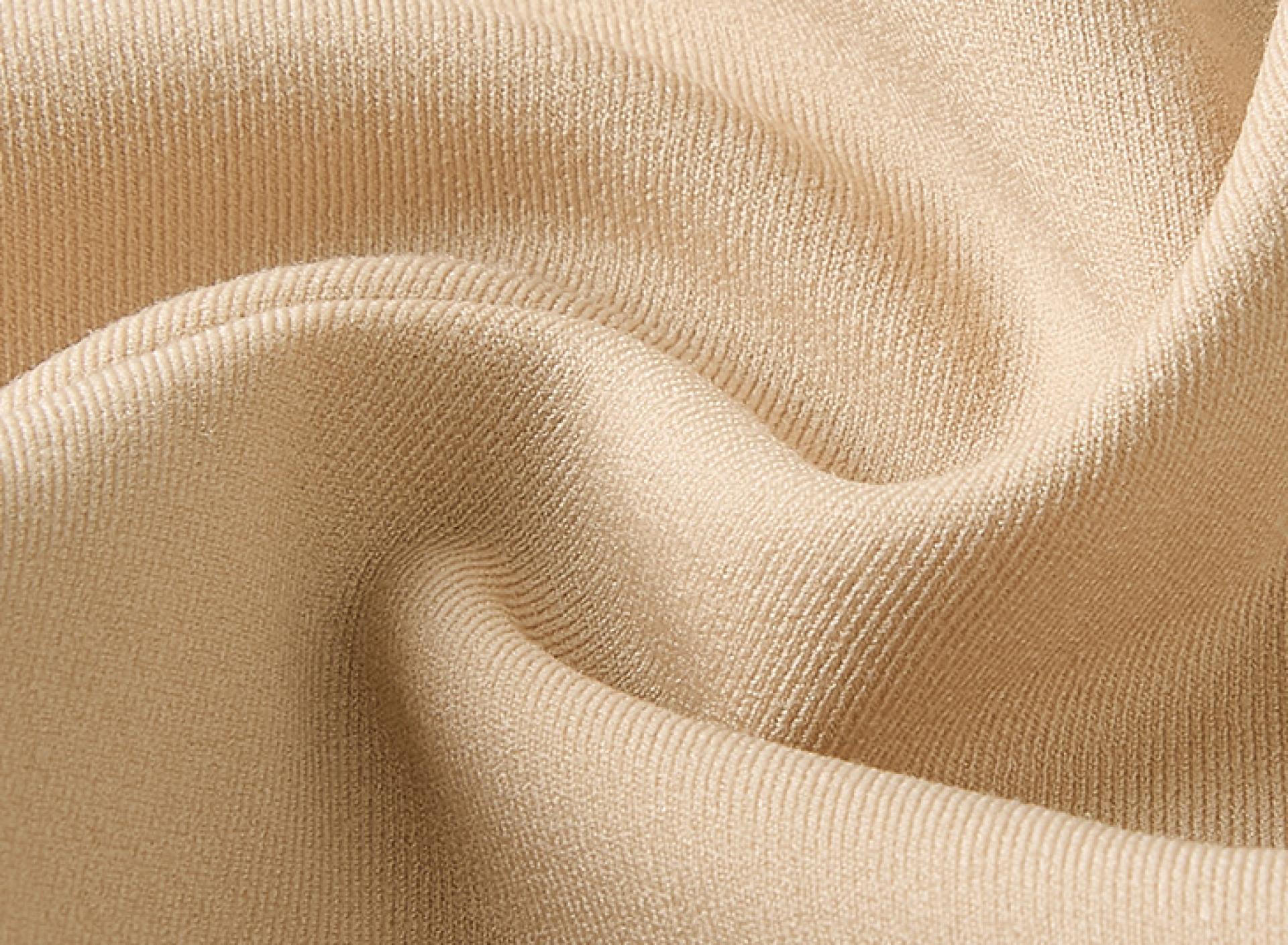 Aesthetically, the fabric employs “skin-glow” finishing technology, which imparts a subtle, understated satin sheen to a minimalist knit structure, elevating the overall sophistication. Its visually slimming effect stems from a multi-layered strategy: skin-tone-matching hues minimize segmentation to eliminate the sense of expansion; a directional soft glow guides the gaze vertically, elongating the silhouette; a completely smooth, texture-free surface prevents visual bulk at the source. This ingenious optical design naturally creates a subtly minimized bust appearance—offering effortless elegance.