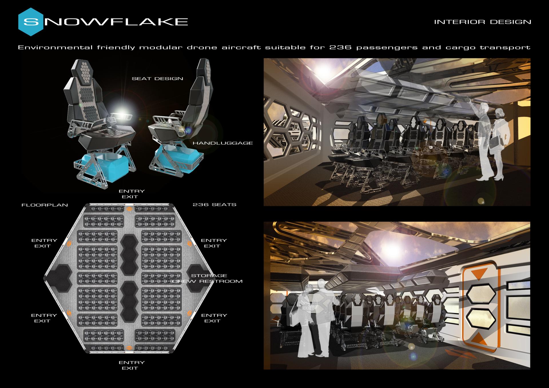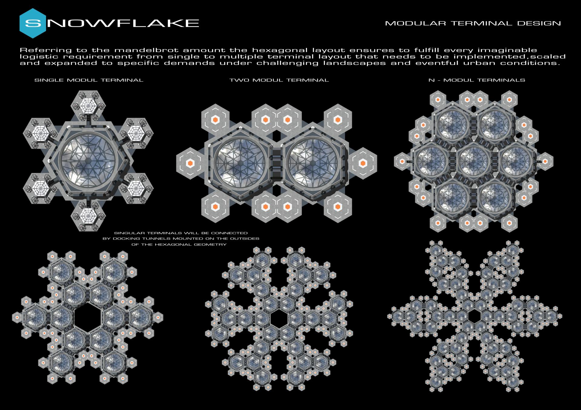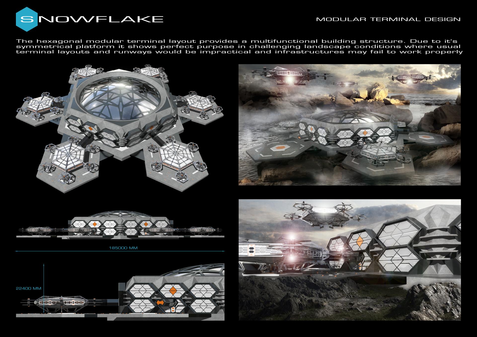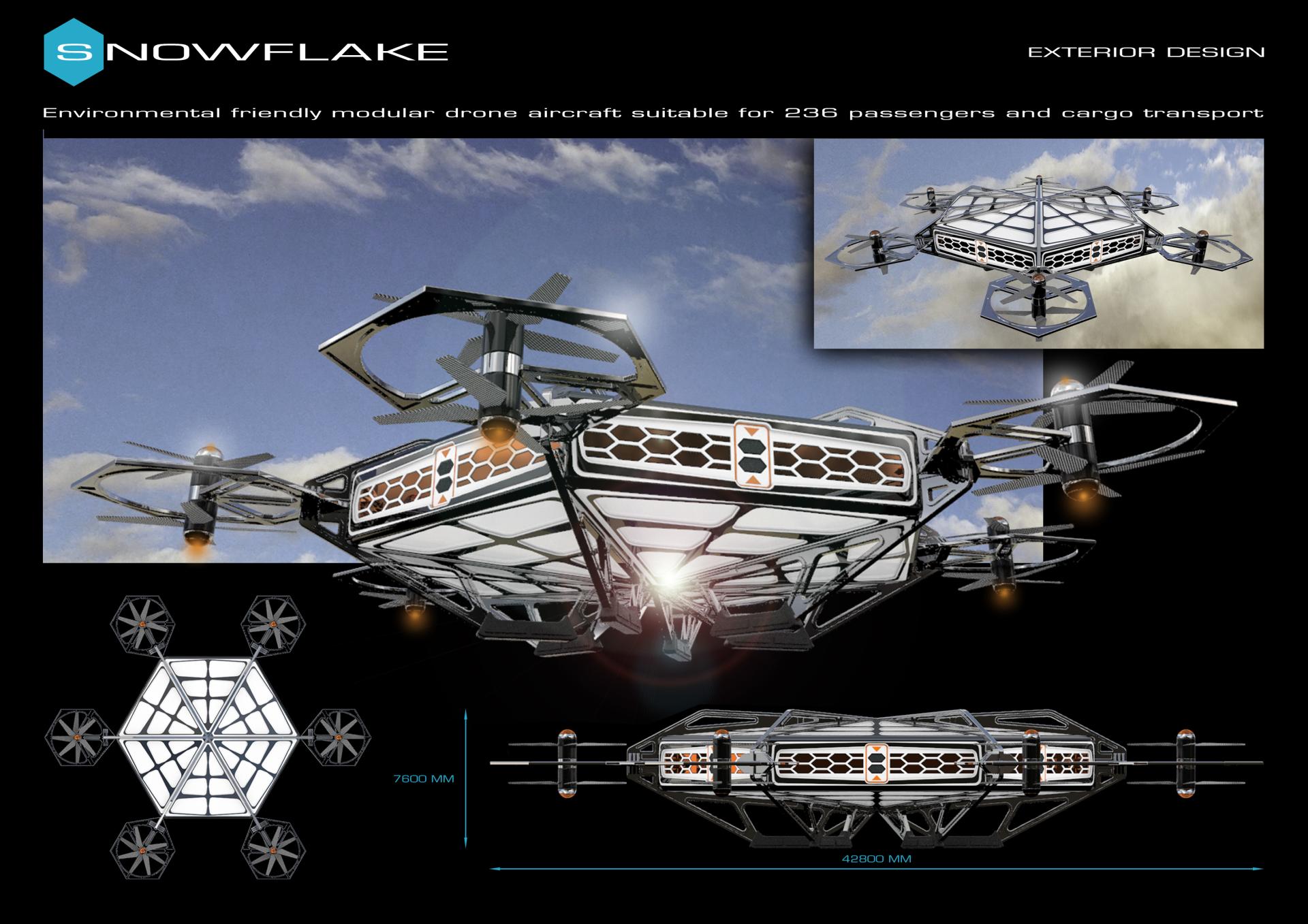 Snowflake is a groundbraking designconcept for an environmental friendly autonomous advanced passenger transportation system. The technology is based on a drone flyer using a double propeller vertical take-off and landing principle which is powered by hydrogen fuel cell units. The vehicle expands the use of a mere aerotaxi and leads into spheres of professional aviation systems that operates beyond urban mobility. Due to its symmetrical modular layout of a hexagonal snowflake like design it can be used for carrying passengers as well as cargo transport providing estimated space for up to 236 passengers. Lightweight recyclable materials like carbon and alumuminum in combination with 3D printed and upcycled materials are recommended for construction. The flying unit could easily interact with airport buildings that use a similar hexagonal modular layout as terminal buildings and therefore optimizes workflow of departure. By using smart vertical take-off and landing abilities there are no needs for runways anymore. Landing platforms which fit to the overalldimensions of the vehicle are sufficient for operations. The improvement of facility structures also reduces environmental impact caused by large sealed concrete surfaces. In challenging landscapes and terrains like mountains,seaside,deserts and disaster areas most transportation solutions may be costly to plan and/or impractical to use. The snowflake concept can offer new chances here.