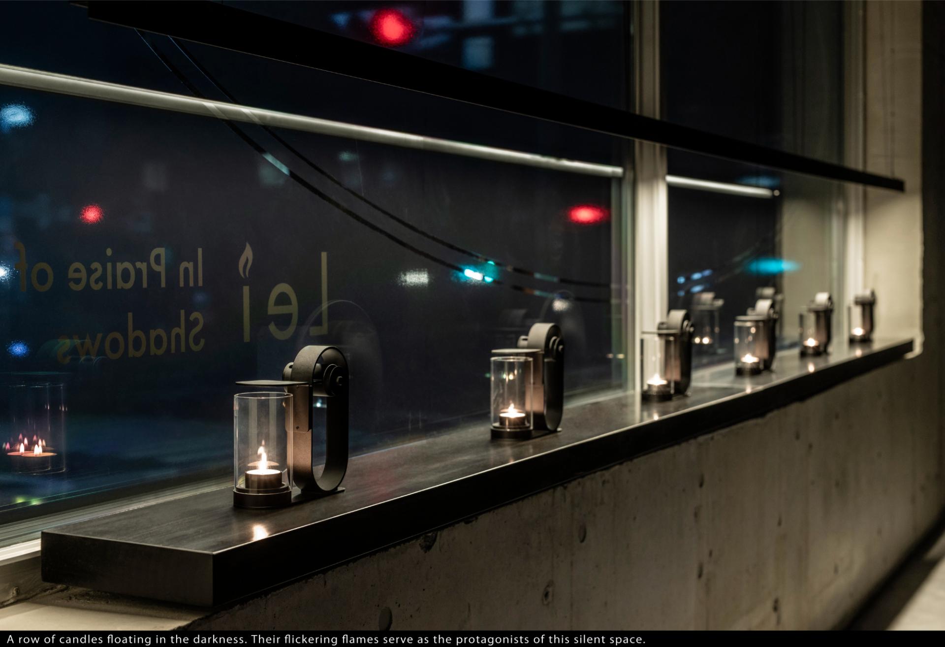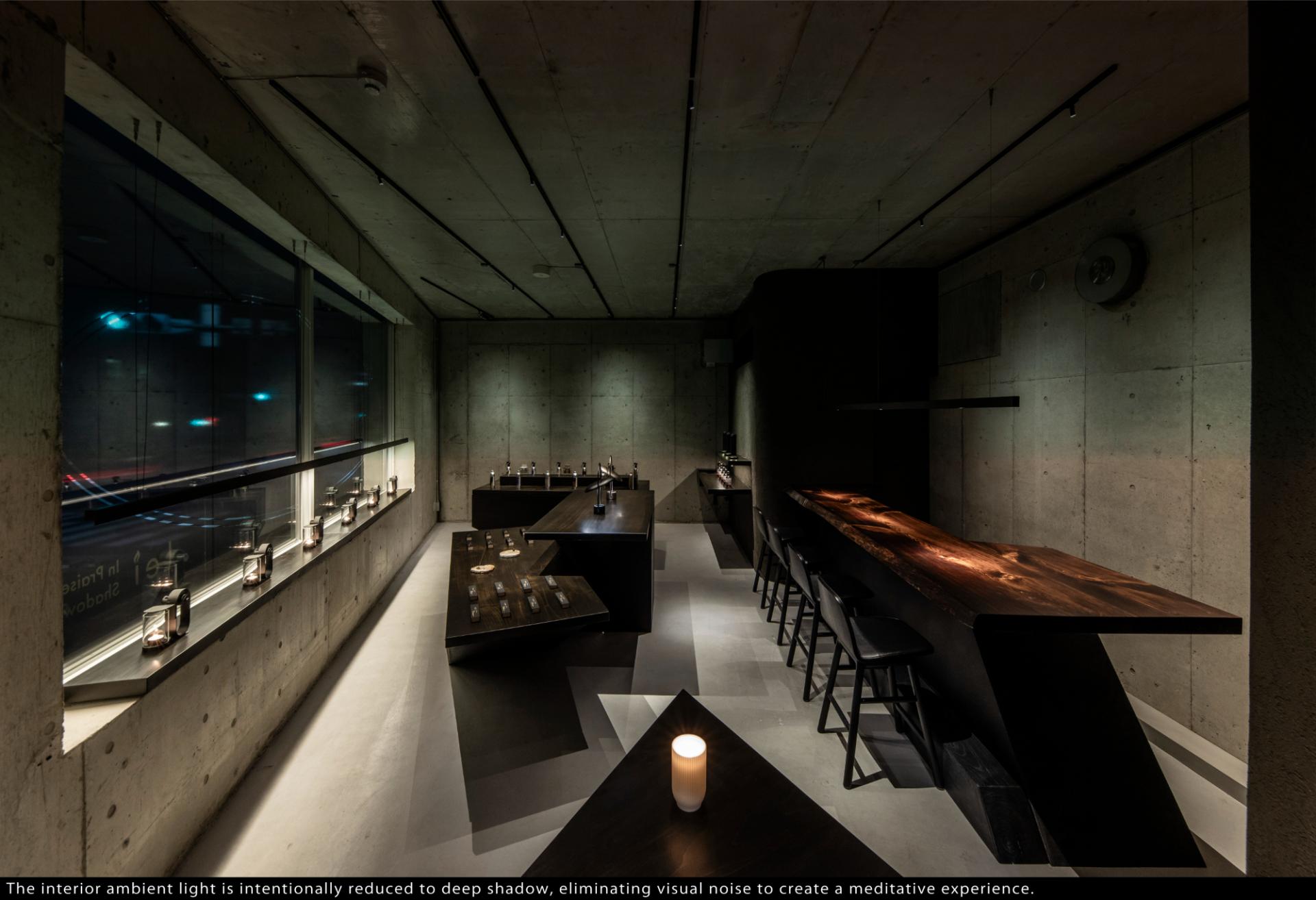 The experience begins at the facade, where the glass is covered by a dark film featuring a cutout of Lei’s signature "0" (circle). Through this aperture, only the space beneath the bar light and the faint flicker of candles are revealed, quietly expressing the world of shadows to the outside.