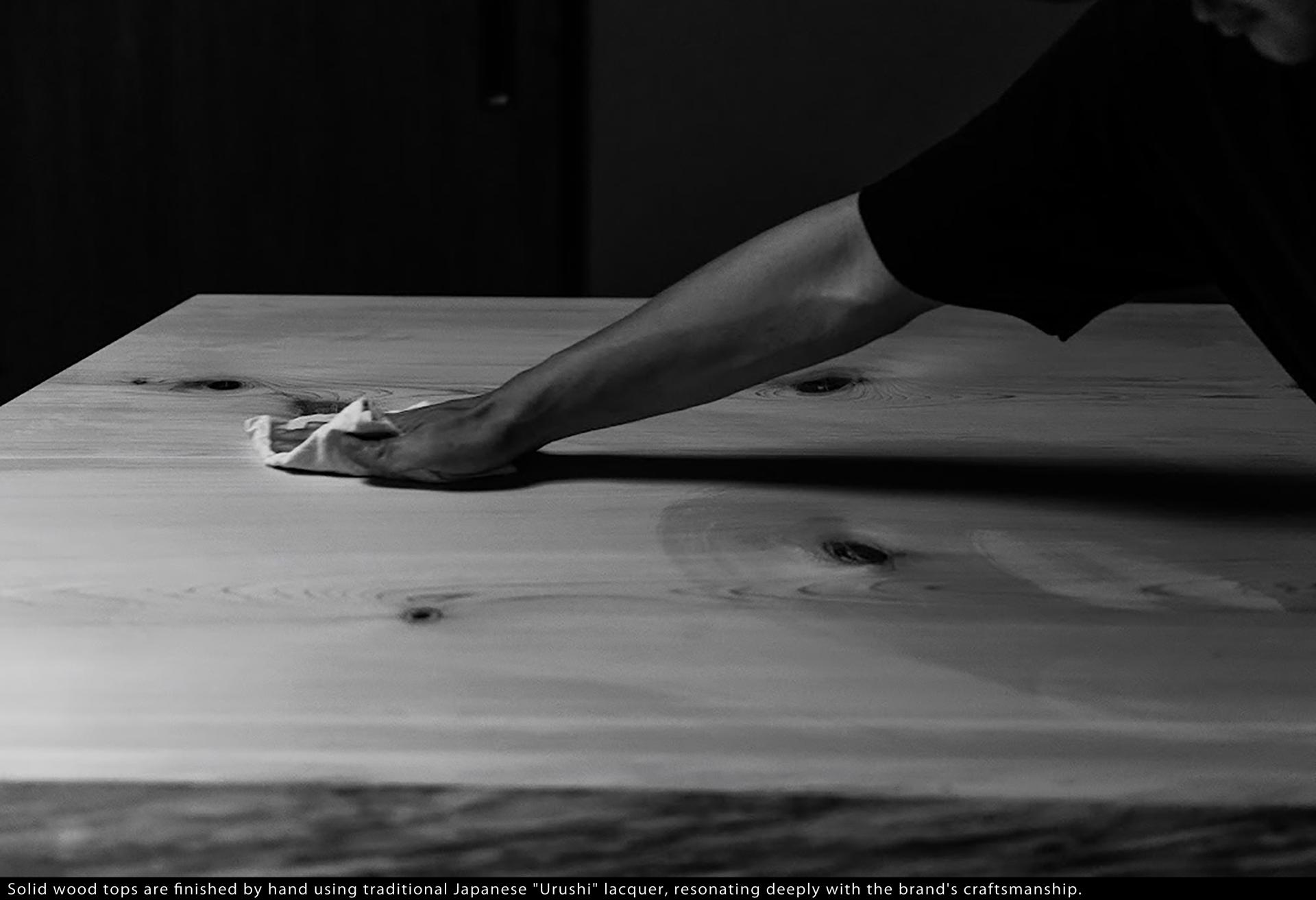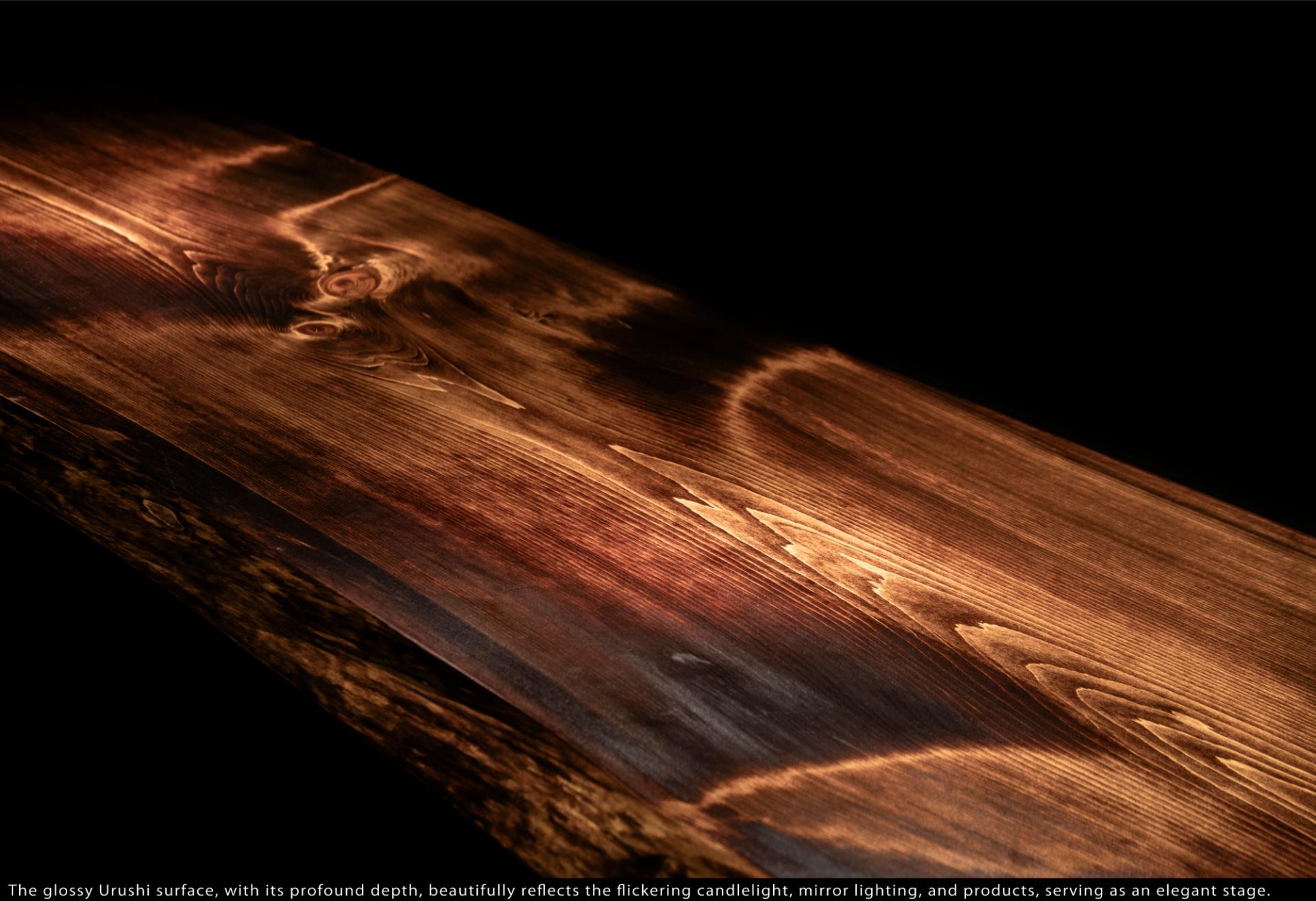 Inside, materials are selected with profound care to resonate with Lei's craftsmanship. The display tops utilize solid Japanese Cypress (Hinoki) and Ginkgo (Icho), finished by hand using traditional Japanese "Urushi" lacquer to create deep, glossy surfaces that beautifully reflect the flickering candlelight and mirror lighting.