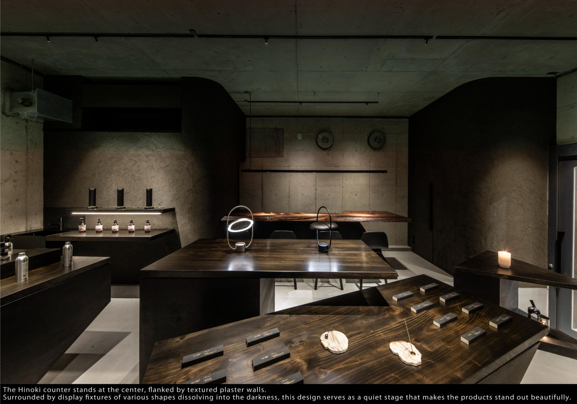 For the central counter, Hinoki was selected. Historically revered in sacred architecture and known for its calming fragrance, its presence subtly harmonizes with the store's purpose of handling scents, grounding the space in tradition.
