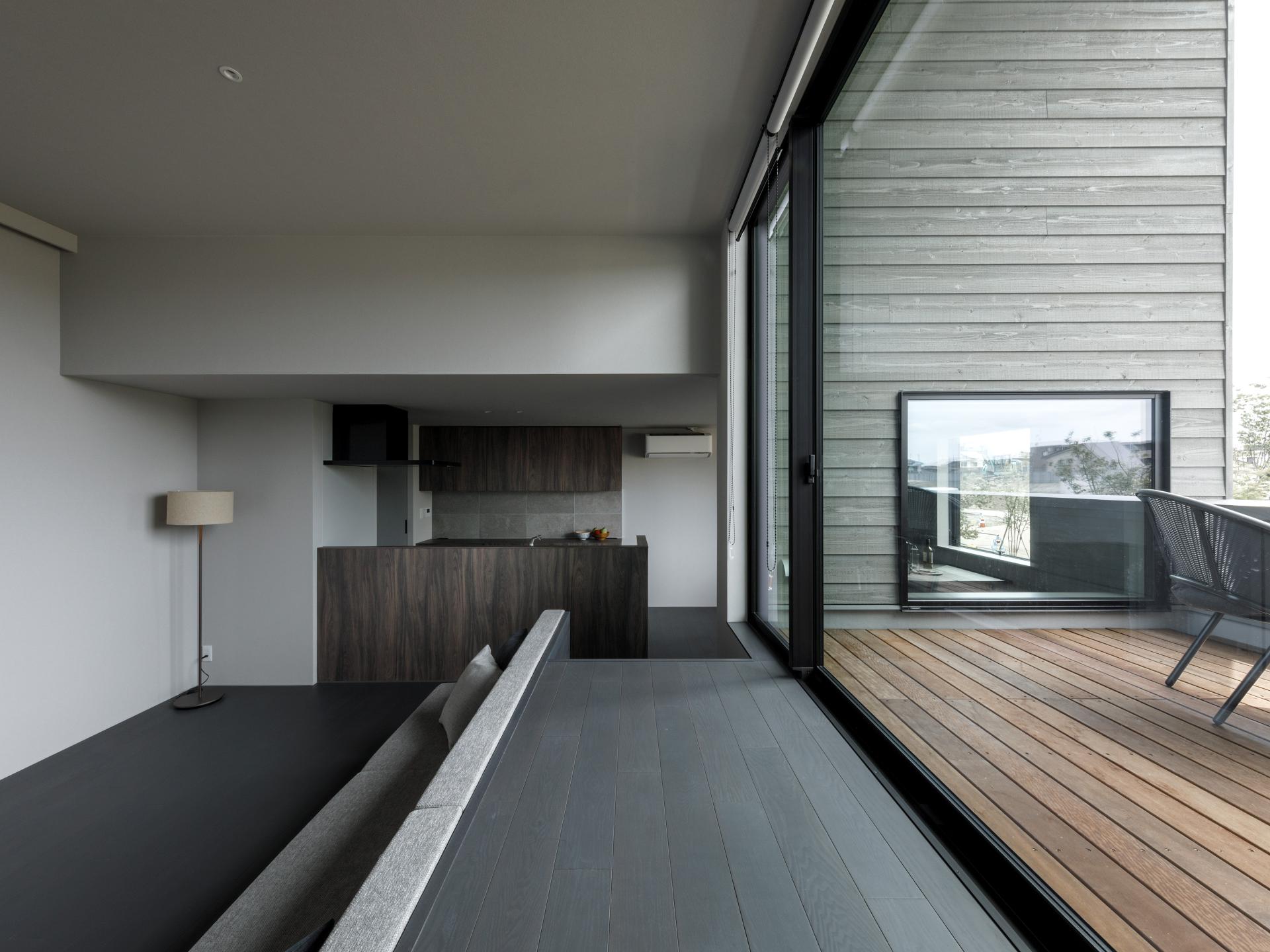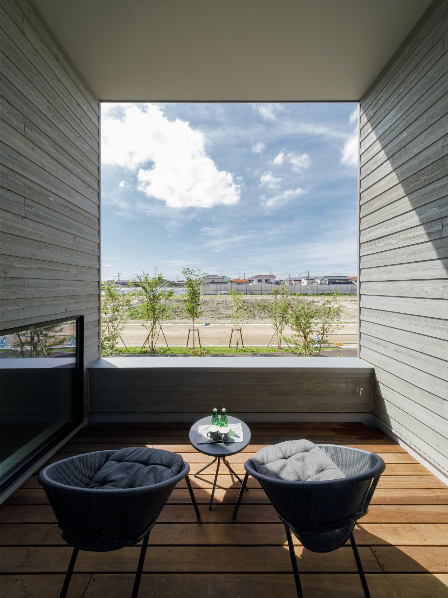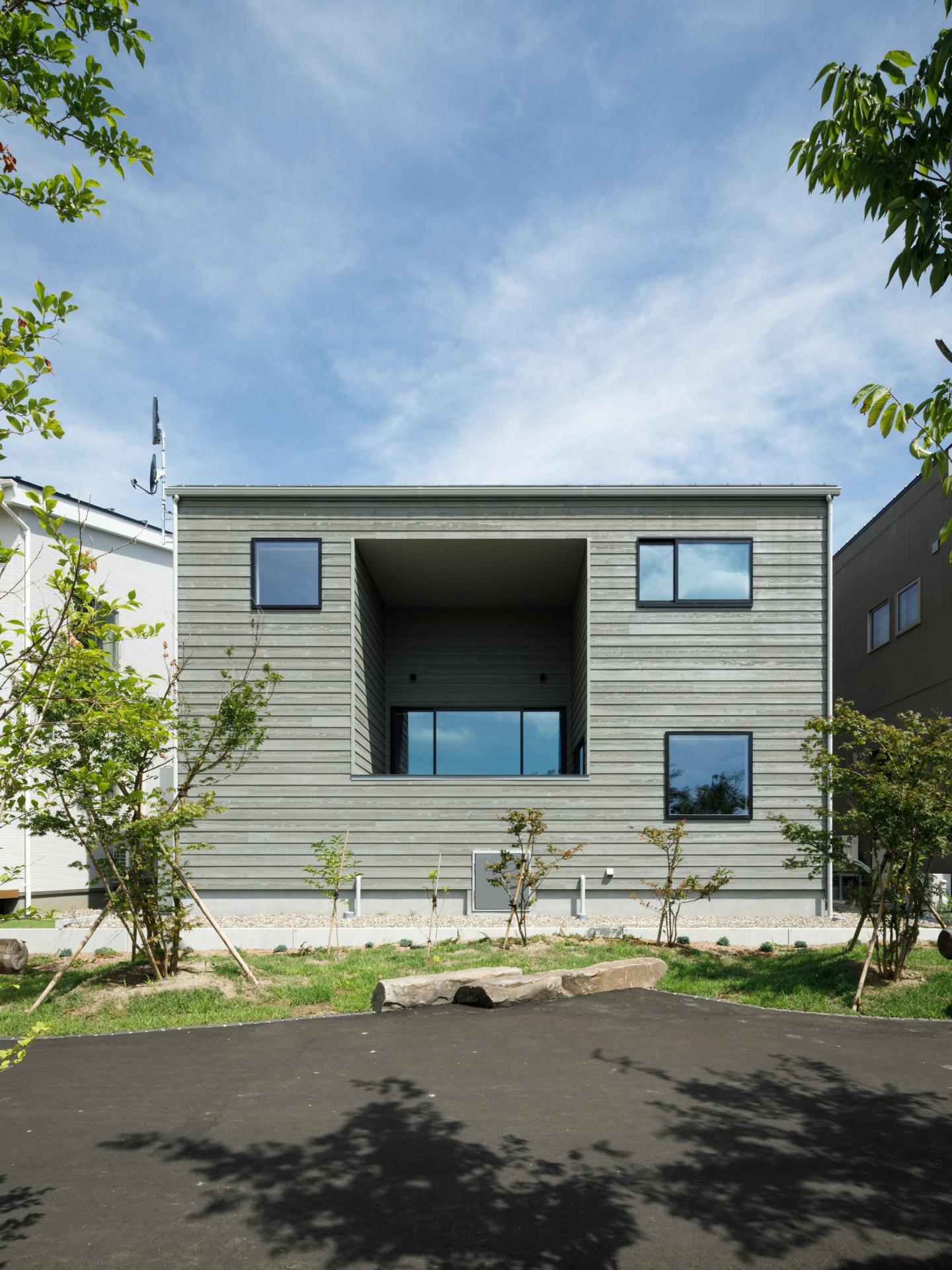 The project site is a new subdivision located on the outskirts of Niigata City. In Japanese residential areas, houses of similar size are built on evenly divided plots of land. In many homes, residents keep their curtains closed to prevent crime and ensure privacy. Because the existing homes use new building materials, they have a monotonous, uniform streetscape. We wanted to change this uniform lifestyle and streetscape. The layout of this house is designed to create a comfortable distance from the street, achieving a design that strikes a contradictory balance between privacy and openness. To achieve this, we created an outdoor terrace in the center of the building. This terrace is 80cm higher than the interior floor and has been named the "skip terrace." The design is just the right height, so the interior is not visible from the road or people passing by. The skip terrace provides privacy from the outside, giving the interior space a sense of security. From inside, all you can see are the trees lining the street and the sky. Residents can feel the presence of nature even when indoors. In new residential areas, new building materials are often used for exterior walls, resulting in uniform, unchanging streetscapes. This house makes use of many domestic materials and was built using traditional wooden construction methods. Older Japanese houses often used wood for their exterior walls. The exterior walls of this house are painted silver-gray to give the appearance of aging. Unlike new building materials, wooden exterior walls develop more patina over time, improving their texture. The large openings created by the skip terrace not only filter sunlight but also add a sense of openness and variety to the streetscape. The design is contemporary, while keeping in mind the look of old Japanese towns. This wooden house blends in with the town and changes the uniform streetscape.