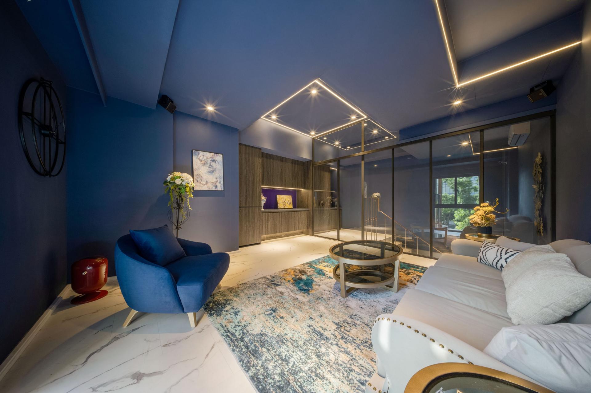 The walls on the ground floor are finished with a blend of cement paint and fine sand, creating a raw, textured surface that exudes rugged visual tension. The second and third floors each adopt distinct paint tones to differentiate their atmospheres and spatial hierarchies. The stairway is adorned with marble-patterned vinyl flooring, balancing refined visual language with durability and practicality. Together, the material palette strikes a poised equilibrium between futuristic sleekness and natural warmth.