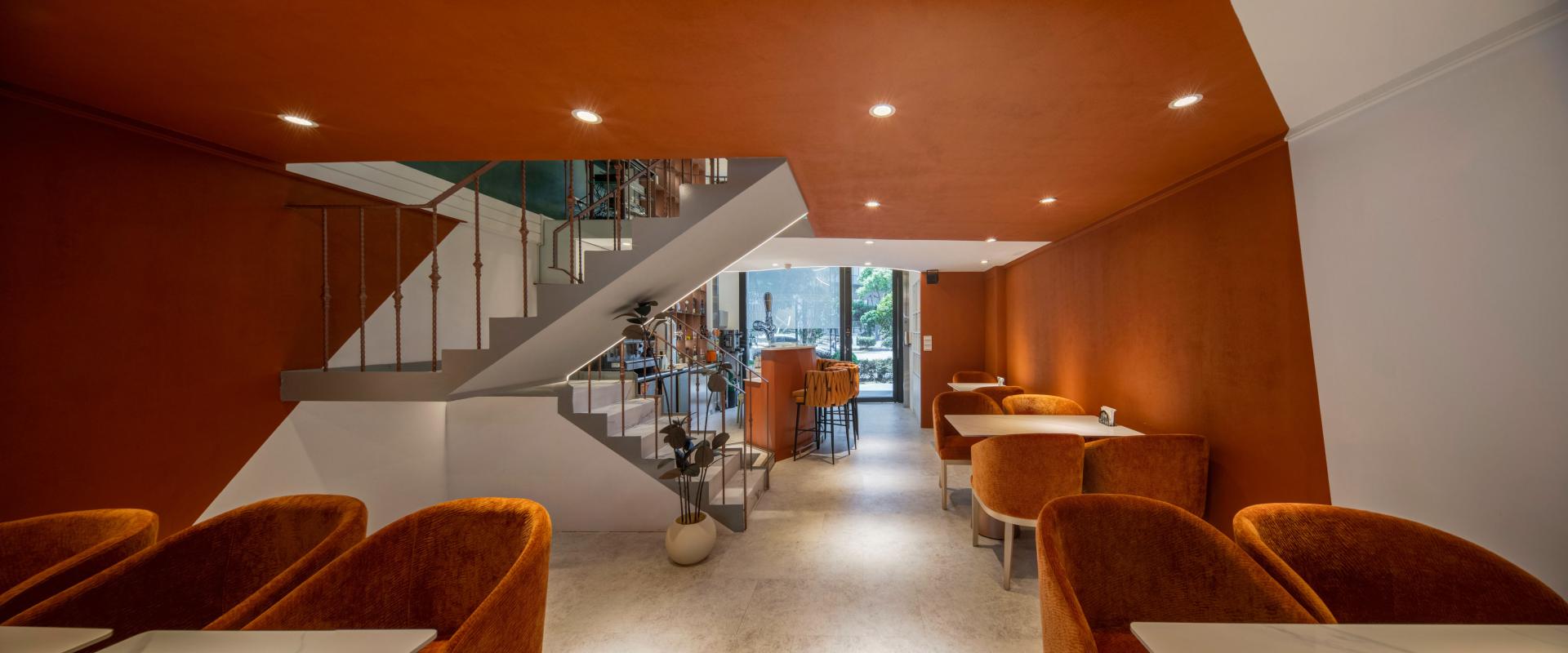 The mezzanine floor, supported by a steel-frame structure, adopts an S-shaped form that echoes the curve of the bar below, breaking away from the rigidity of conventional rectangular layouts. This fluid geometry softens the visual field, enhances vertical flow, and infuses the interior with a sense of lightness and continuity, allowing guests to feel the organic extension and openness that define the space’s rhythm.