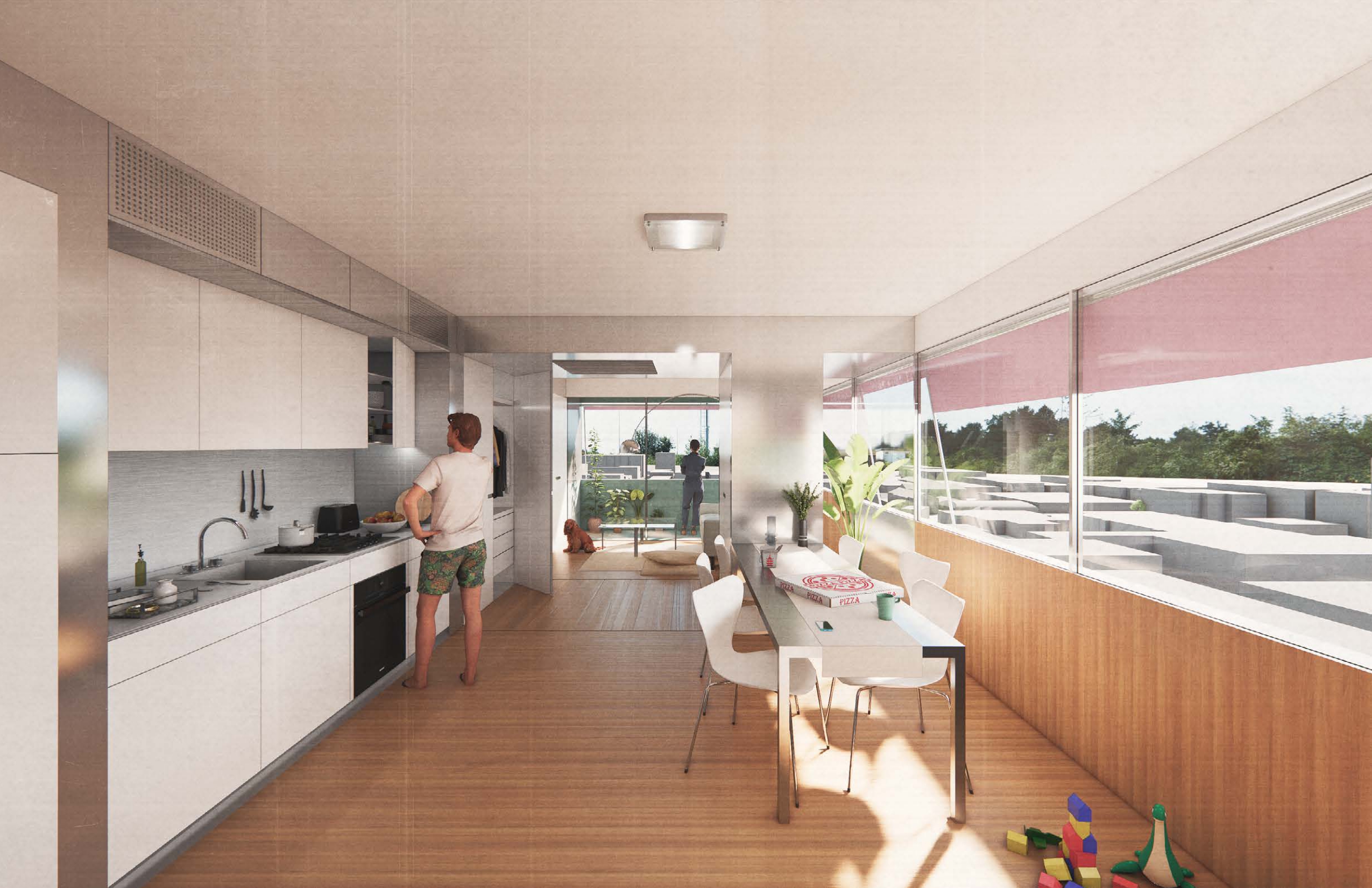 This proposal envisions housing not as a fixed product, but as a resilient framework — a scaffold that adapts to evolving ways of living. The design separates fixed infrastructure from adaptable living spaces. Kitchens, bathrooms, storage, and closets are consolidated into stacked cross-shaped service volumes. These are not mere amenities, but organs — fundamental to dwelling. These shared cores carry utilities, structure, and fire-rated assemblies, forming the building’s durable backbone — a place to wash, a place to cook, and a place to store. Around them, dwelling spaces remain open, flexible, and easily reconfigurable.