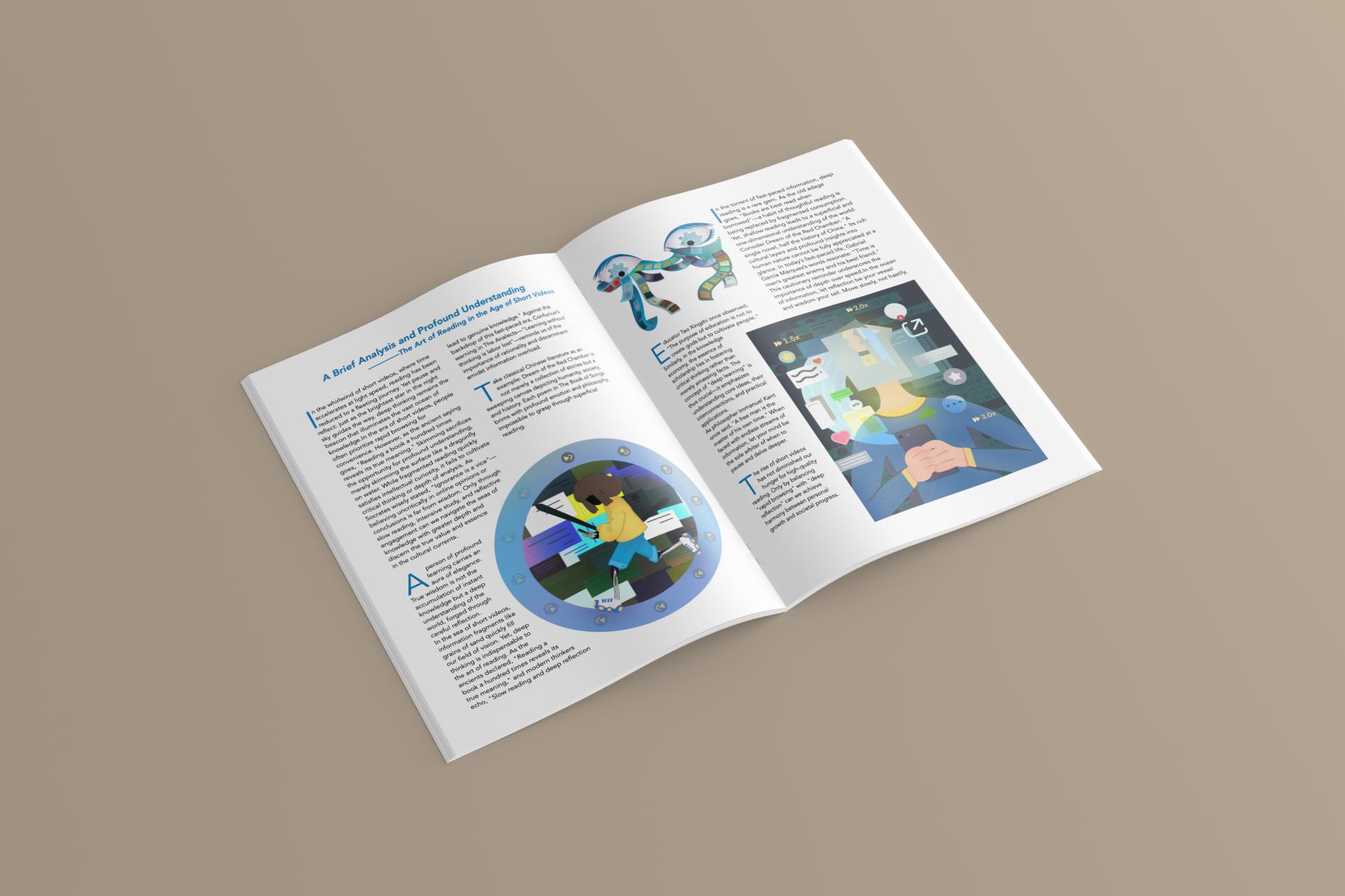 Rather than depicting reading in a literal manner, the illustrations translate abstract conditions—distraction, acceleration, immersion—into symbolic visual forms. Shifts in density, scale, and compositional balance guide viewers through different states of awareness, creating a gradual movement from visual noise to contemplative clarity. The project ultimately positions illustration as a tool for social observation, capturing the tension between fleeting consumption and meaningful engagement in the digital era.