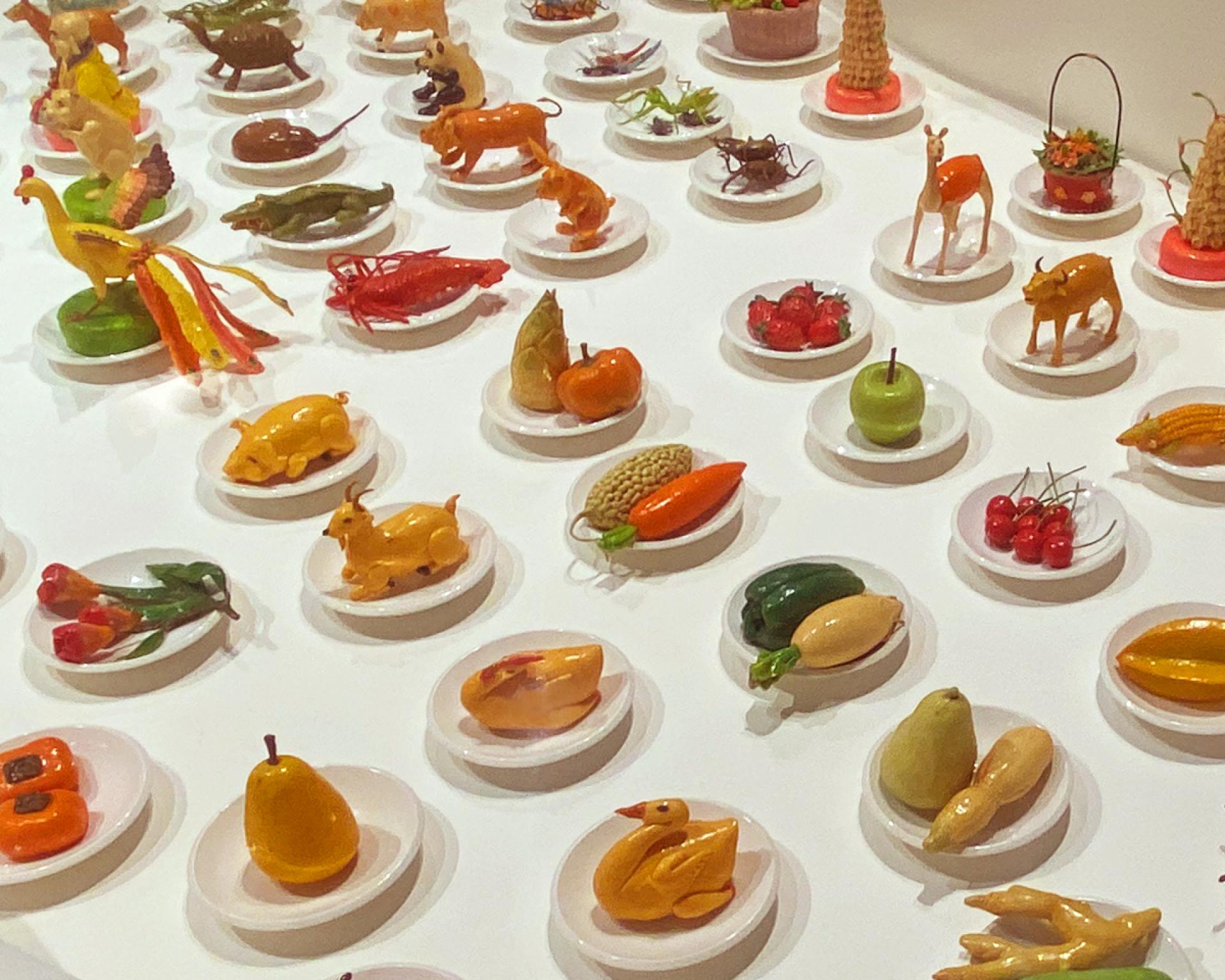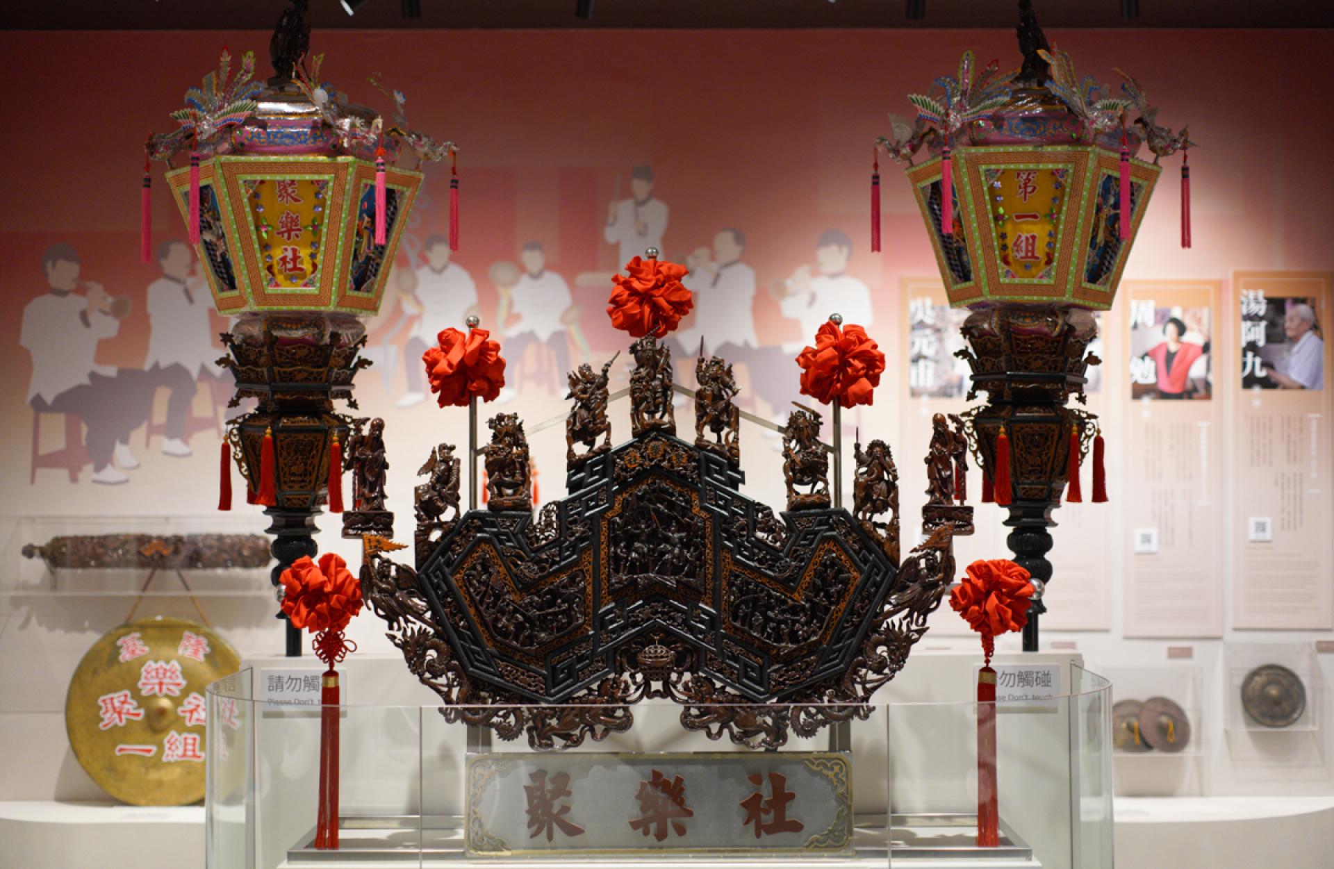 The collection features a diverse range of artifacts, including ritual implements and talismans. At the heart of the display is a series of exquisite and vibrantly colored folk arts: intricate pasted-paper sculptures (hú-zhǐ), ornate floating lantern houses (shuǐ-dēng), and dough-based symbolic food offerings (kàn-shēng) crafted for wandering spirits. Also on display is a sacred Dou-deng (Celestial Bucket Lantern) representing the respective clan association, alongside ceremonial banners and instruments from Beiguan ensembles, the primary music for the Festival’s traditional troupes.