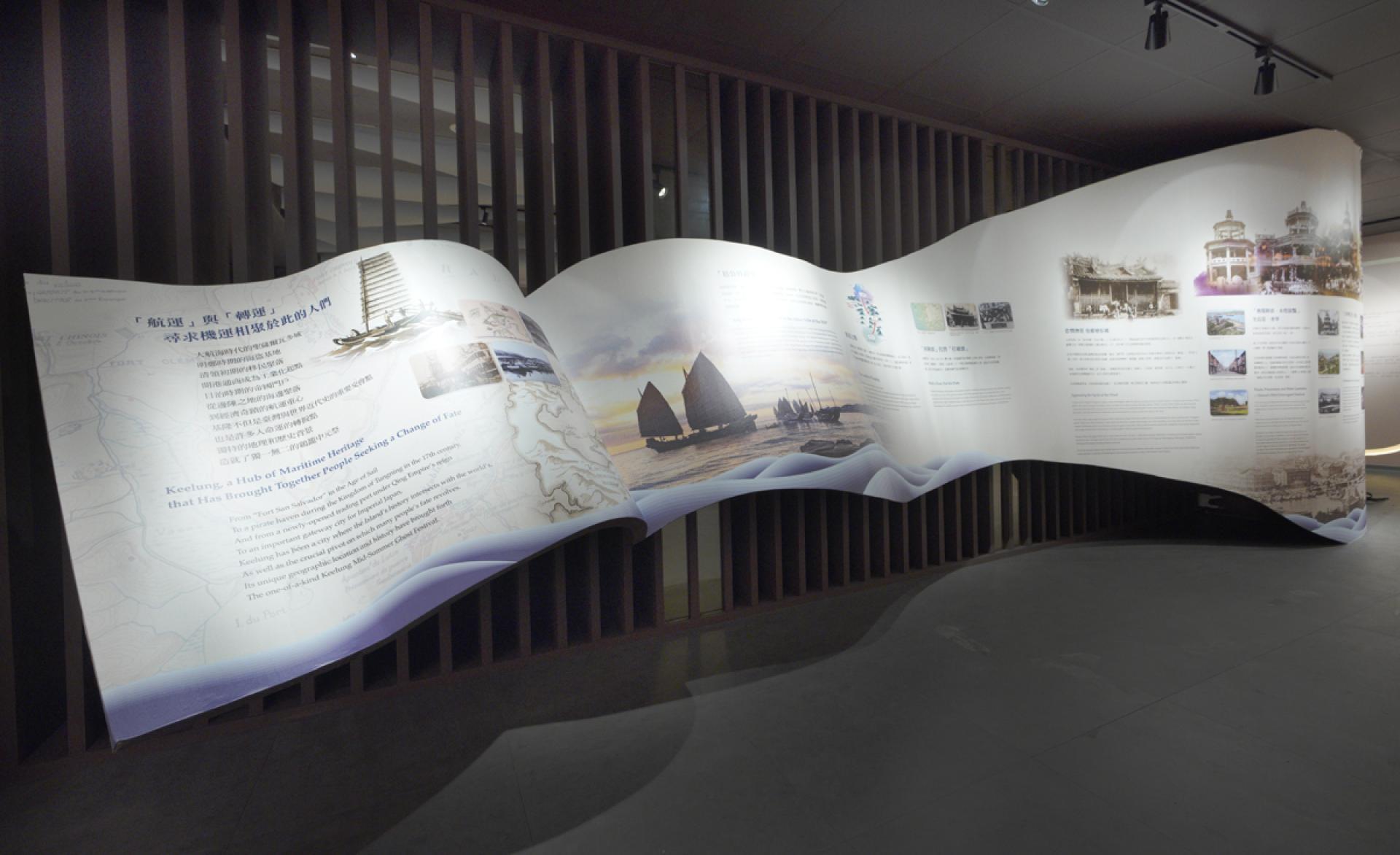 The exhibition design integrates Keelung’s unique geography—nestled between the mountains and the sea—with imagery inspired by historical scrolls and Taoist divination blocks (Jiaobei / moon blocks). Fluid, sweeping curves throughout the space evoke a sense of inclusivity, creating an open, bright, and welcoming atmosphere.