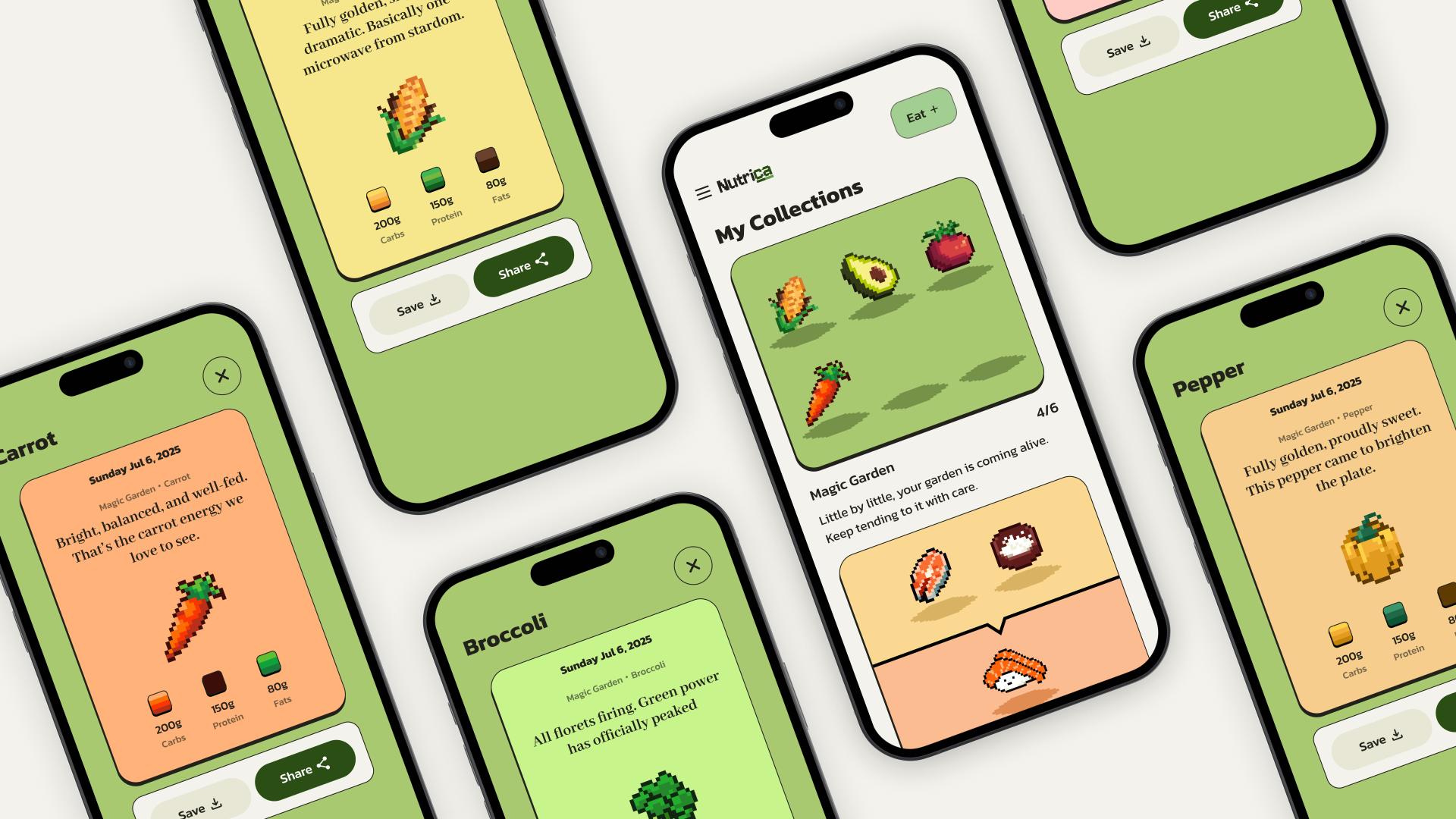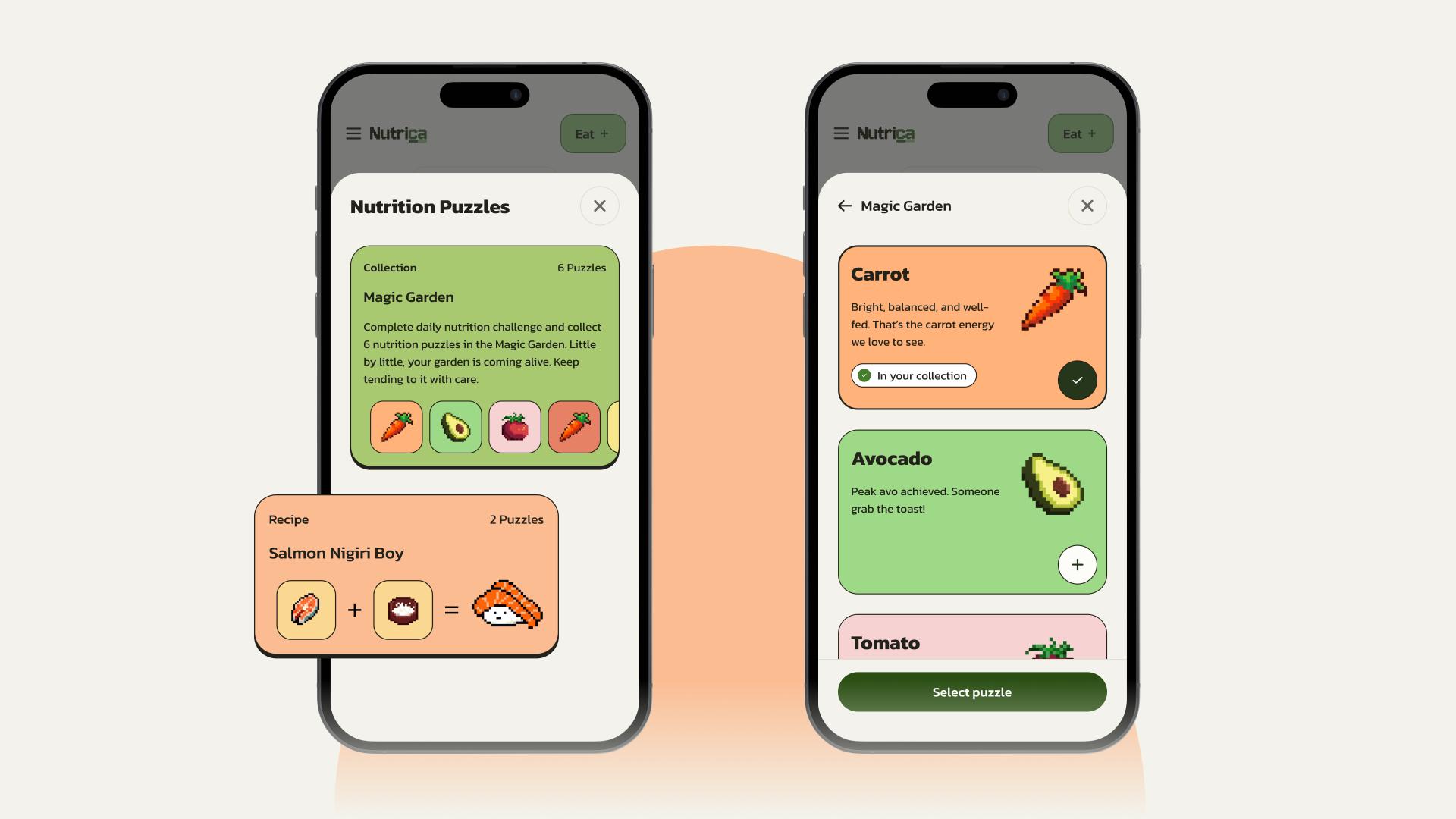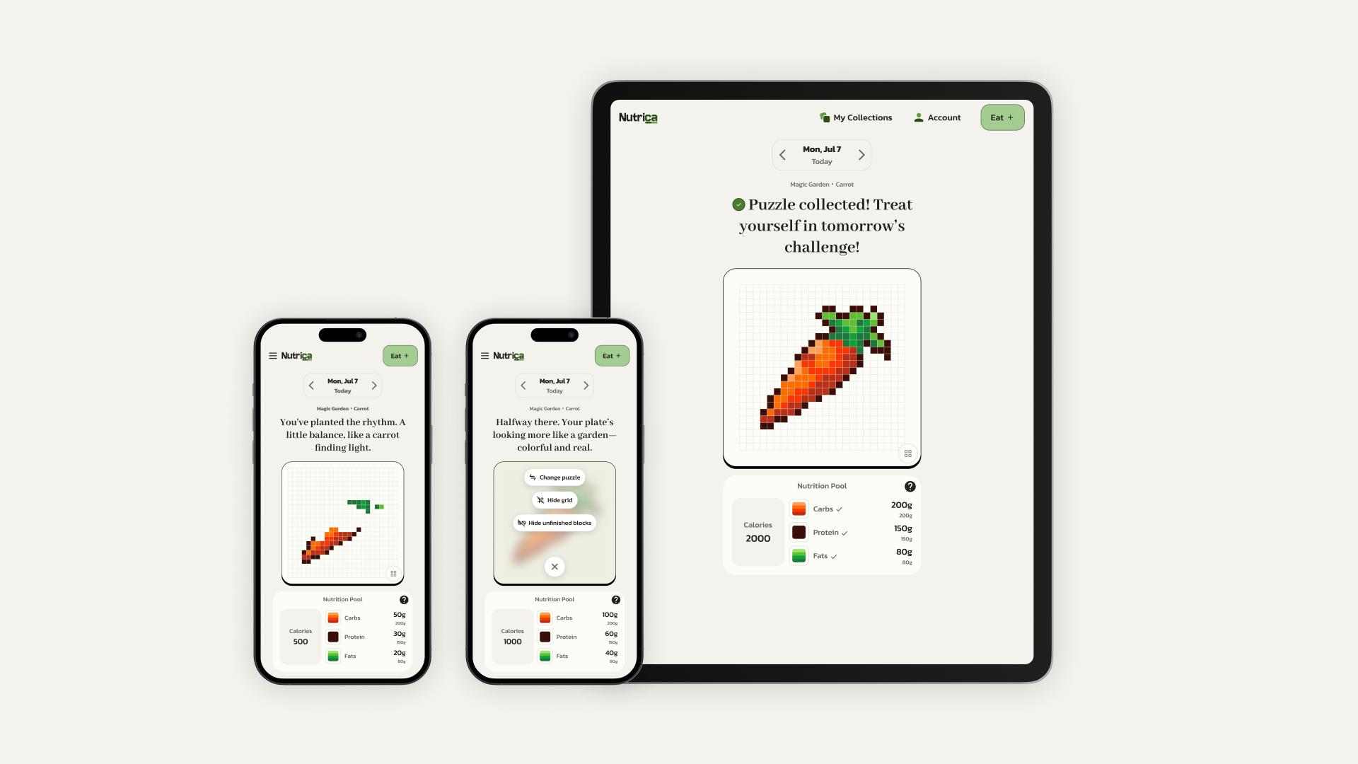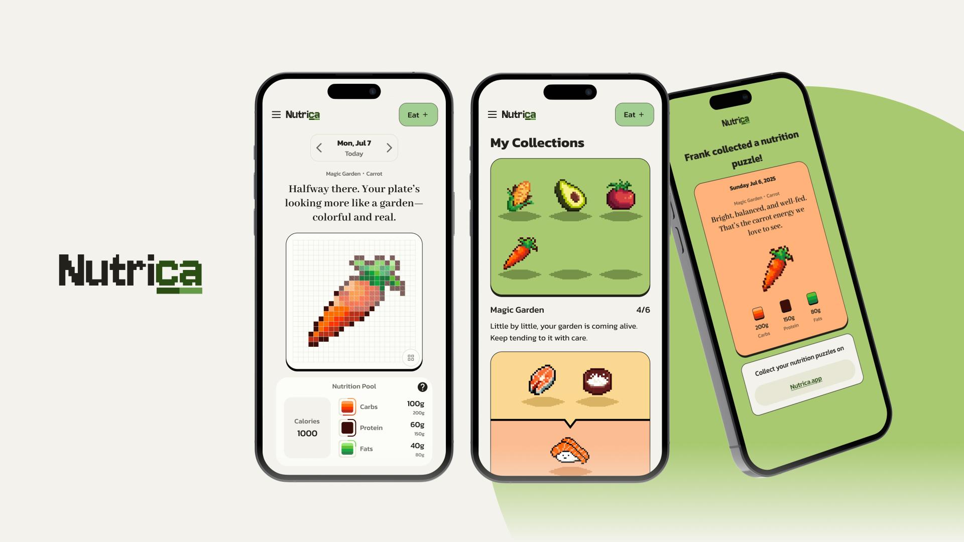 Nutrica is a playful nutrition journaling app that reimagines how people experience daily nutrition tracking. By transforming nutrient intake into narrative-driven pixel puzzles, it turns a typically tedious task into an engaging and emotionally rewarding experience, supported by AI powered food recognition that simplifies the logging process.