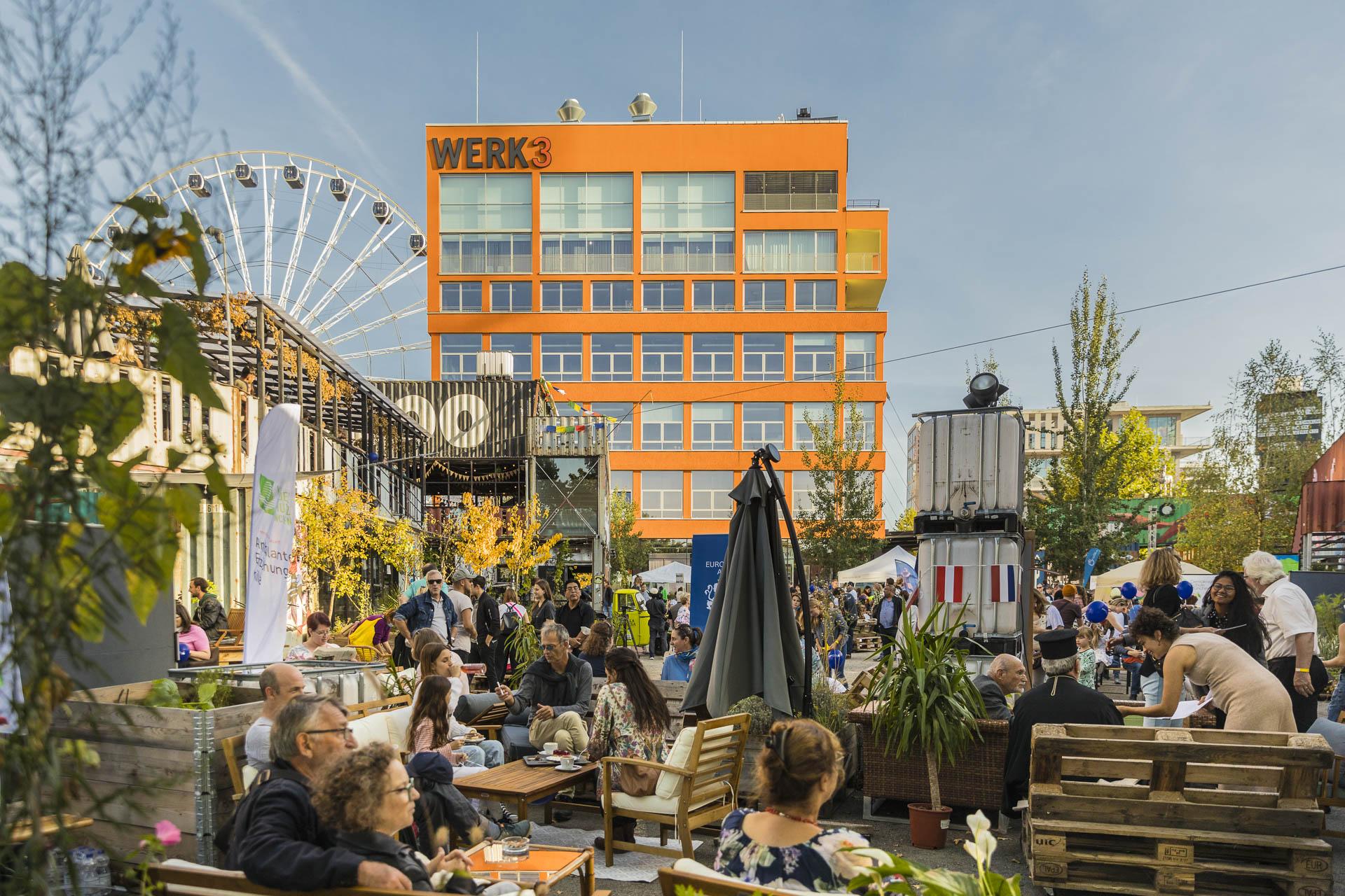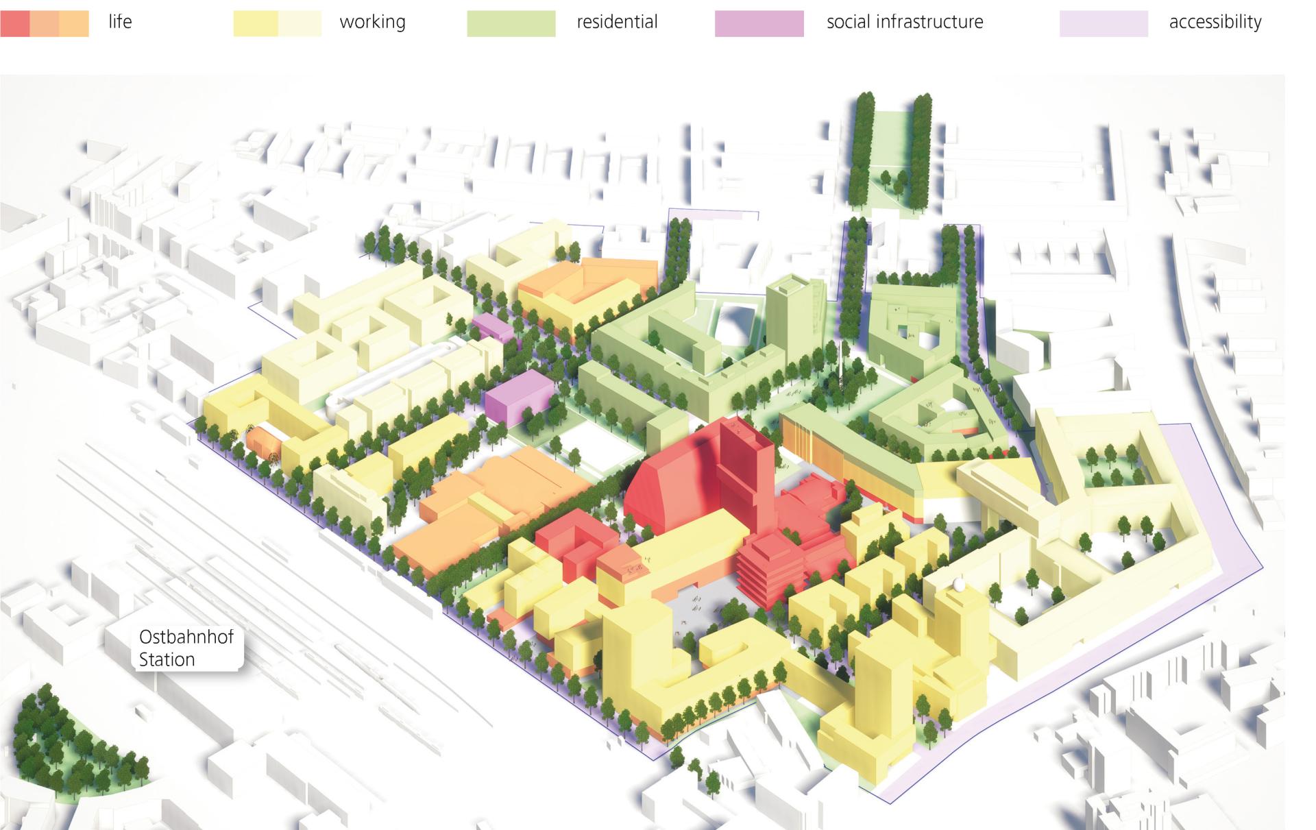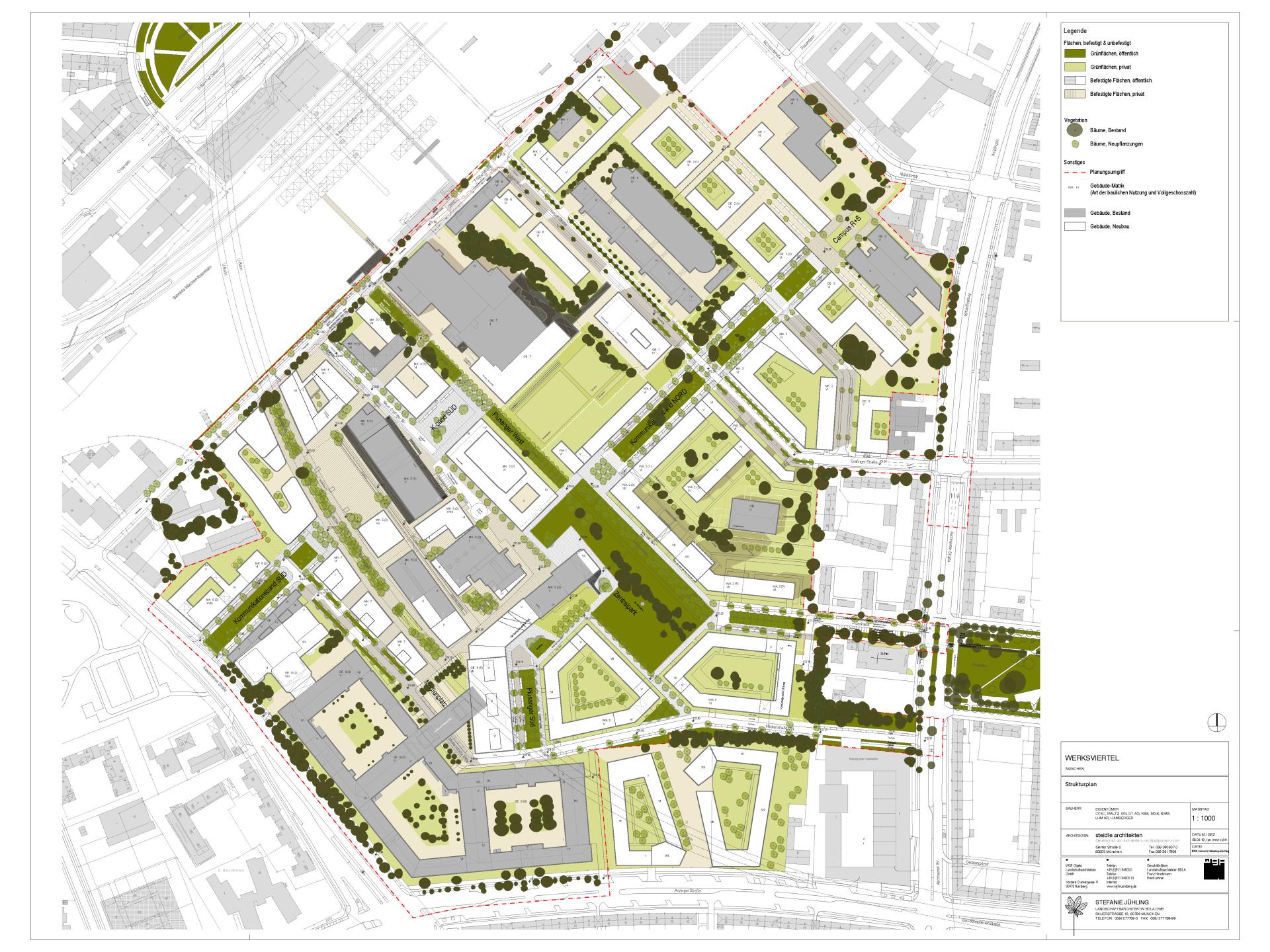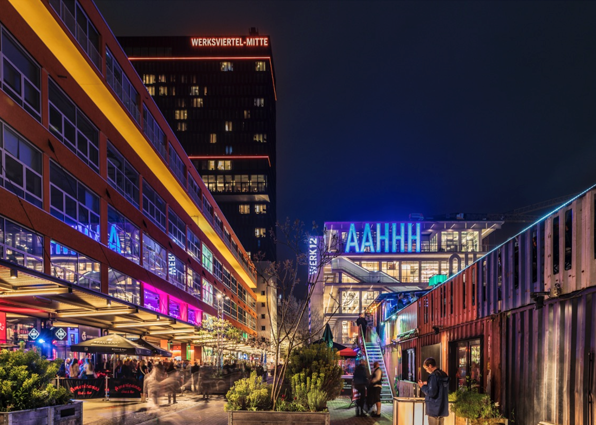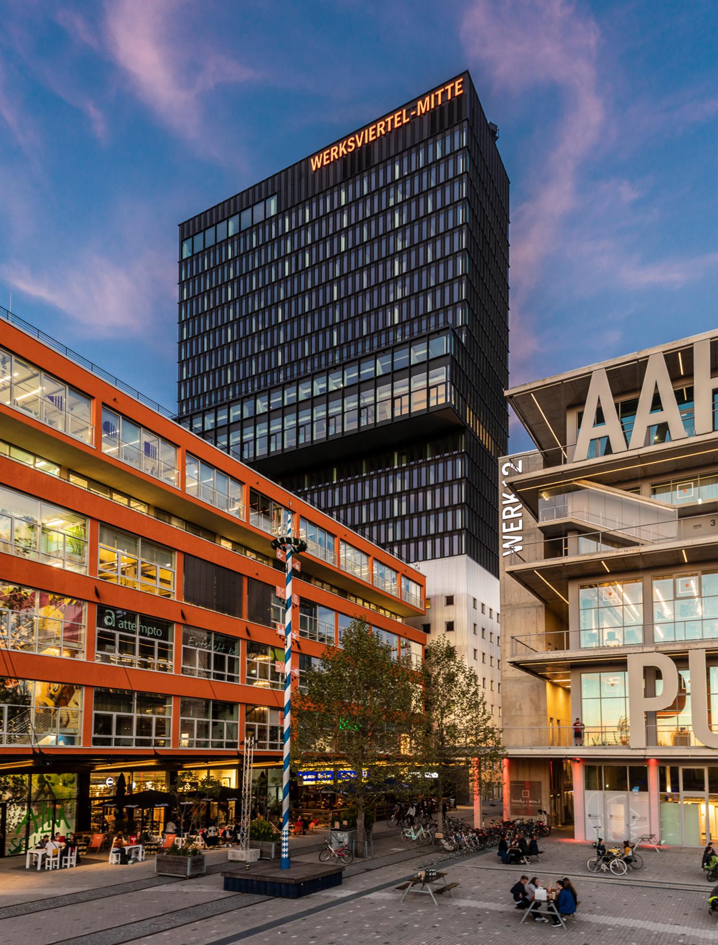 The Werksviertel Munich, Germany, is the development of a former industrial site into an independent quarter for residential, commercial, social, and cultural activities with open public spaces for events and other forms of entertainment, carefully curated by the main owner, the OTEC. The Werksviertel is connected to the core of Munich by the Ostbahnhof in the north, the Kusterman Park in the west, residential quarters in the south and commercial areas in the east and functions as urban interface. The existing activities are to be gradually cultivated, consolidated and updated, while new developments are initiated at the same time. Urban diversity, spatial events and programmatic innovation are the focus of the design work, which is joint by several European architecture studios - steidle architects as leading architects and urban planners. Housing will be integrated into the overall urban concept of the Werksviertel as a further, unique urban building block. Two factors are of crucial importance: the use of the ground floor as an active interface between public and private space, as well as a broad mix of living space typologies. Only when added together the actual value emerges: a new piece of modern, sustainable city, the Metropolitan City of Munich! The close integration of the functions of living, working, culture and leisure leads to short distances and thus the avoidance of motorized, individual traffic. The direct connection to the train network, the subway, S-Bahn and tram as well as the bus system also enables optimal accessibility for external visitors to the district. Social sustainability is similarly supported. The update and further integration of uses and users into the new district prevents unnecessary movements. In order to act as sustainably as possible, it was decided to preserve a large part of the buildings and put them to new use. Calculations showed that 85.028 tonnes of building materials were taken over from existing buildings in Werksviertel-Mitte by 2030, including concrete, steel and masonry. In total, 42 percent of the existing building fabric in Werksviertel-Mitte was able to be preserved. Intensively green roofs mown by sheep improve the “Heat “Heat Island” problem.