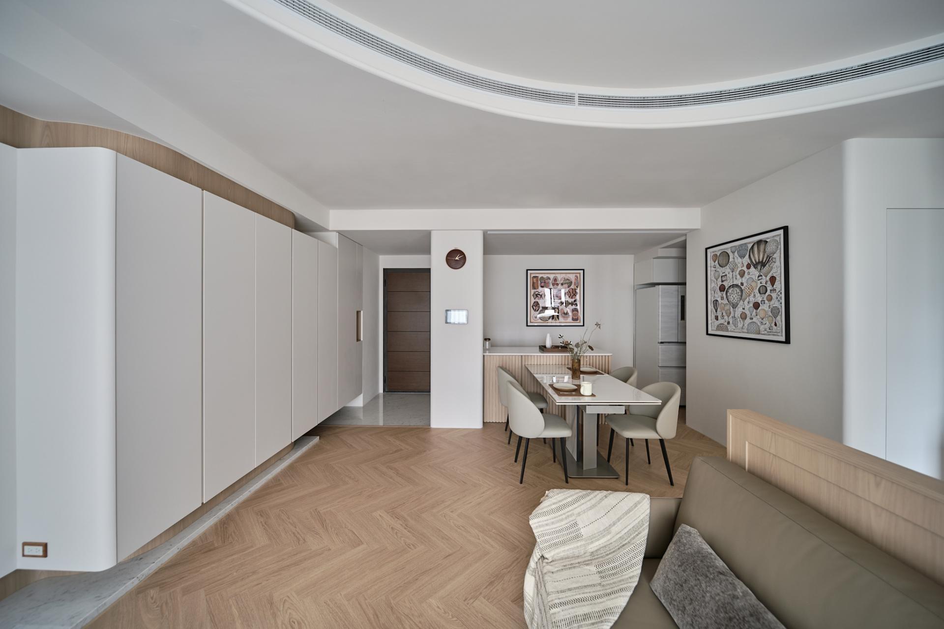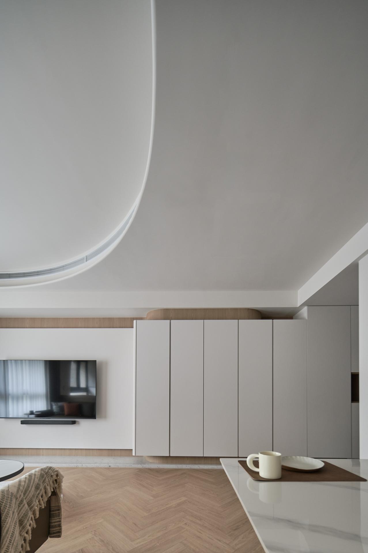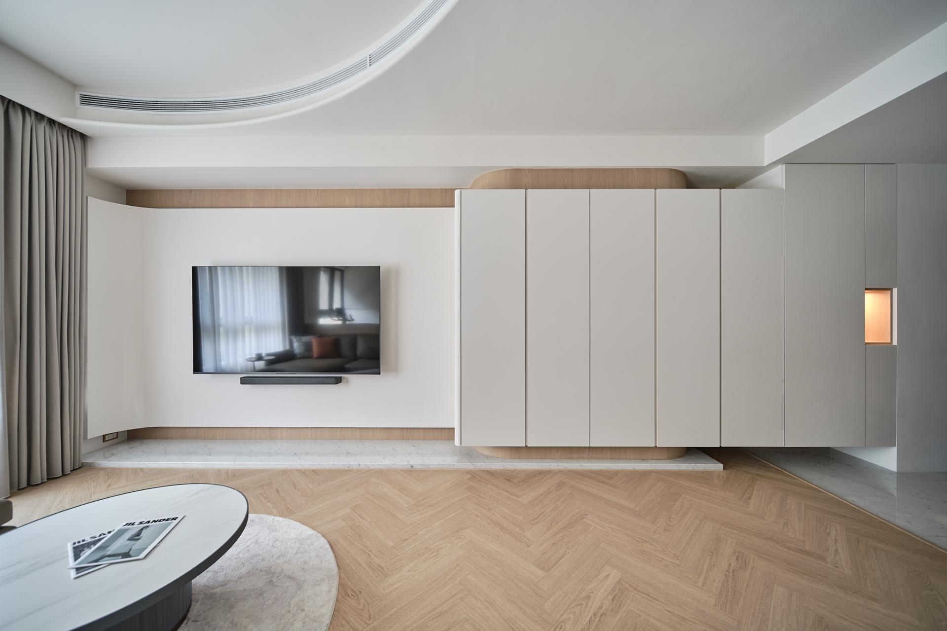 Upon entering, guests will be welcomed by a stunning floor of silver fox marble that beautifully embodies the owner's understated elegance. Transitioning into the public areas, one is greeted by herringbone-patterned wooden floors that artfully delineate various zones, creating a harmonious flow through the careful use of contrasting materials. To further enhance both safety and aesthetic softness, all walls and cabinet corners throughout the home feature gracefully rounded edges. On the right side of the living room, the TV wall cleverly integrates storage cabinets designed to accommodate larger items, such as a robotic vacuum cleaner and golf equipment, ensuring that functionality does not compromise style. Moreover, to cater to the homeowner's culinary and social needs, an island bar counter was thoughtfully incorporated into the kitchen area. This counter boasts a striking wood-grain lattice design, which adds delightful visual depth and character. Finally, the study, tucked away behind the living room sofa, was meticulously crafted with open shelves and hanging cabinets. This design not only allows the homeowner to showcase decorative items and books but also creates an inviting atmosphere for work and creativity, seamlessly blending function with elegance.