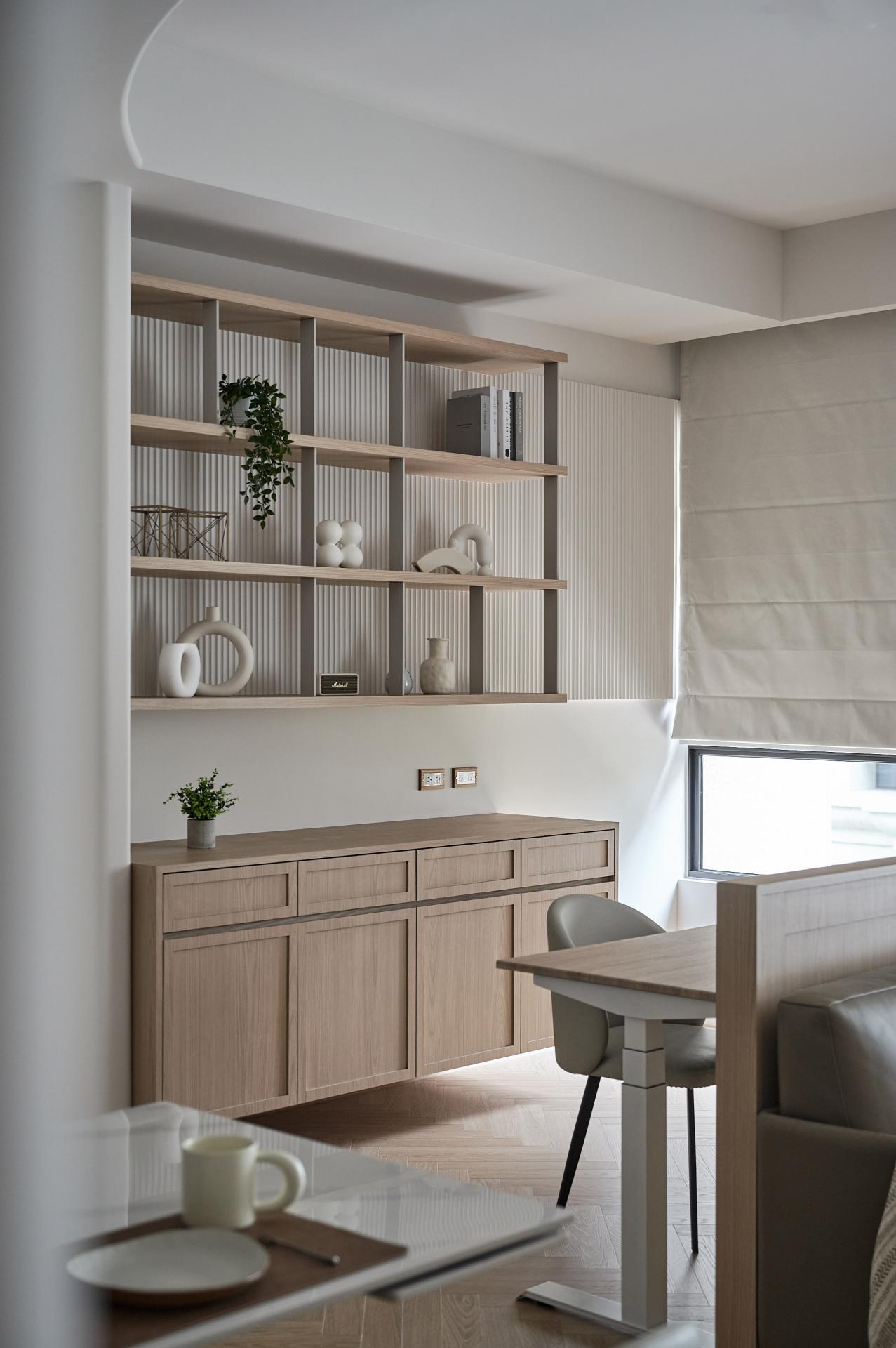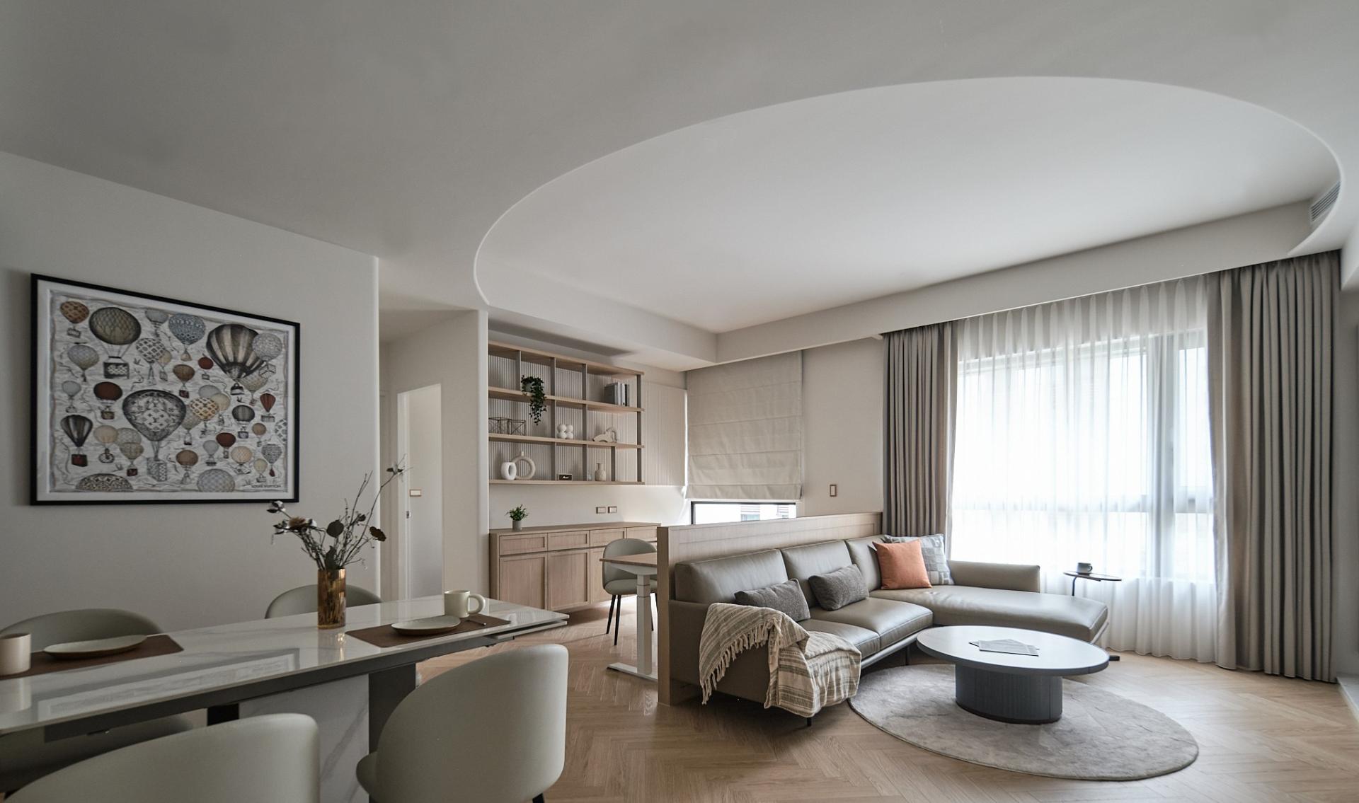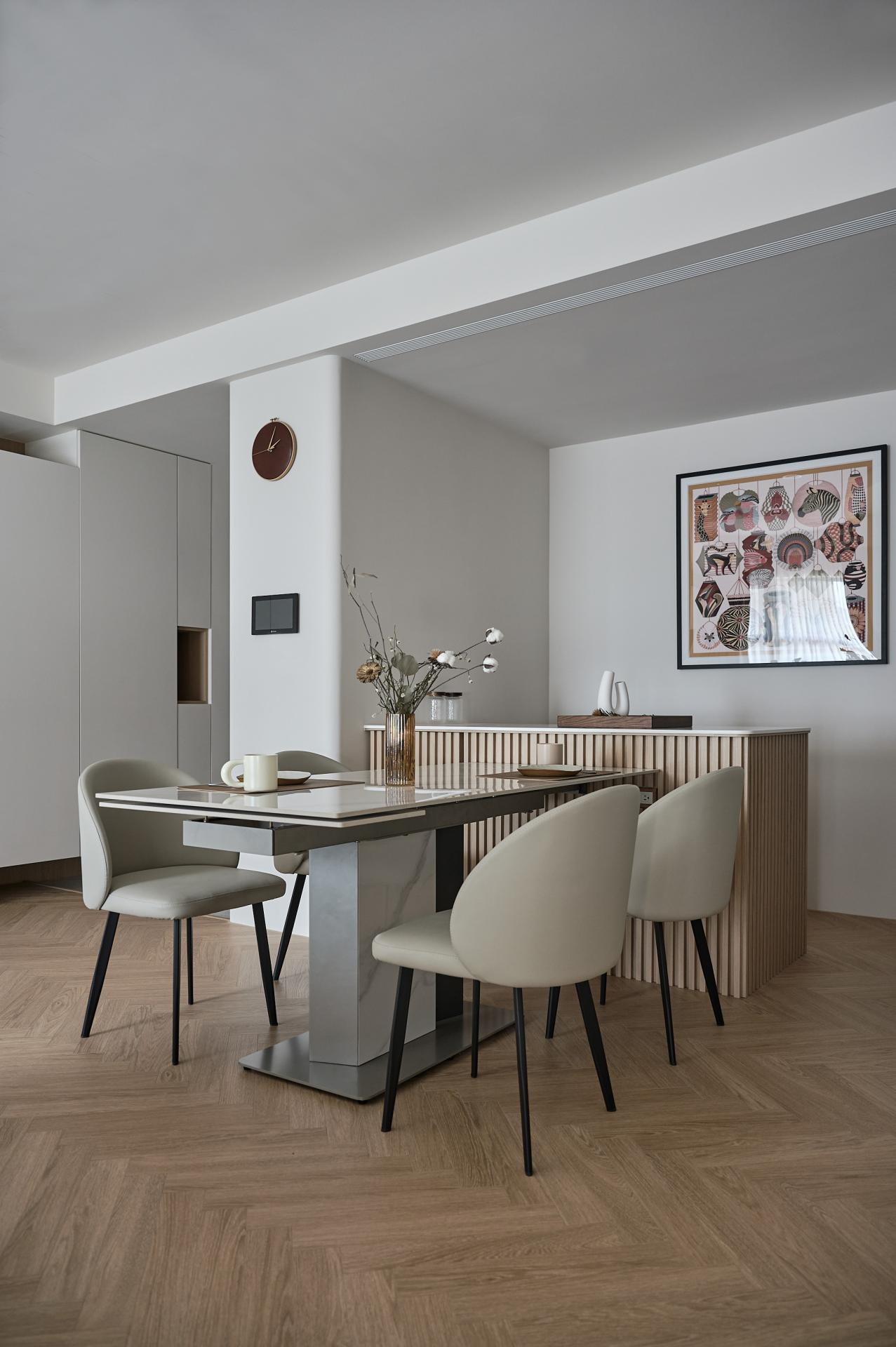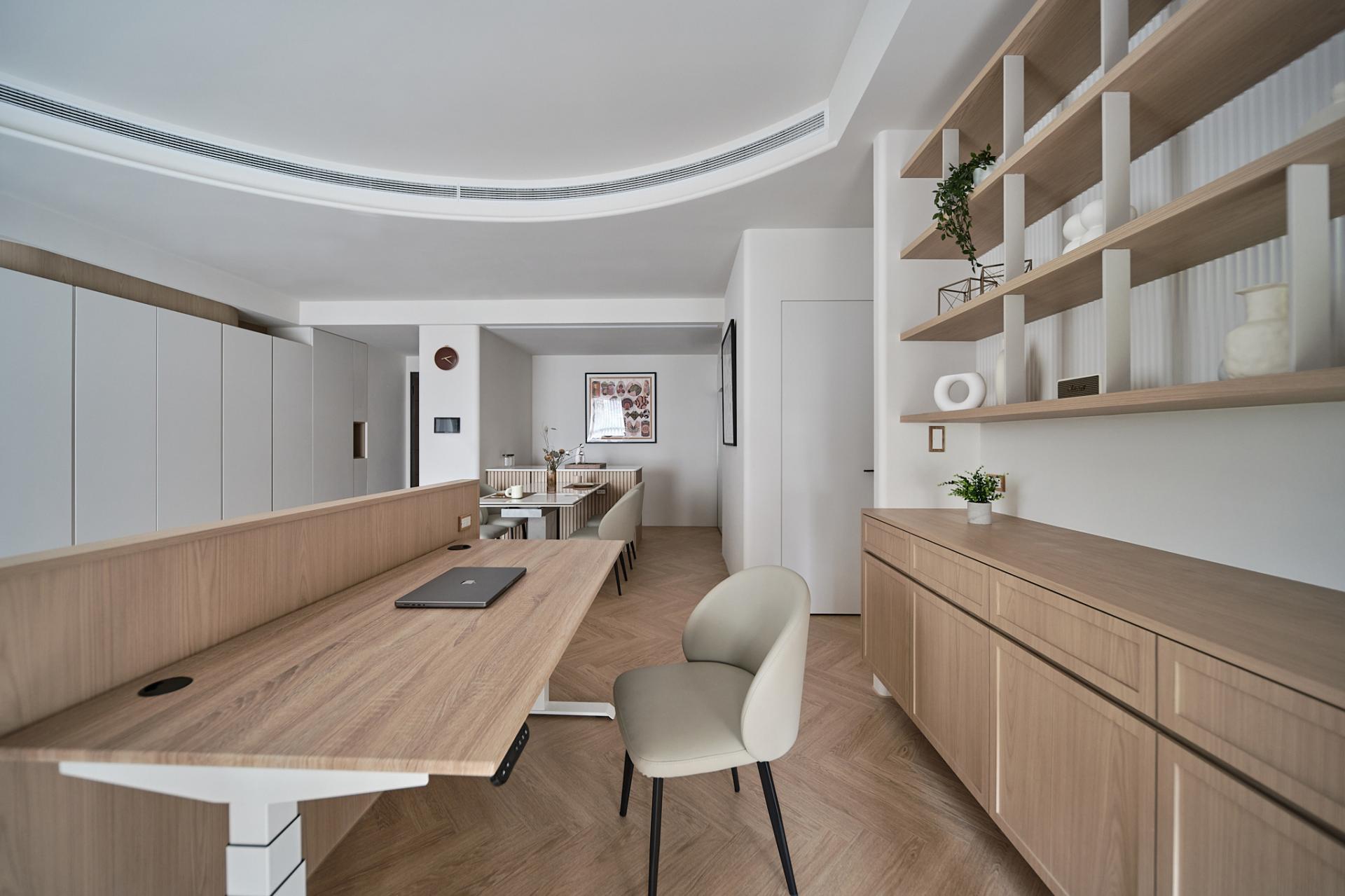 Upon entering, guests will be welcomed by a stunning floor of silver fox marble that beautifully embodies the owner's understated elegance. Transitioning into the public areas, one is greeted by herringbone-patterned wooden floors that artfully delineate various zones, creating a harmonious flow through the careful use of contrasting materials. To further enhance both safety and aesthetic softness, all walls and cabinet corners throughout the home feature gracefully rounded edges. On the right side of the living room, the TV wall cleverly integrates storage cabinets designed to accommodate larger items, such as a robotic vacuum cleaner and golf equipment, ensuring that functionality does not compromise style. Moreover, to cater to the homeowner's culinary and social needs, an island bar counter was thoughtfully incorporated into the kitchen area. This counter boasts a striking wood-grain lattice design, which adds delightful visual depth and character. Finally, the study, tucked away behind the living room sofa, was meticulously crafted with open shelves and hanging cabinets. This design not only allows the homeowner to showcase decorative items and books but also creates an inviting atmosphere for work and creativity, seamlessly blending function with elegance.