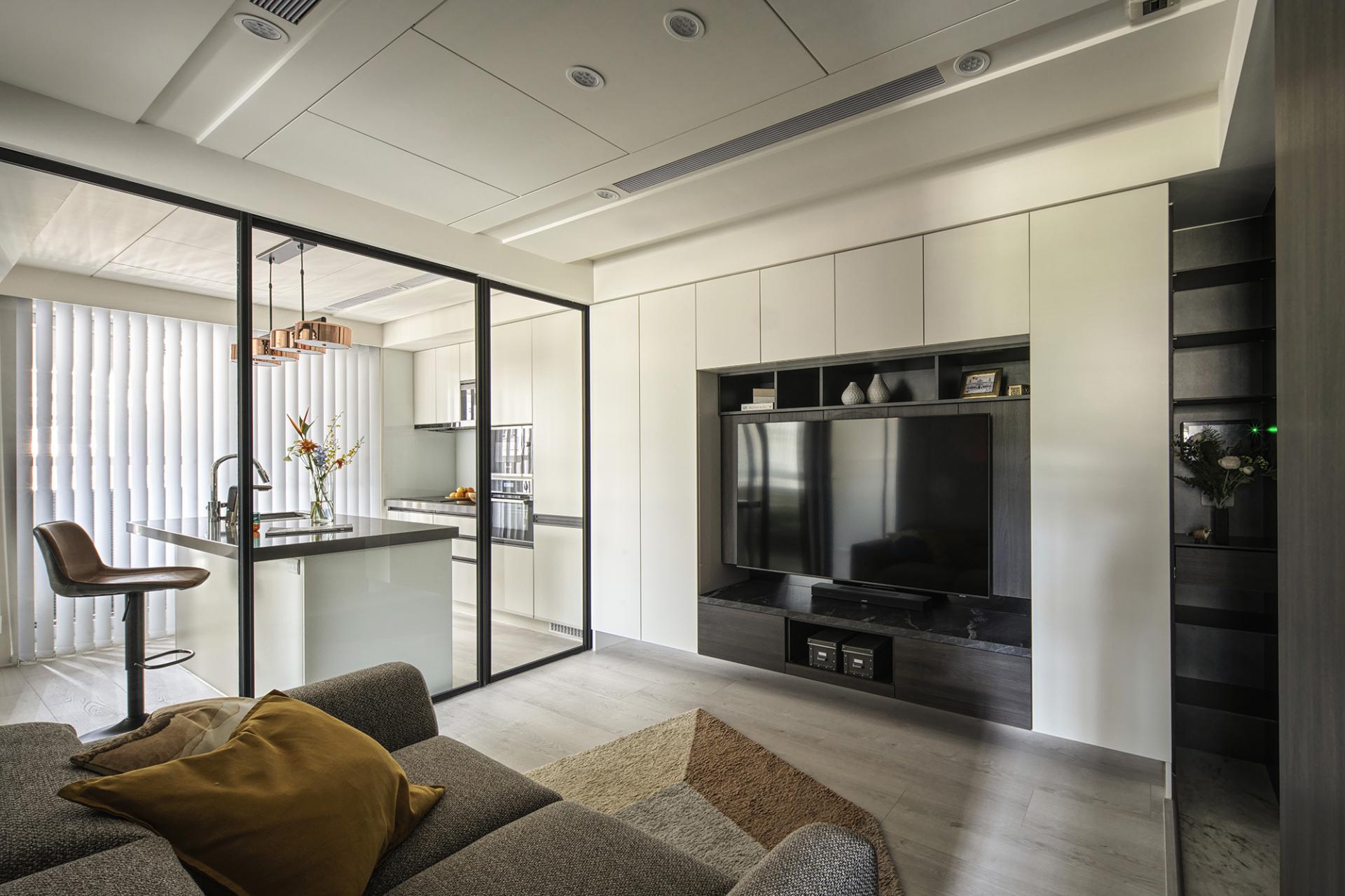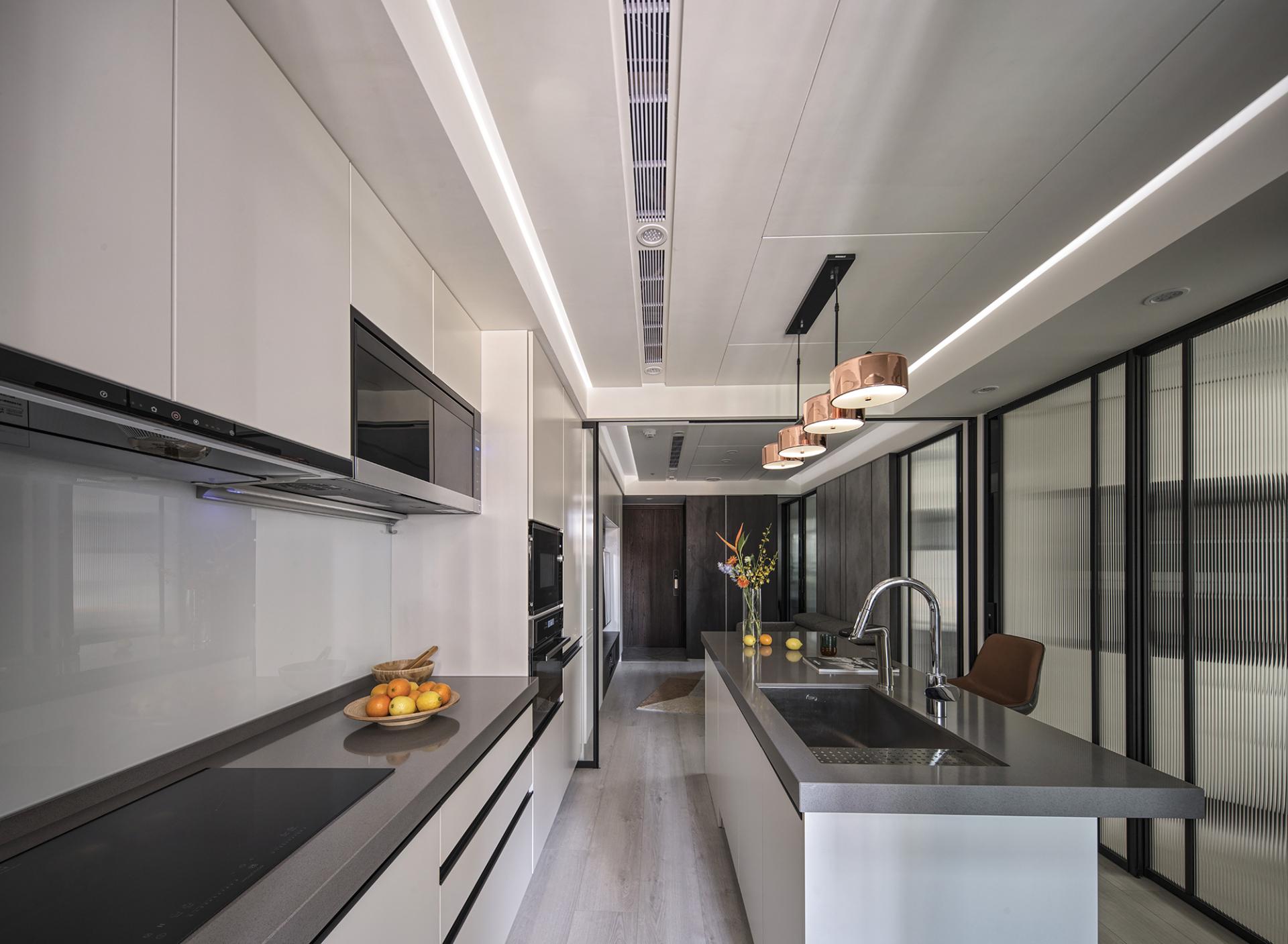The first layer of spatial order derives from “boundary.” The material of the kitchen cabinetry was extended seamlessly to the living room’s TV cabinet, avoiding abrupt color differences and forming a continuous façade. Black, gray, and white tones run cleanly throughout, free of superfluous ornament, with consistent gradients reinforcing the purity of spatial boundaries. Here, “boundary” represents not only the division of functions but also the refinement of aesthetics, creating a social area that is clear, calm, and hotel-like in demeanor.