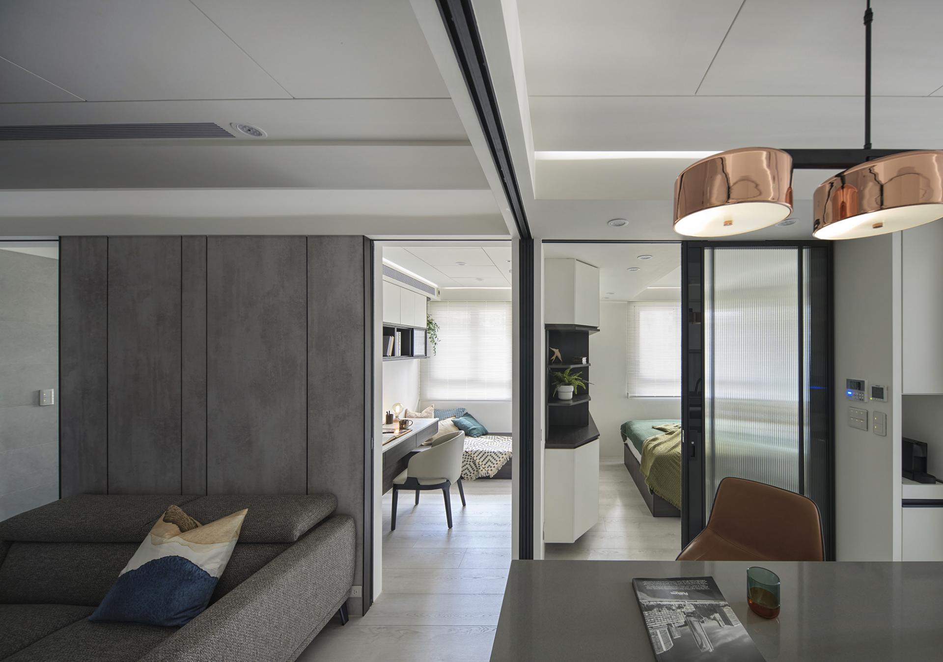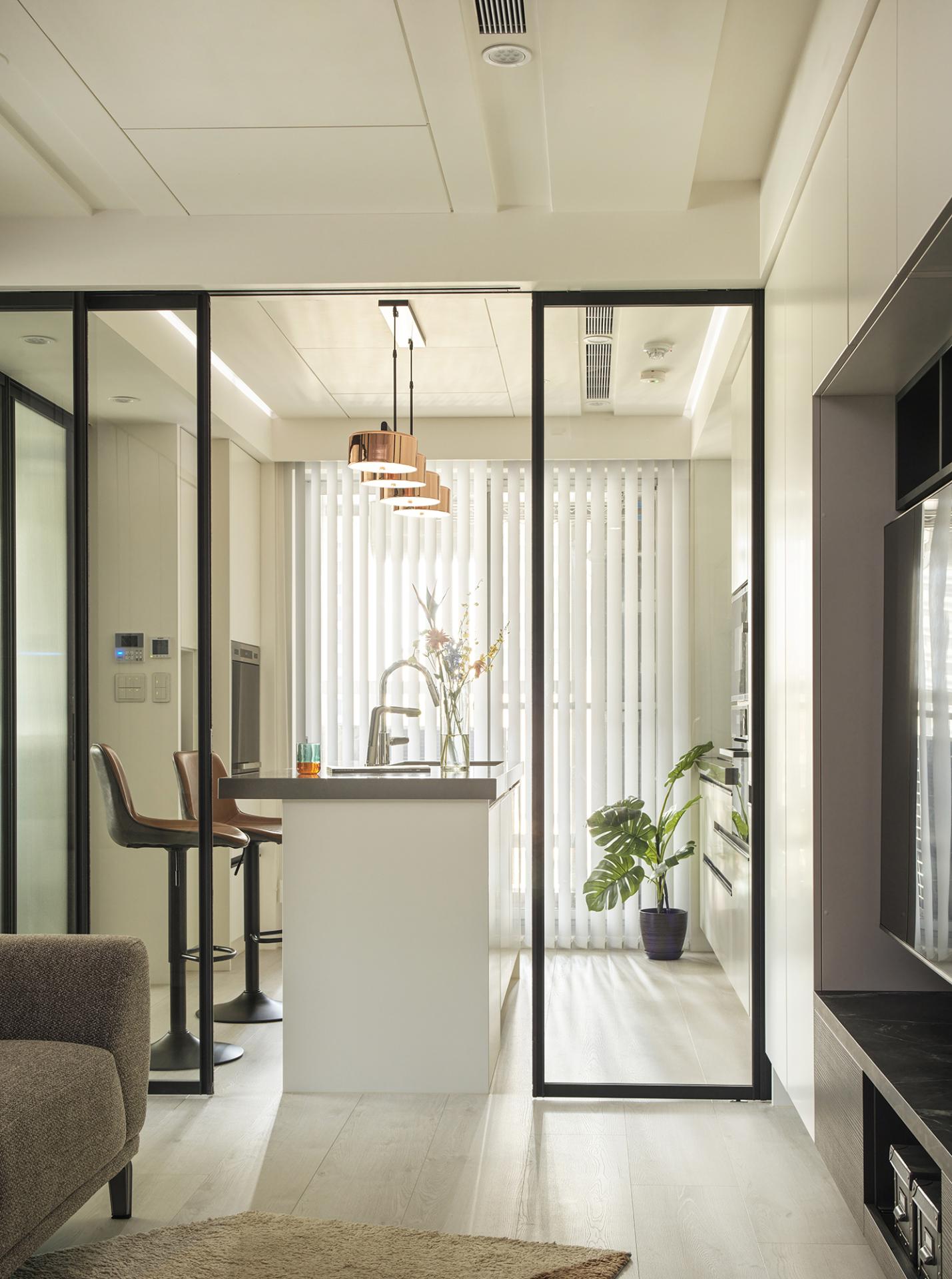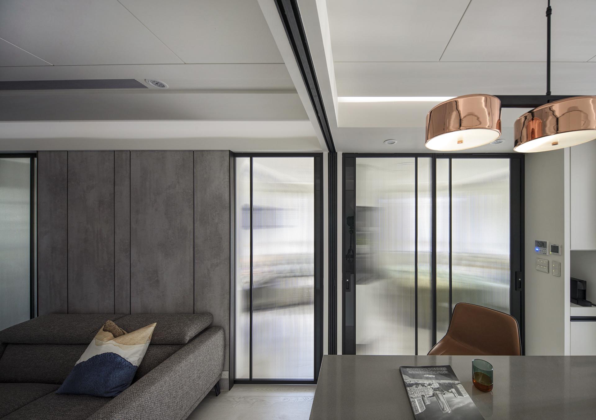 The site is a new apartment delivered after pre-sale modifications. The homeowners, who have lived abroad in the United States for many years, envisioned it as a retreat during visits to Taiwan and eventually as a retirement residence. Within a compact space, they sought ample storage, natural daylight, and a hotel-like sense of relaxation. The design team intervened during the construction phase, retaining only the electrical and plumbing points while redistributing the entire plan from empty. The core strategy was to use the concept of “between open and closed” to extend light and visual continuity. Aluminum-framed reeded glass sliding doors were installed for the master bedroom, study, and bathroom, allowing side-window daylight to enter private areas and link into the living-dining space, ensuring that the small residence remains bright and fluid.