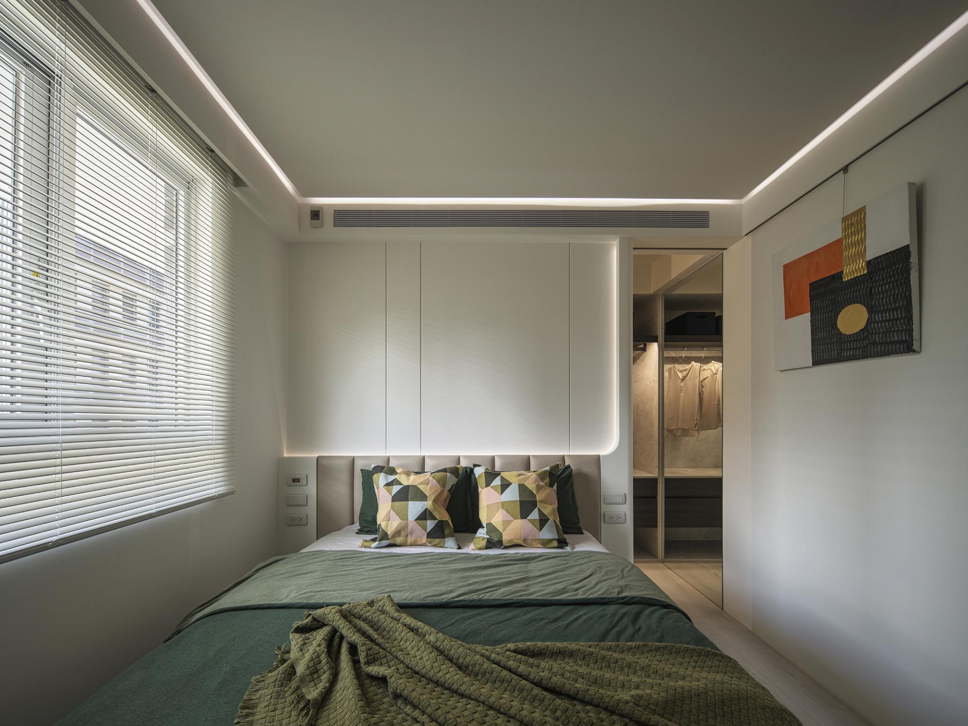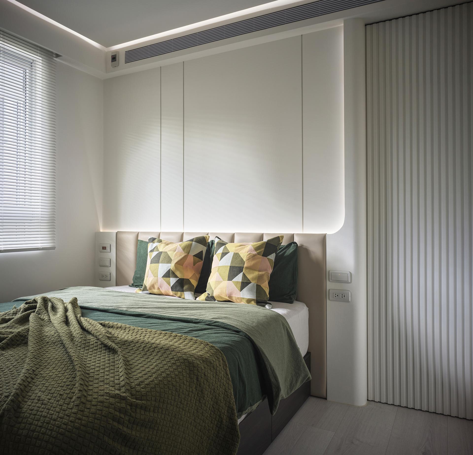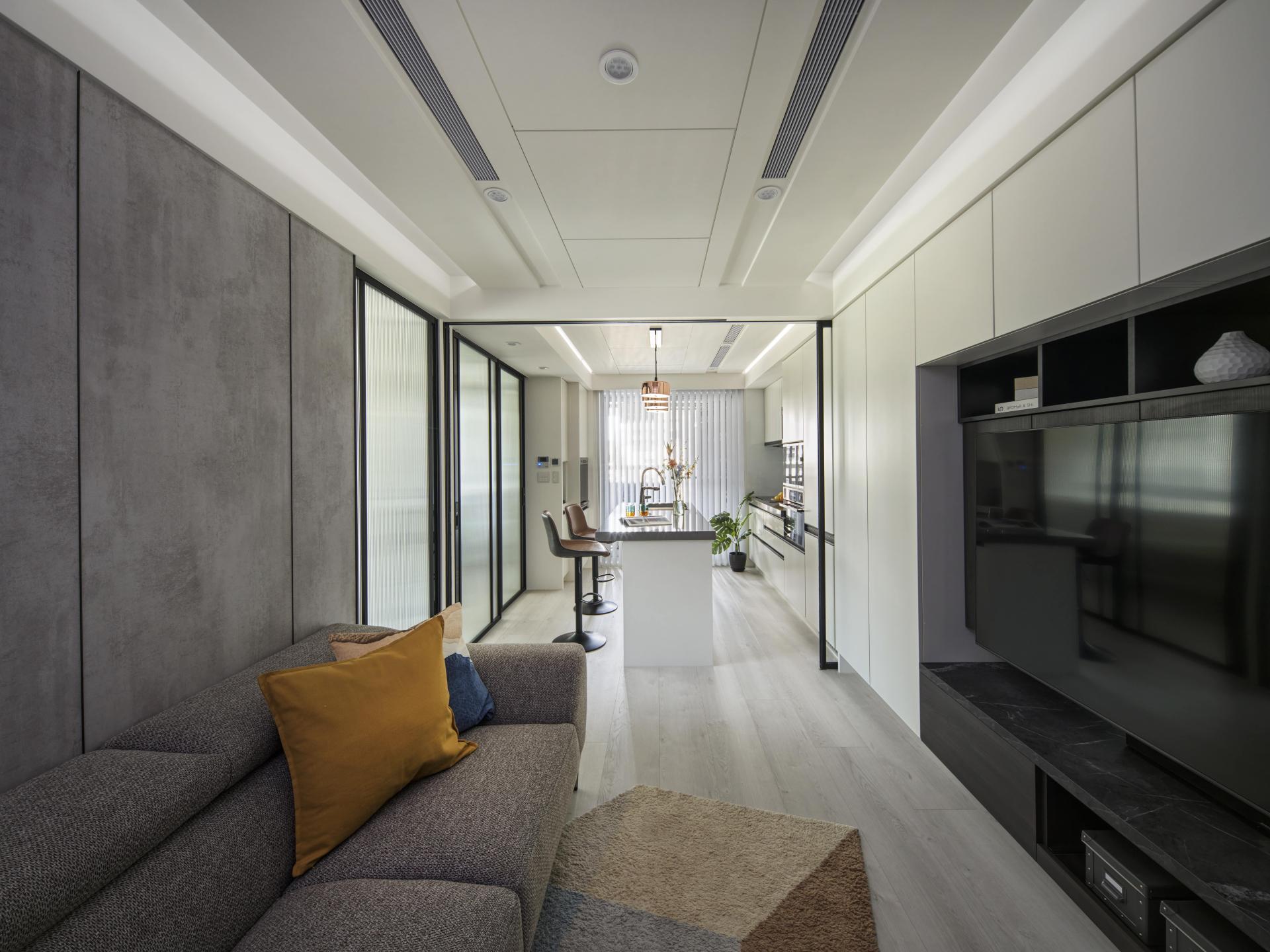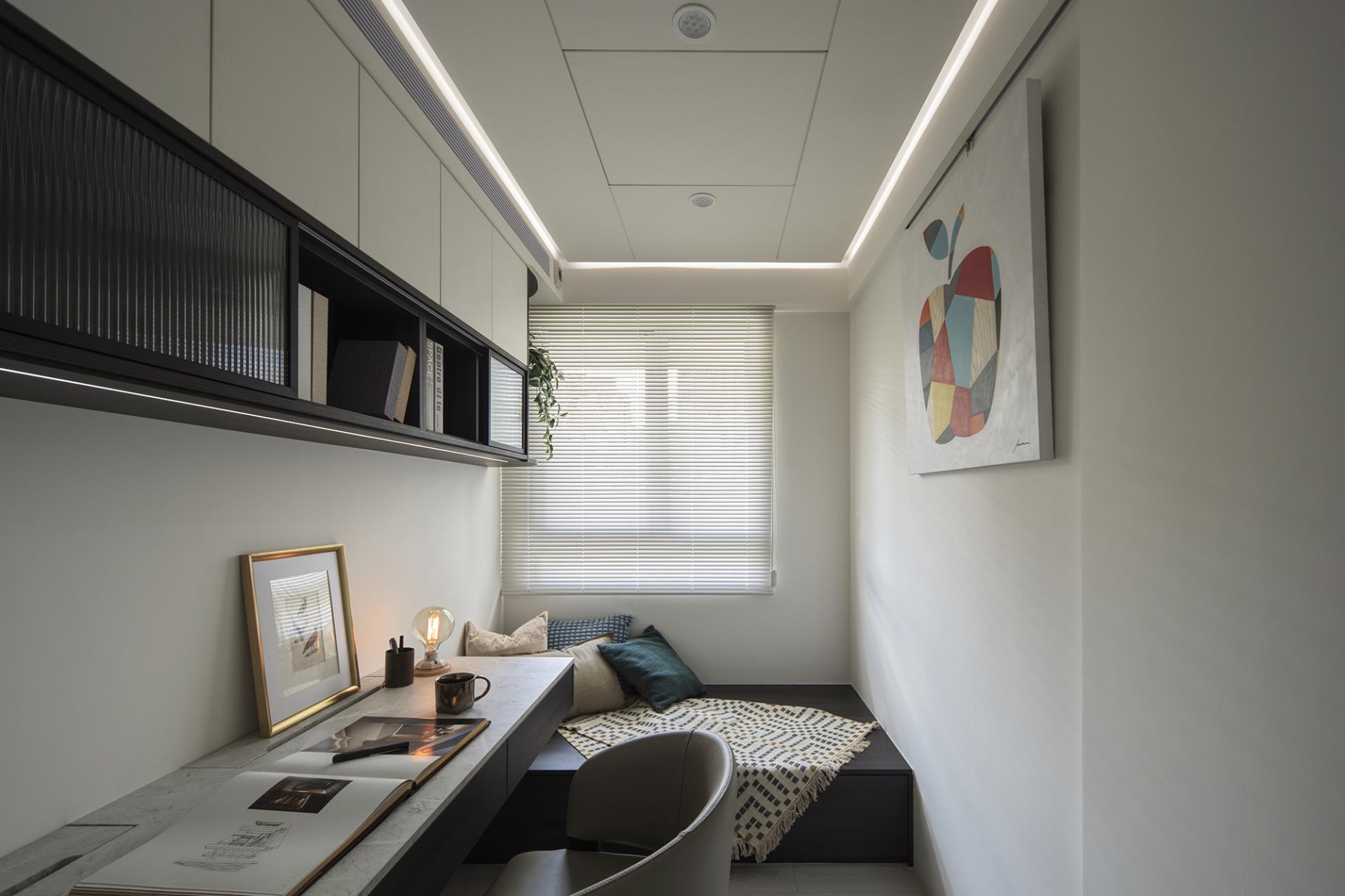 The site is a new apartment delivered after pre-sale modifications. The homeowners, who have lived abroad in the United States for many years, envisioned it as a retreat during visits to Taiwan and eventually as a retirement residence. Within a compact space, they sought ample storage, natural daylight, and a hotel-like sense of relaxation. The design team intervened during the construction phase, retaining only the electrical and plumbing points while redistributing the entire plan from empty. The core strategy was to use the concept of “between open and closed” to extend light and visual continuity. Aluminum-framed reeded glass sliding doors were installed for the master bedroom, study, and bathroom, allowing side-window daylight to enter private areas and link into the living-dining space, ensuring that the small residence remains bright and fluid.
