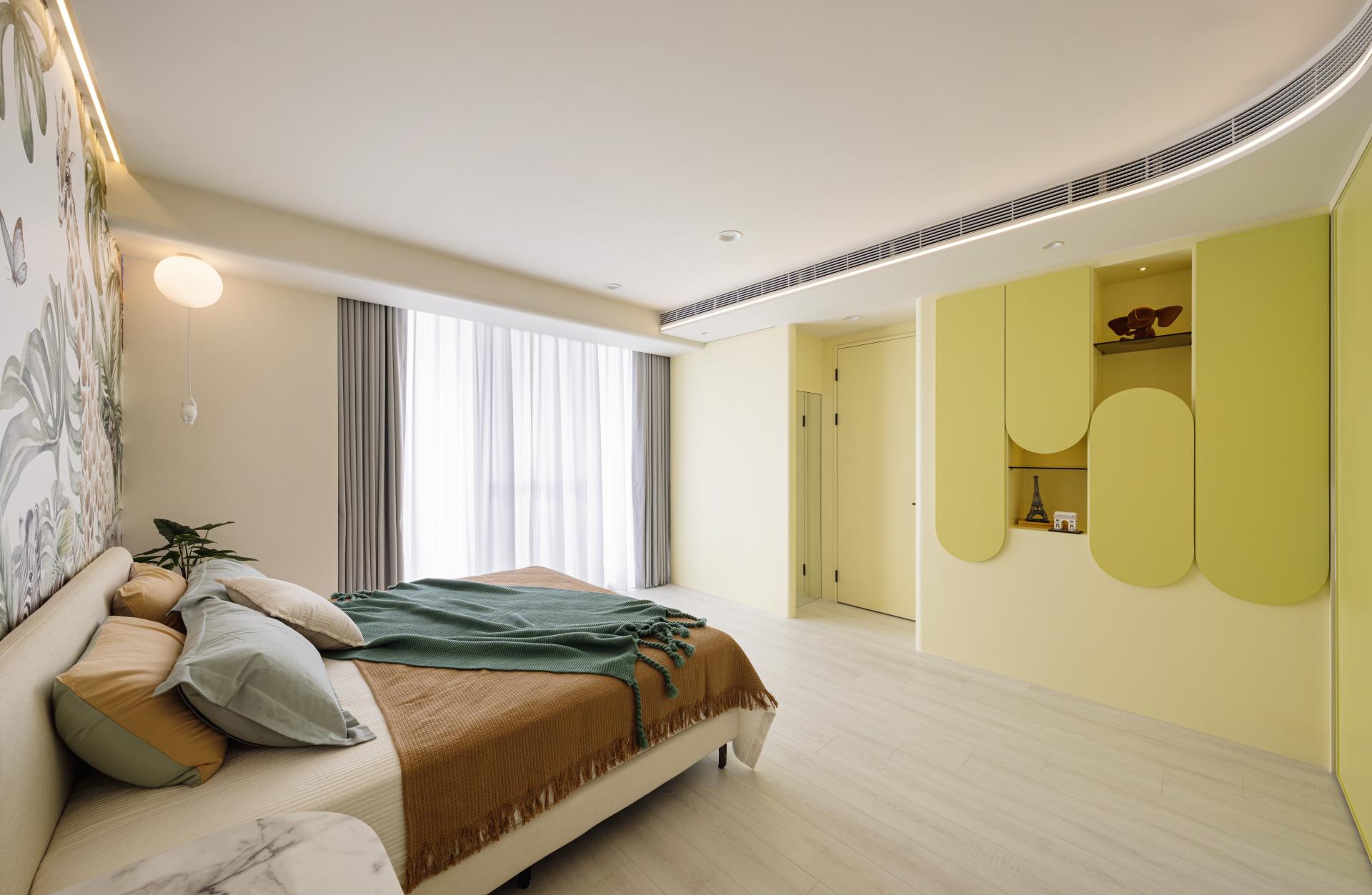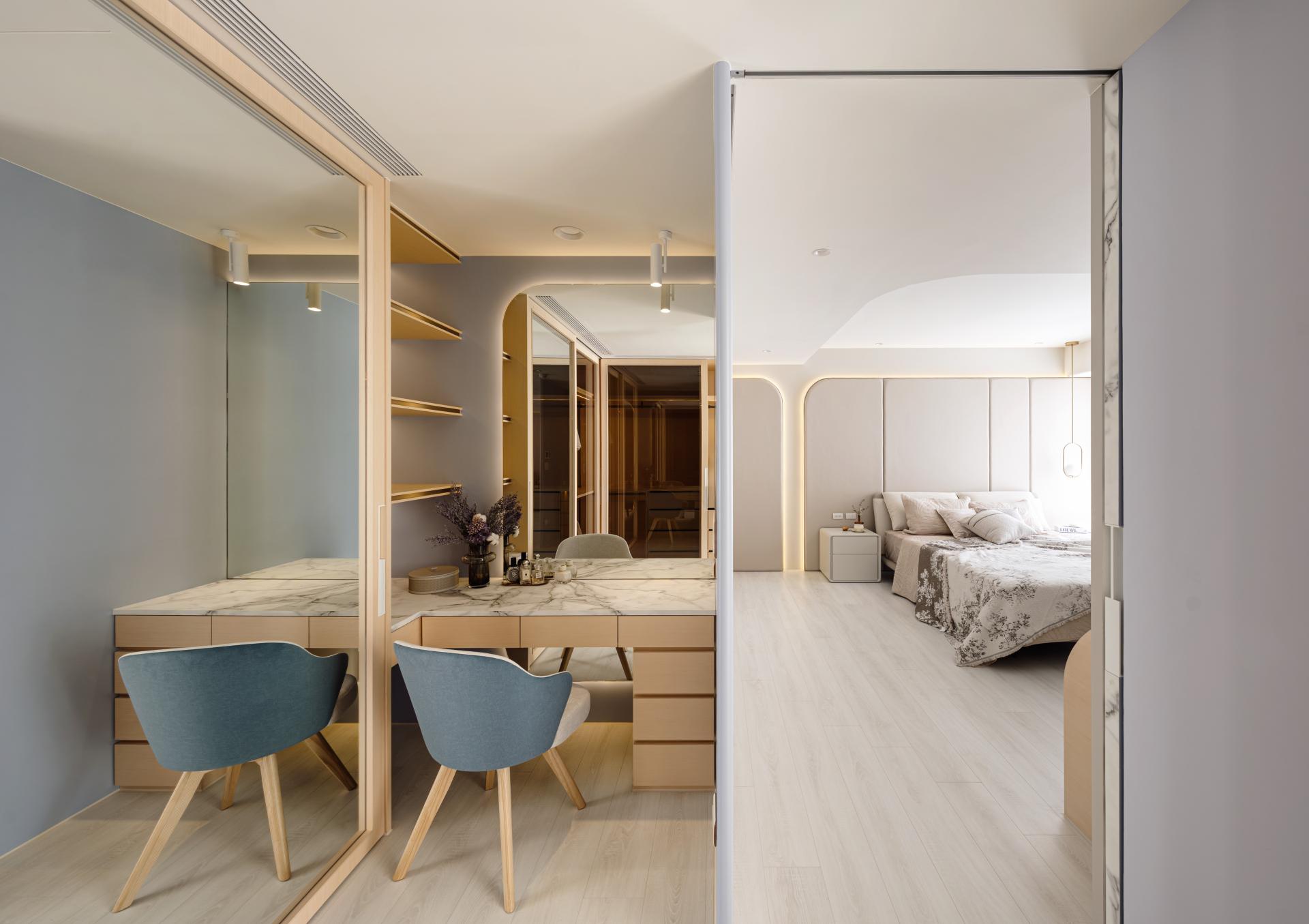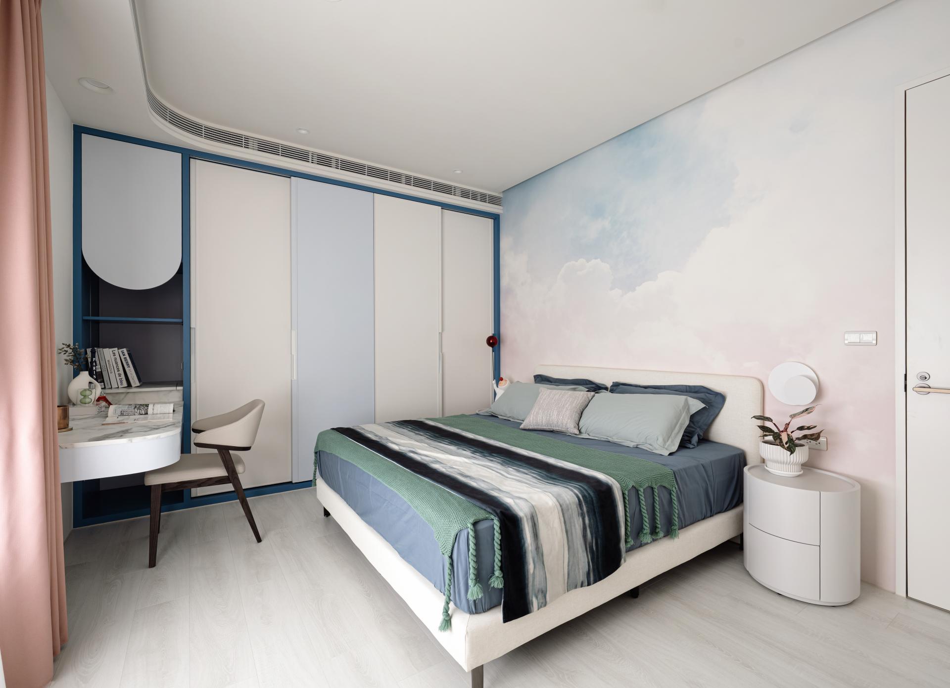 Next to the dining area, a hand-painted blue art wall condenses impressions of the harbor. Created on-site using eco-friendly paint, the piece layers the direction of the sea breeze, the rhythm of waves, and the blue of the bay into the surface, its depth subtly shifting with changes in light throughout the day. The kitchen is divided into a stir-fry area and a light-meal area, creating flexible hosting scenarios. The corridor and storage room are integrated to enhance space efficiency, giving every square meter its own sense of rhythm.