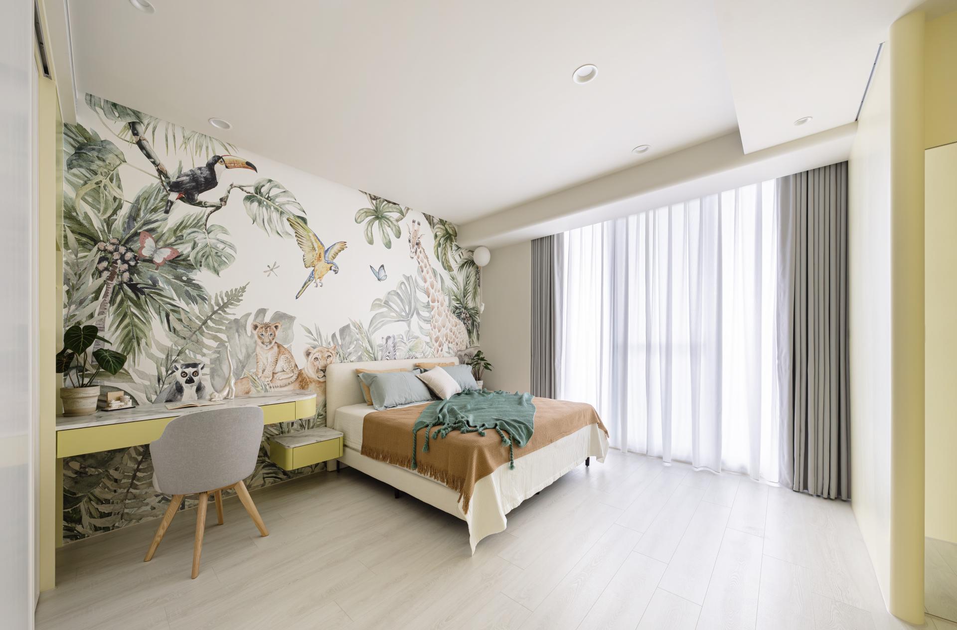 The private area is equally thoughtful. Wallpapers in the children’s rooms were personally chosen by the homeowners’ two elementary-school daughters, one themed around the jungle, the other inspired by the sky and moonlight in soft blue tones. Adjustable circular wall lamps mimic the changing phases of the moon. The master bedroom features a fabric-wrapped headboard and soft curves to create a sense of calm enclosure, while a hidden study provides a simple, private retreat for the homeowner.
