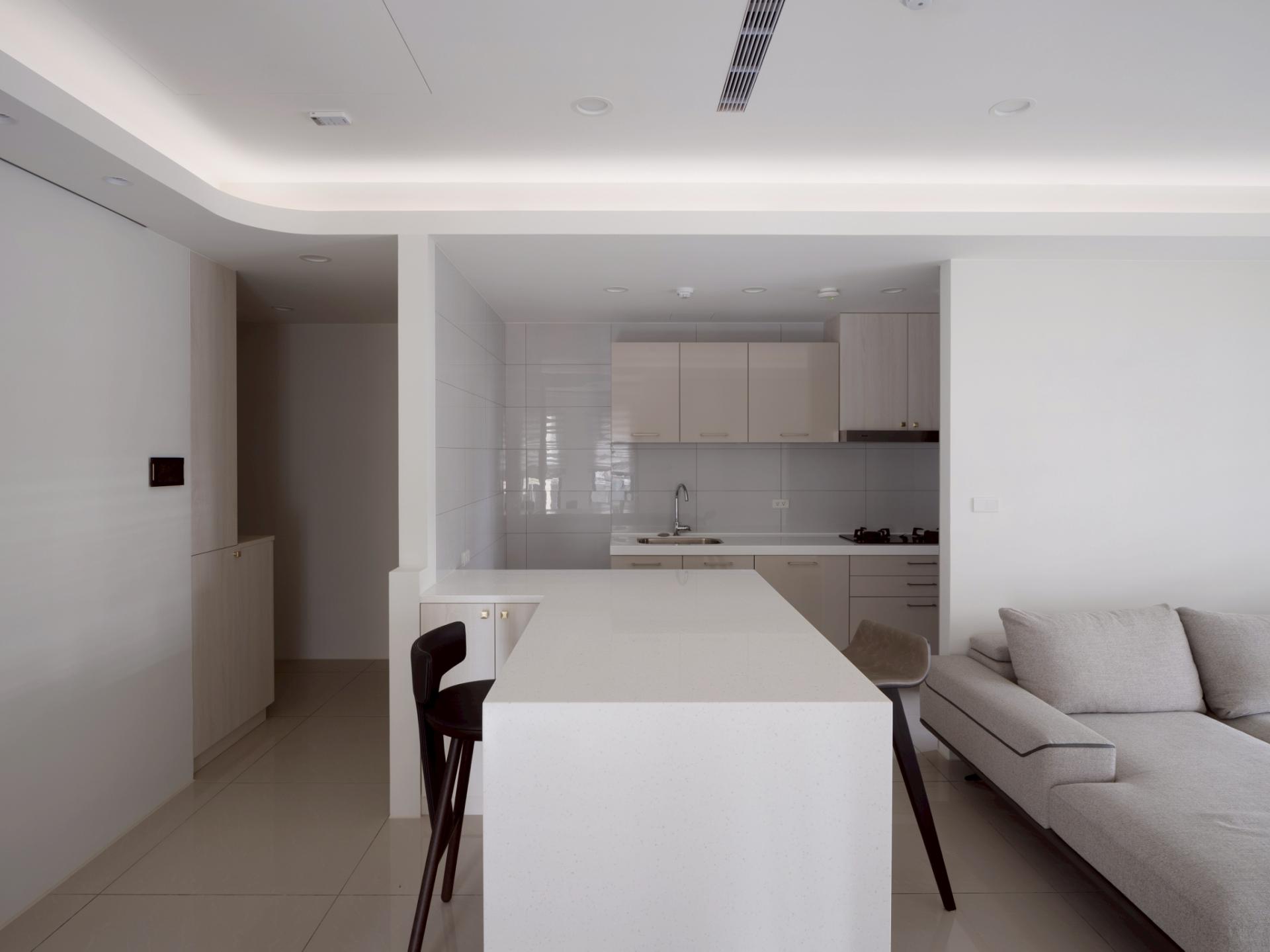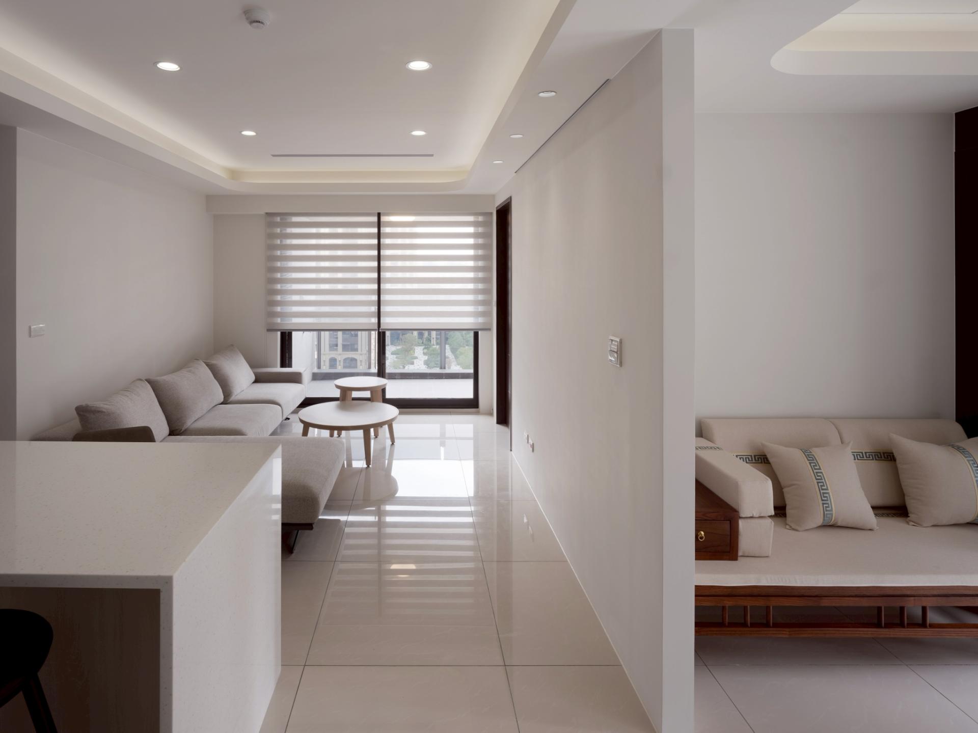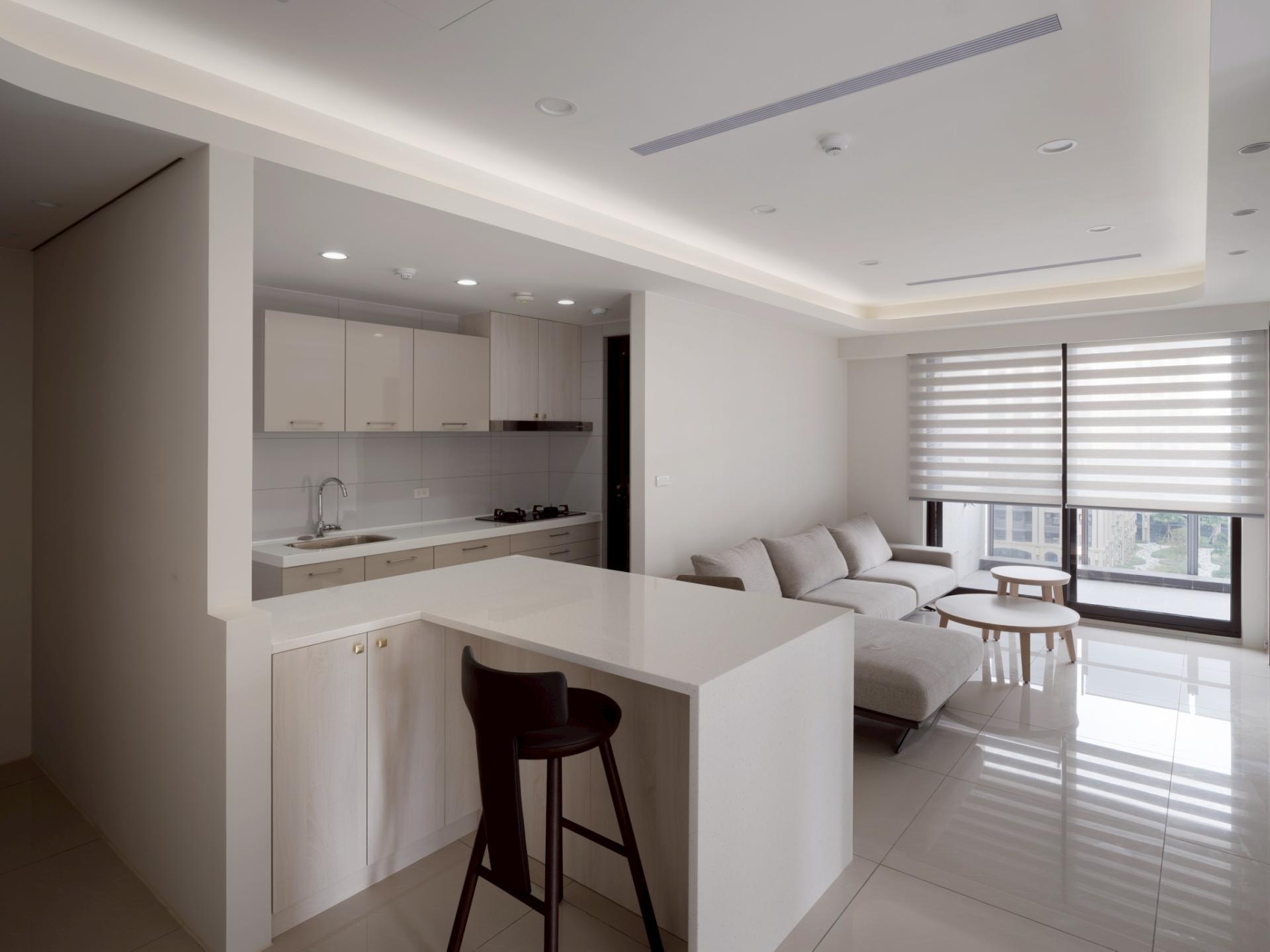 This urban residential design elegantly embraces a modern minimalist aesthetic, with “spatial extension” serving as its central theme. Notably, the design skillfully merges two original rooms to create a serene Chinese-style study, which invites focus and tranquility. In addition, the layout features an open kitchen with a stylish island that fosters intimate family interactions, enhancing the home’s warmth and connectivity. The walls and ceiling are adorned with a harmonious palette of white shades and complementary hues, while the glossy marble flooring adds a touch of sophistication. Its varied reflective effects artfully expand the sense of space, creating an inviting environment. Furthermore, the curved edges of the ceiling are accentuated by subtle indirect lighting, adding an atmospheric glow that enhances the overall ambiance. To complete this thoughtfully curated space, adjustable double-layered curtains grace the windows, allowing soft, flowing light to filter in and cultivate a comfortable, welcoming living atmosphere.