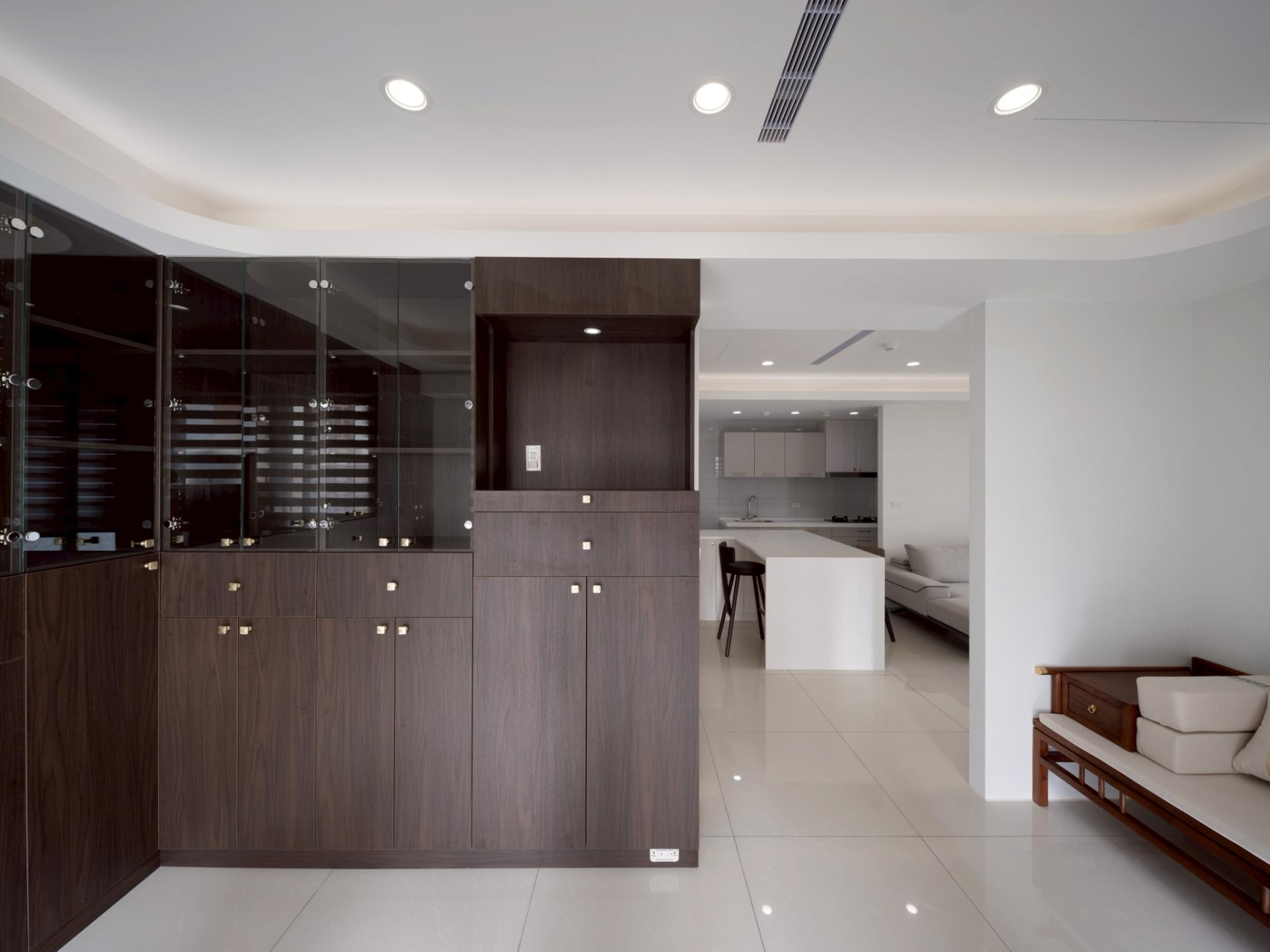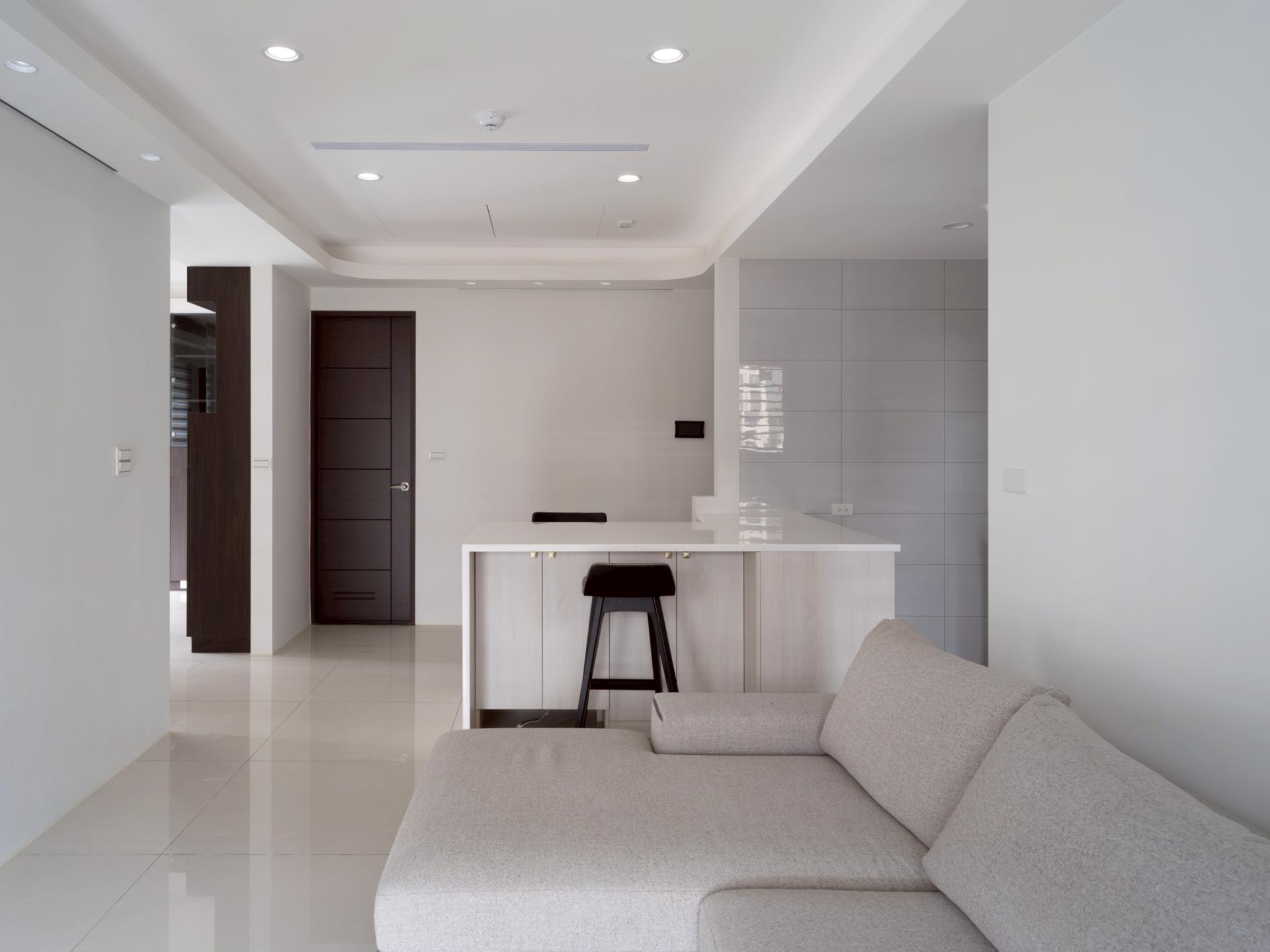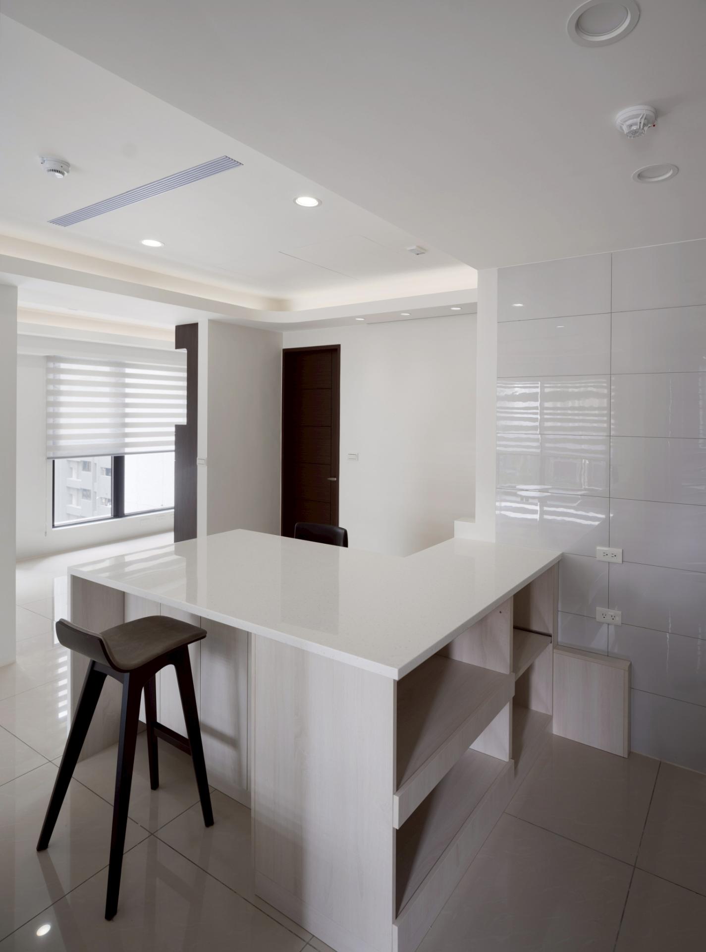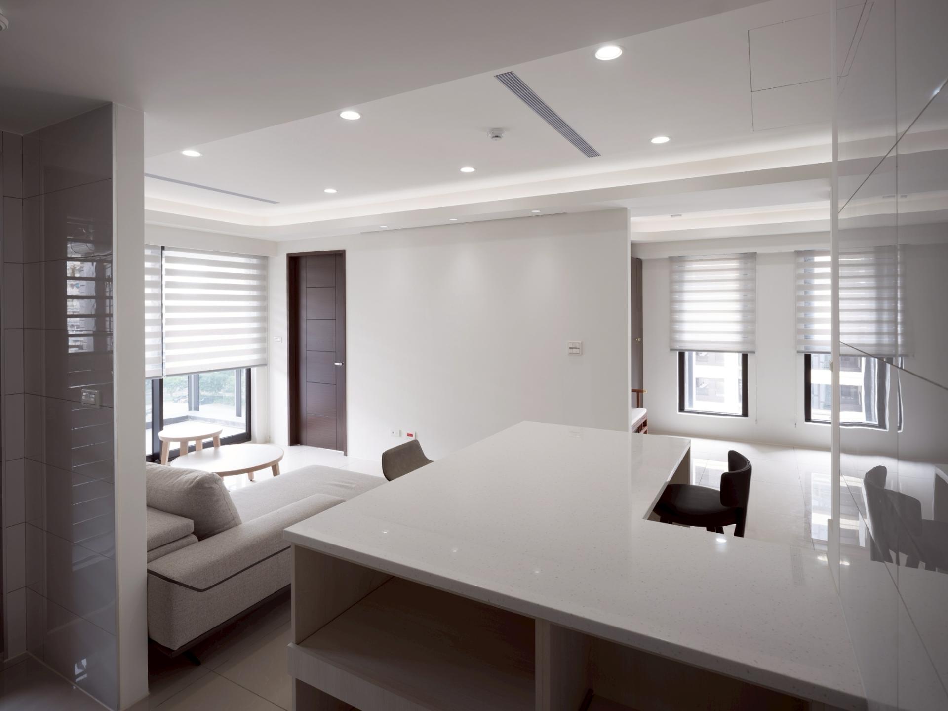 This urban residential design elegantly embraces a modern minimalist aesthetic, with “spatial extension” serving as its central theme. Notably, the design skillfully merges two original rooms to create a serene Chinese-style study, which invites focus and tranquility. In addition, the layout features an open kitchen with a stylish island that fosters intimate family interactions, enhancing the home’s warmth and connectivity. The walls and ceiling are adorned with a harmonious palette of white shades and complementary hues, while the glossy marble flooring adds a touch of sophistication. Its varied reflective effects artfully expand the sense of space, creating an inviting environment. Furthermore, the curved edges of the ceiling are accentuated by subtle indirect lighting, adding an atmospheric glow that enhances the overall ambiance. To complete this thoughtfully curated space, adjustable double-layered curtains grace the windows, allowing soft, flowing light to filter in and cultivate a comfortable, welcoming living atmosphere.