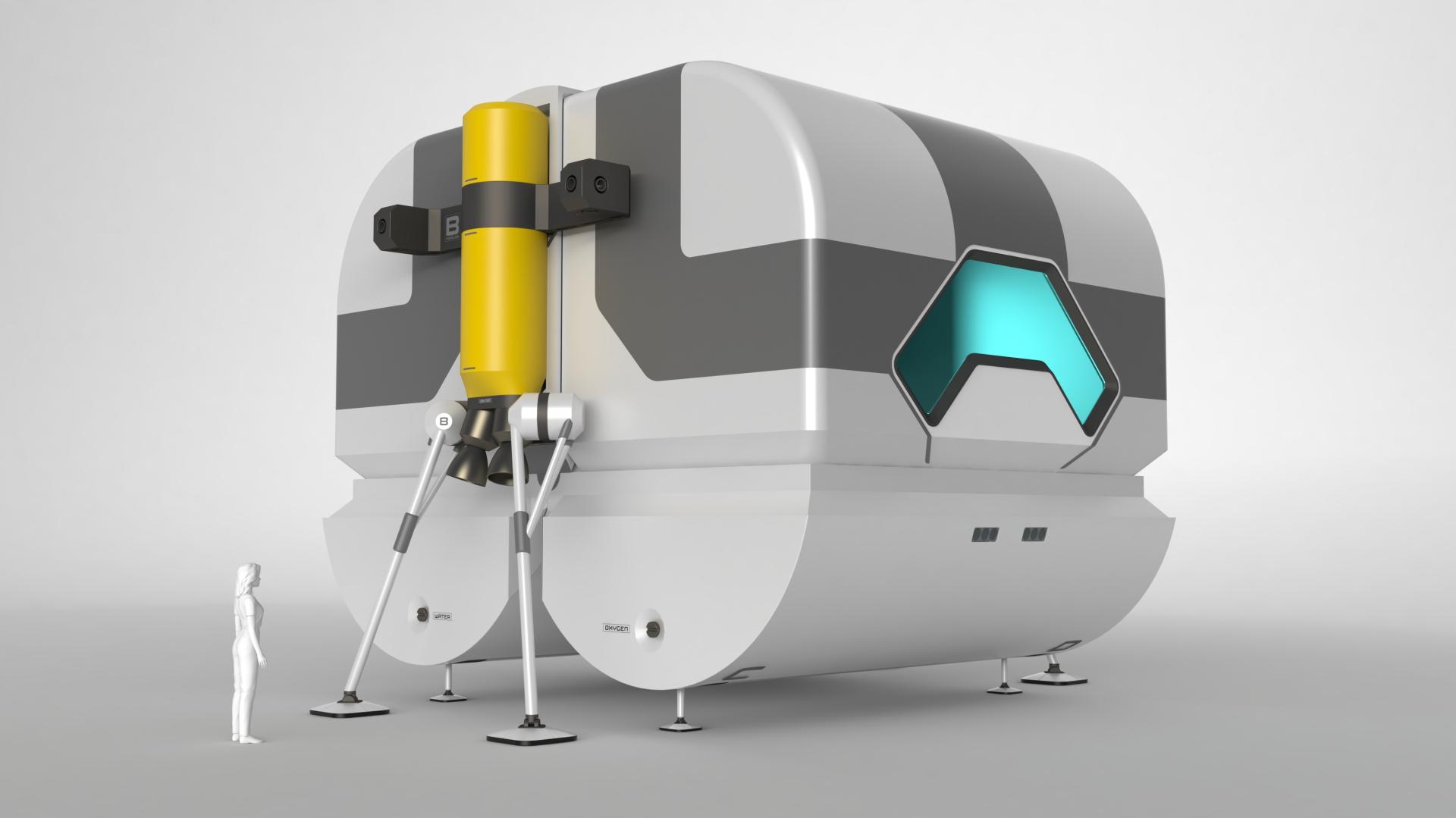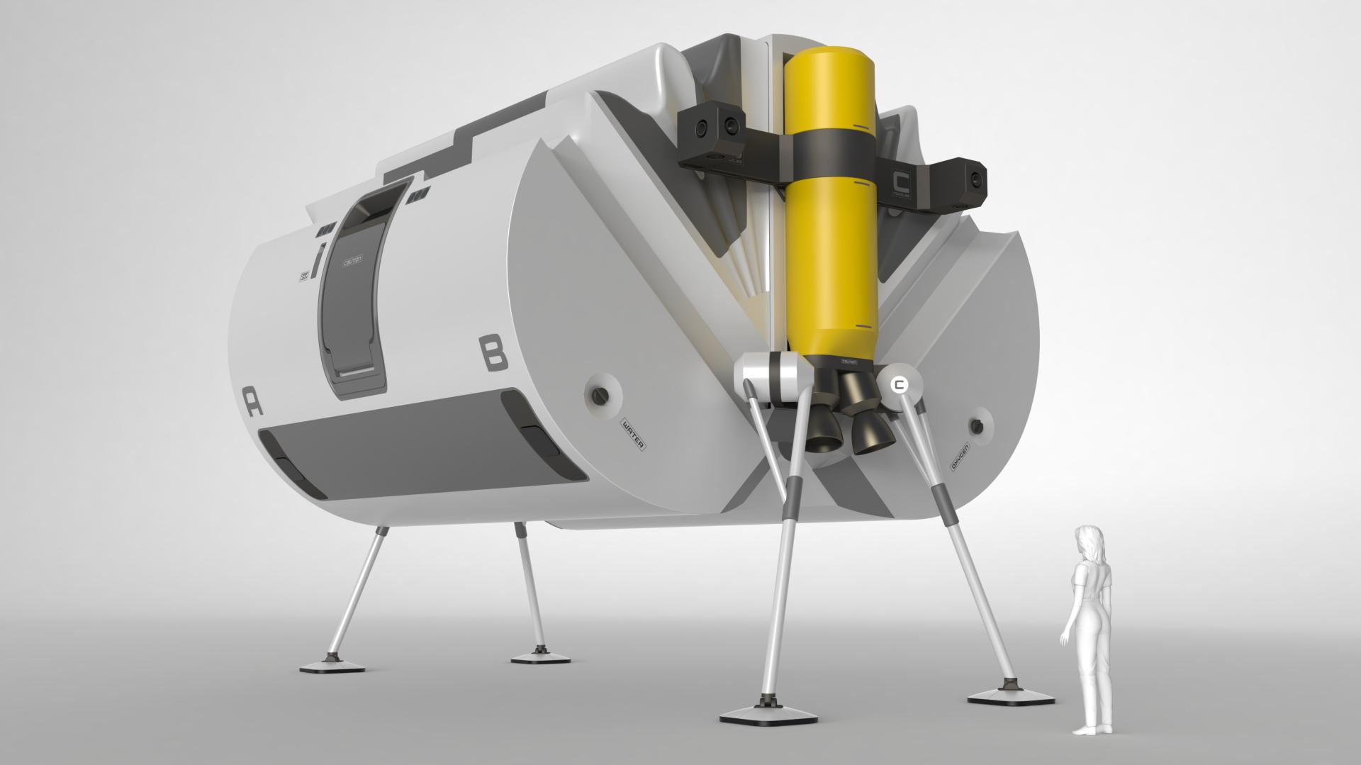 The first key aspect of the habitat is the solid framework structure combined with the engine segments located externally on each side and comprising the fuel tanks needed for operation of the braking thrusters for the descent onto the moon’s surface. Located on each side of the engine segments are the landing struts, which during flight and descent phases are fixed to the module in a parking position, thus enabling a very compact transport set-up. Towards the end of the descent, the landing struts are released and moved to their final landing position. At the bottom part of the central framework structure is a continuous, horizontally aligned axial shaft, on which two semi-cylindrical segments are mounted on each side. In their bottom part these two segments accommodate all the necessary technical functions and utility components. The space available above in each segment is used for holding the inflatable shell structures, which at this time are still compactly folded up.