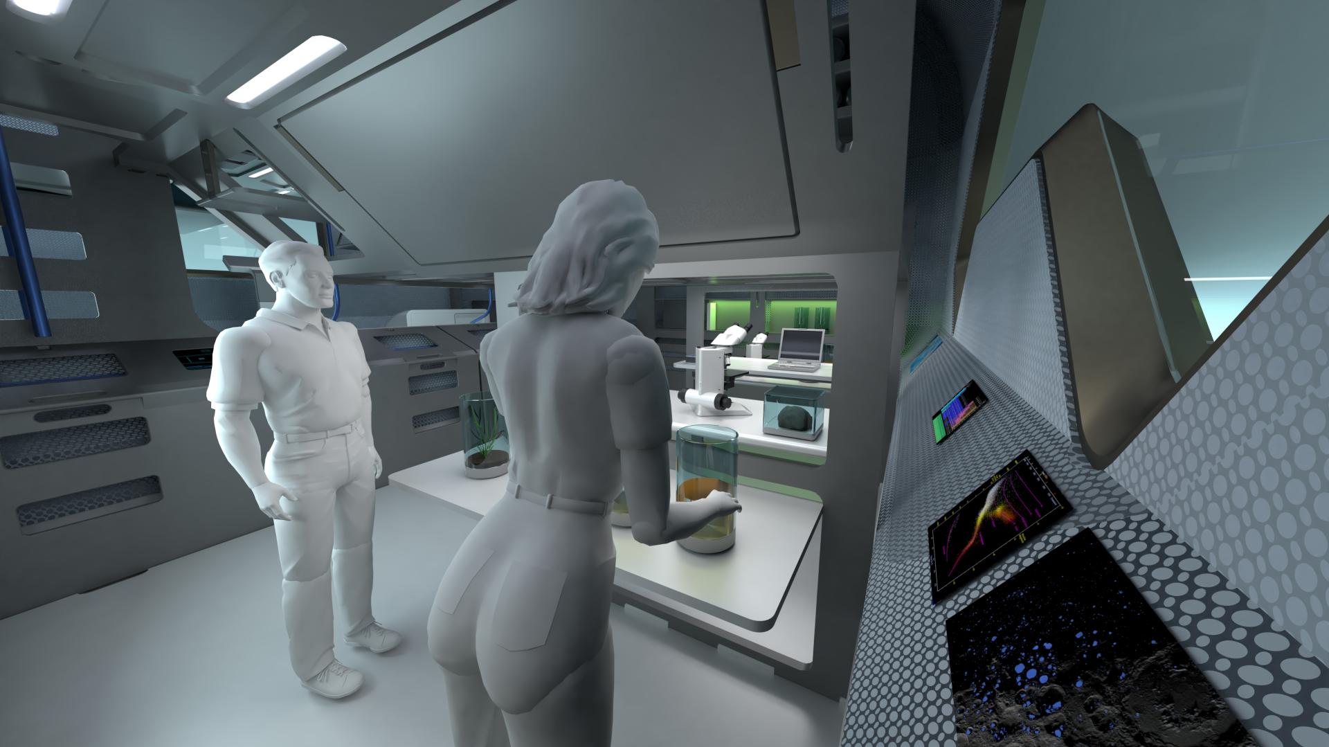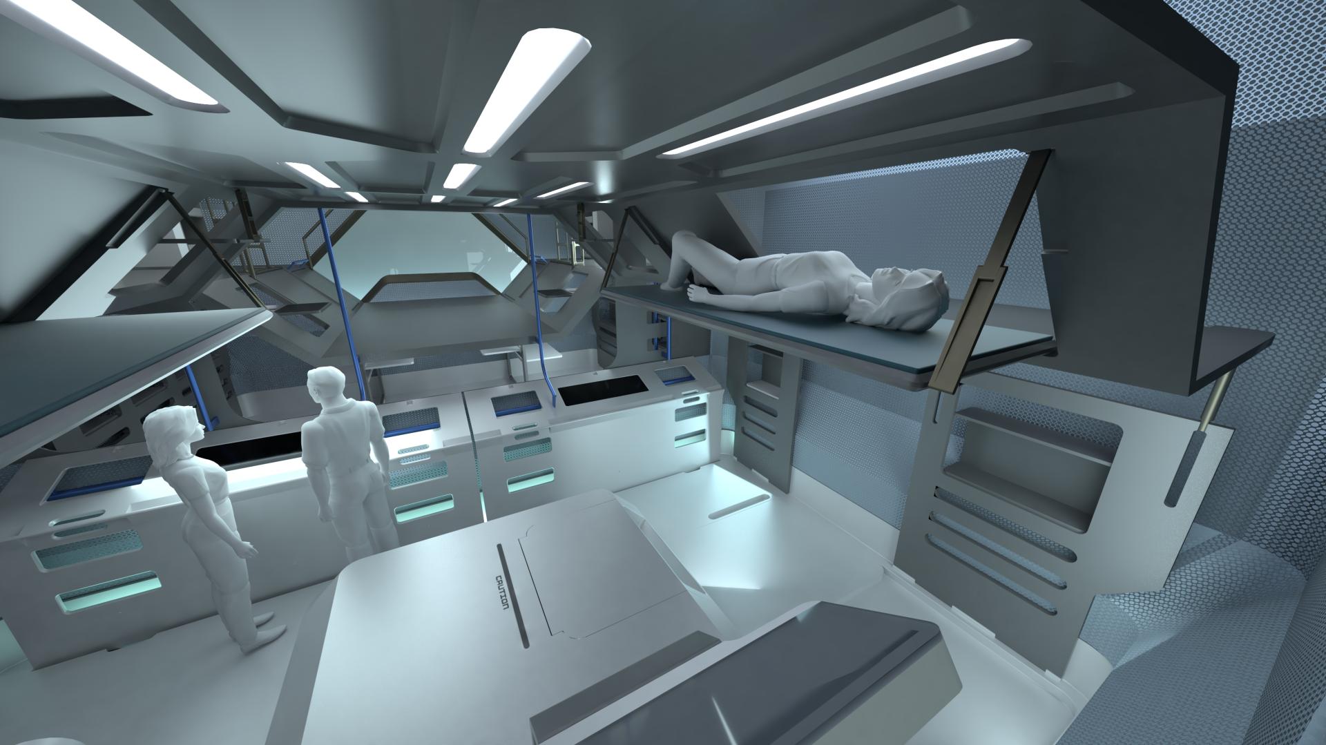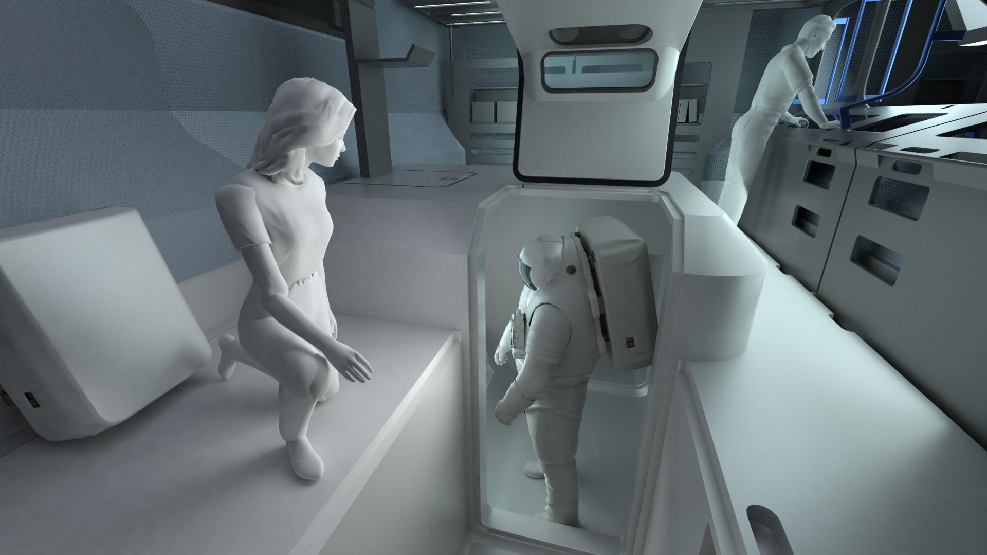 Simultaneously with this 90° swivel movement the inflatable shell sections are filled with compressed air to form the outer shell of the habitat. The whole procedure is completely automated. The second key aspect of the concept is that already 90% of the interior elements are included after the initial configuration and can be taken in to operation straightforward, instead of bringing them in from outside afterwards. This procedure saves both time, energy and huge costs.