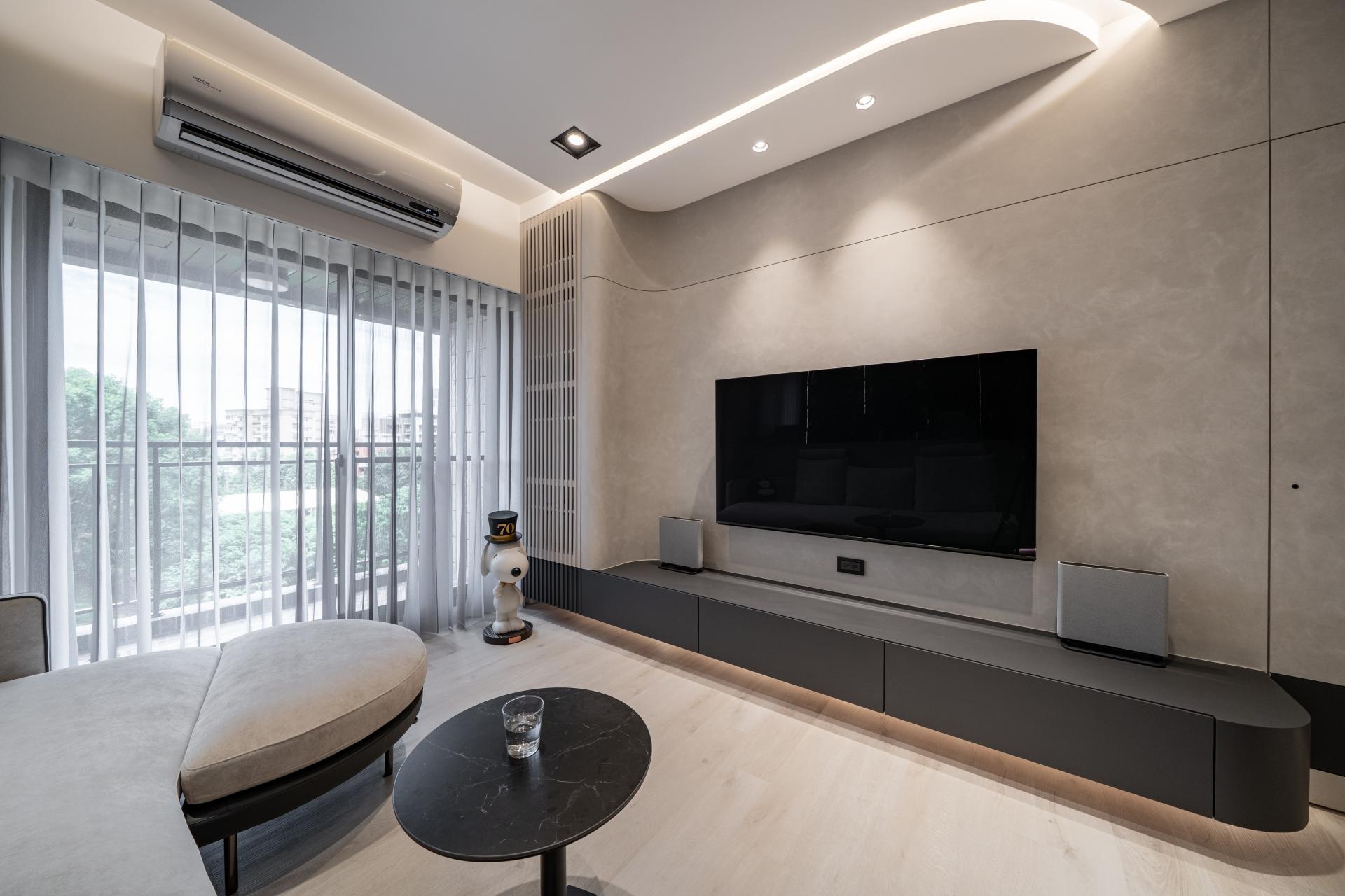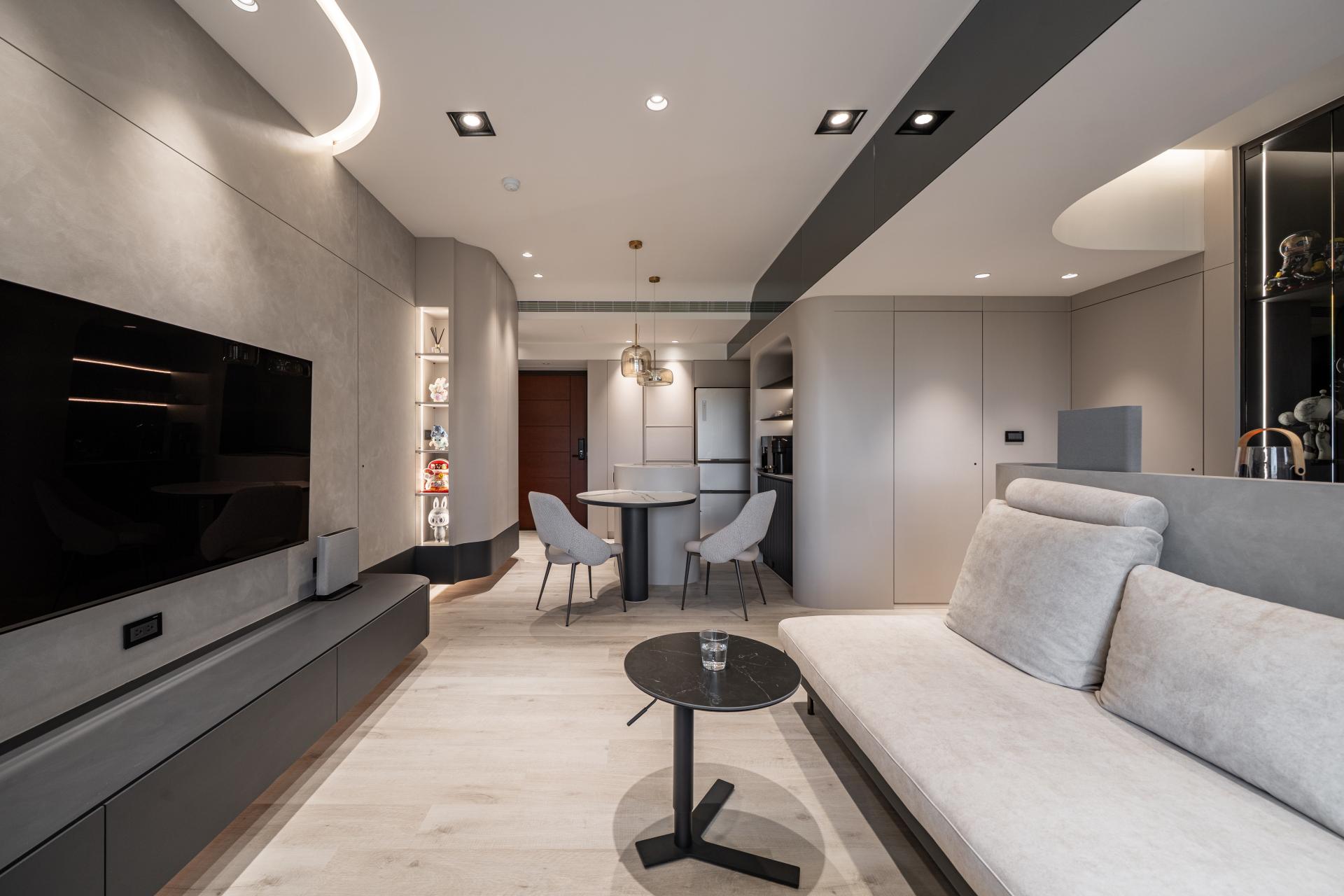 From the living room to the workspace, a continuous curved form connects each area, defining functions while guiding the eye smoothly along its path. The TV wall pairs matte textures with gentle curves, revealing layered shades of gray with quiet sophistication. Display cabinets and recessed niches are outlined by light strips, resembling the glossy reflection of bubbles, giving the interior a refined, gallery-like touch.