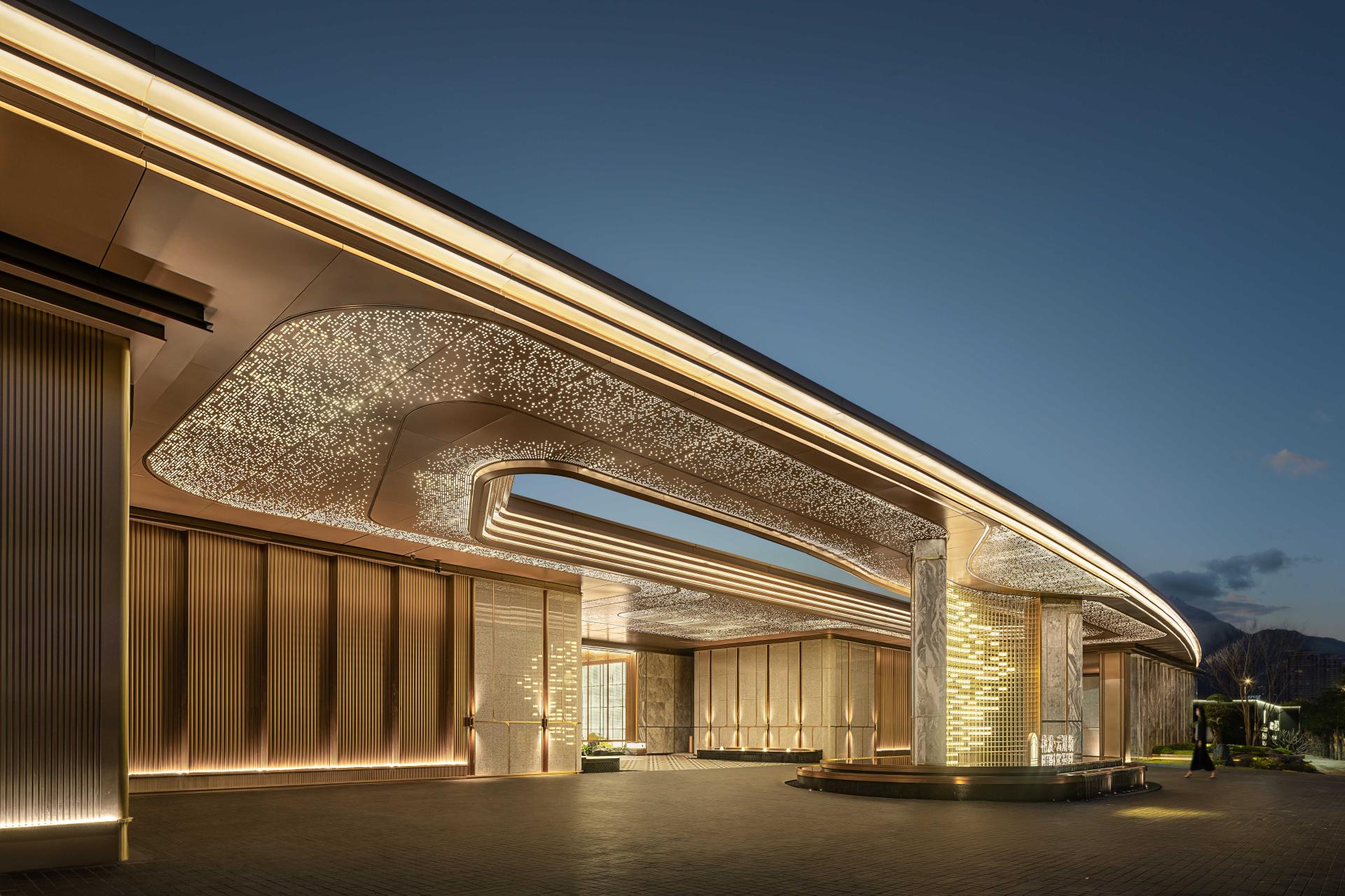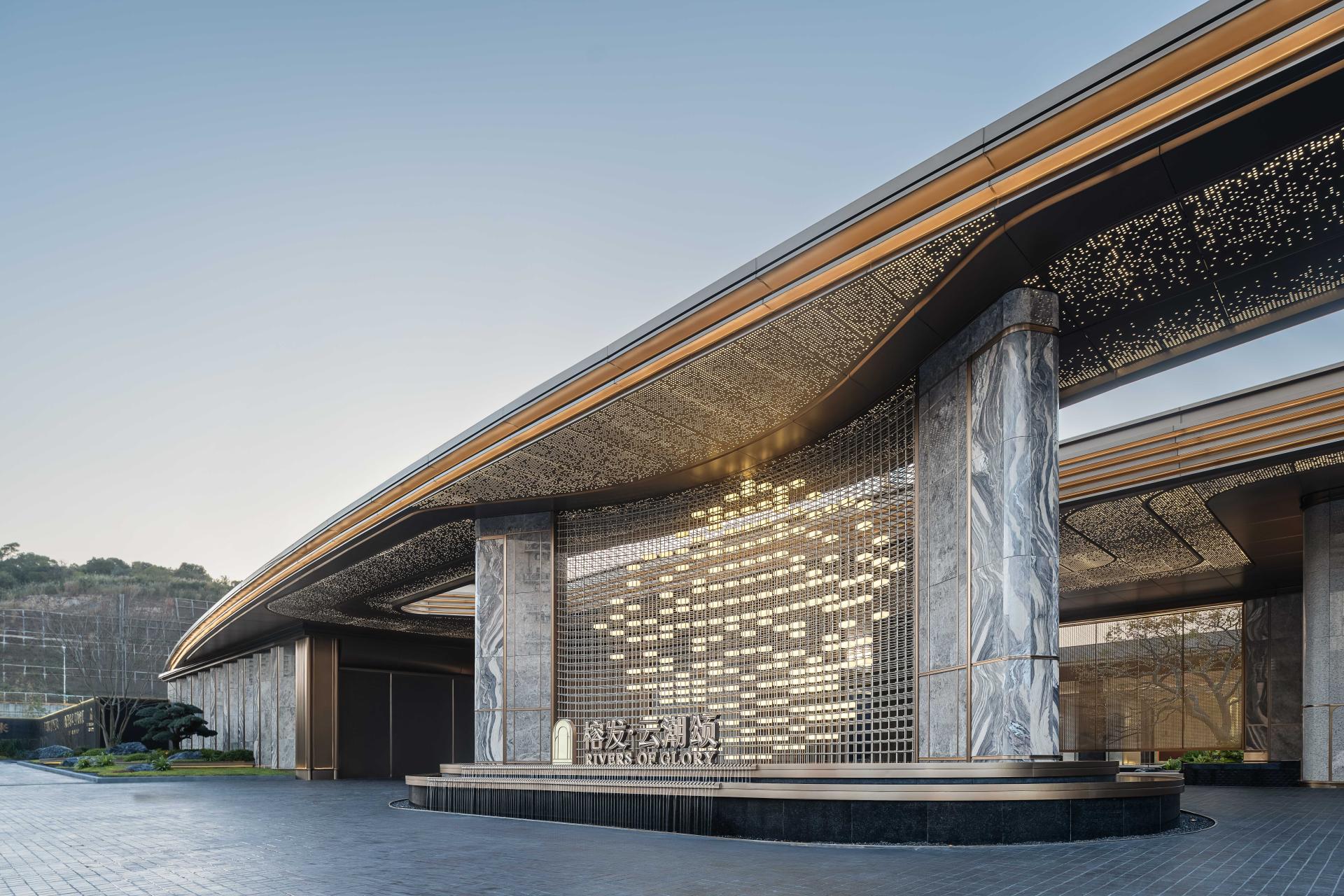 The spatial narrative logic of RIVERS OF GLORY is rooted in the spatial genes of Aofeng Academy in Fuzhou. It constructs an order with an axial spatial sequence and forms a dynamic viewing rhythm through an asymmetric wandering path. The front yard of the exhibition area adopts a drop-off system of a five-star hotel, and a perforated aluminum panel curtain wall with a horizontal extension of 82 meters is used to build a landmark interface. The entrance installation art forms a topological relationship between the starry sky dome designed parametrically and the waterscape. Its suspended form coincides with the hydrodynamic characteristics of the Minjiang River Basin. The cloud-shaped sculpture composed of mirror-finished stainless steel grilles and light-guiding acrylic modules realizes the contemporary translation of traditional cultural context through parametric weaving technology.