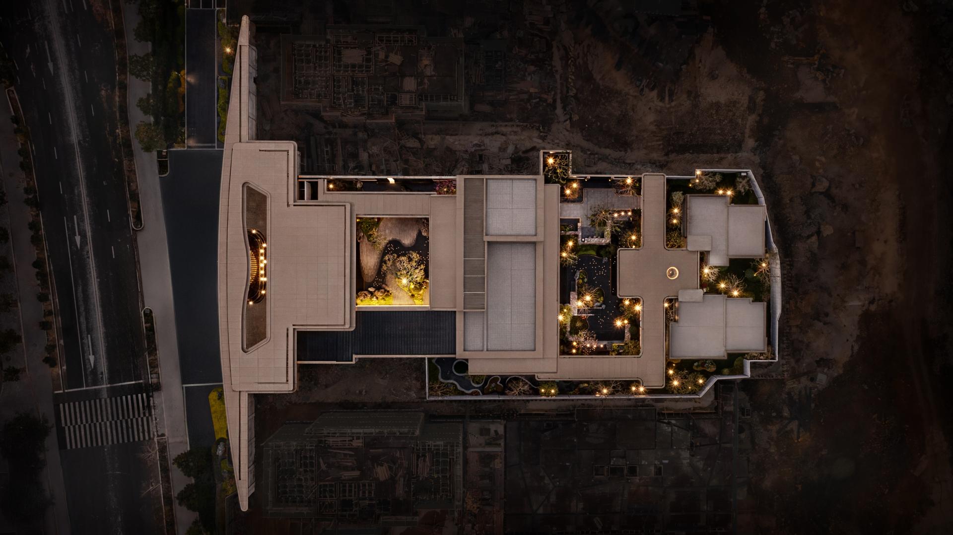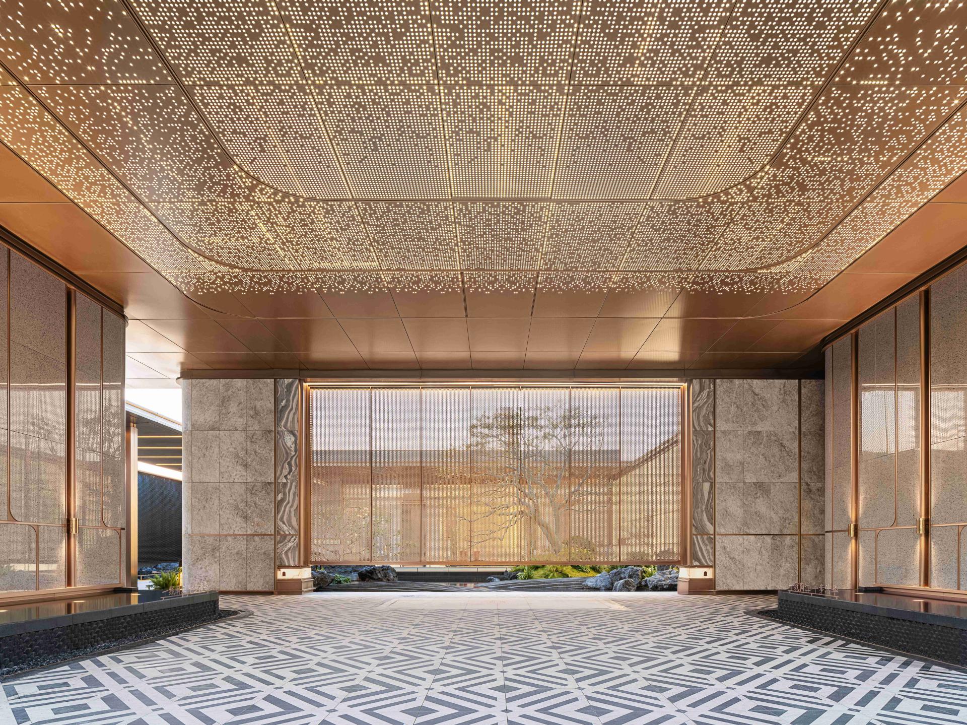 The visitor circulation unfolds through a deconstructed spatial sequence: In the drop-off area, a framed view window formed by a metal hollow-out screen is presented first, hinting at the spatial hierarchy of the second courtyard. After a 90-degree path turn, one enters the viewing corridor enclosed by a double-height transparent curtain wall. The hazy water courtyard created by the misting system and the translucent cloud stone landscape wall form a visual tension where the real and the virtual coexist.