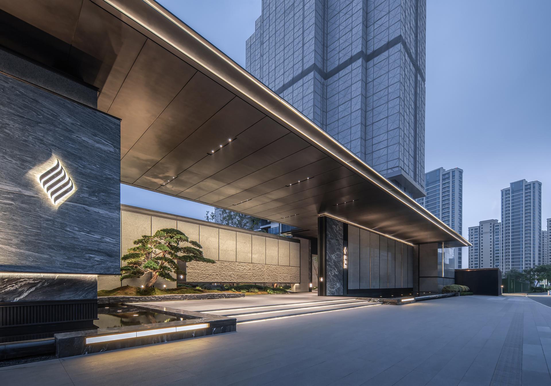 The homecoming gate and hall feature a luxurious stone landscape gate over 60 meters long, combined with double - sided shining crystal diamonds and four - sided aluminum plate facades, creating an unprecedented prominent facade in the Binjiang area. The collision of the full curtain wall system with luxurious stones and stainless steel materials creates an extremely elegant homecoming experience. Stepping from the hustle and bustle into the quietness, the state of mind is sublimated accordingly.