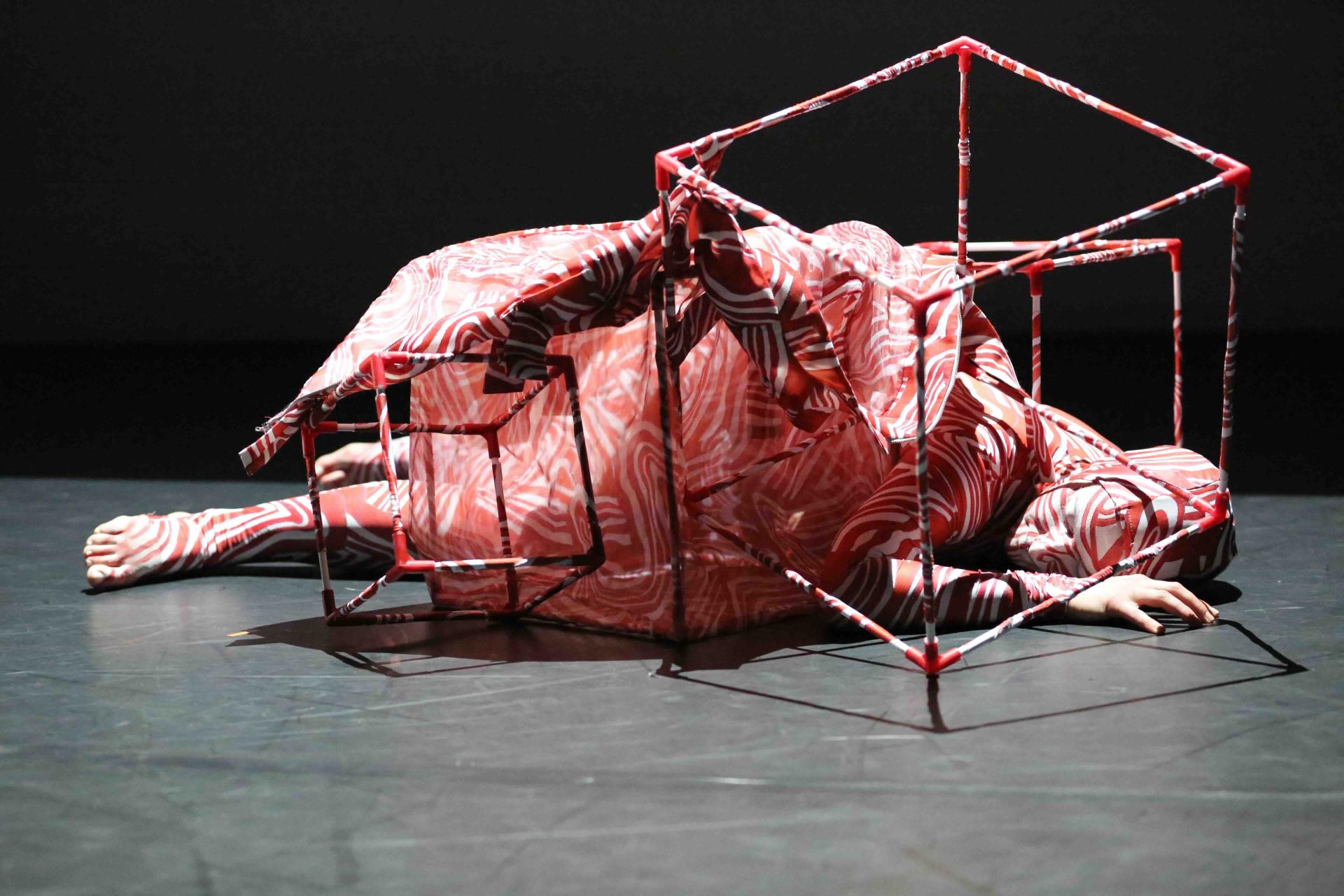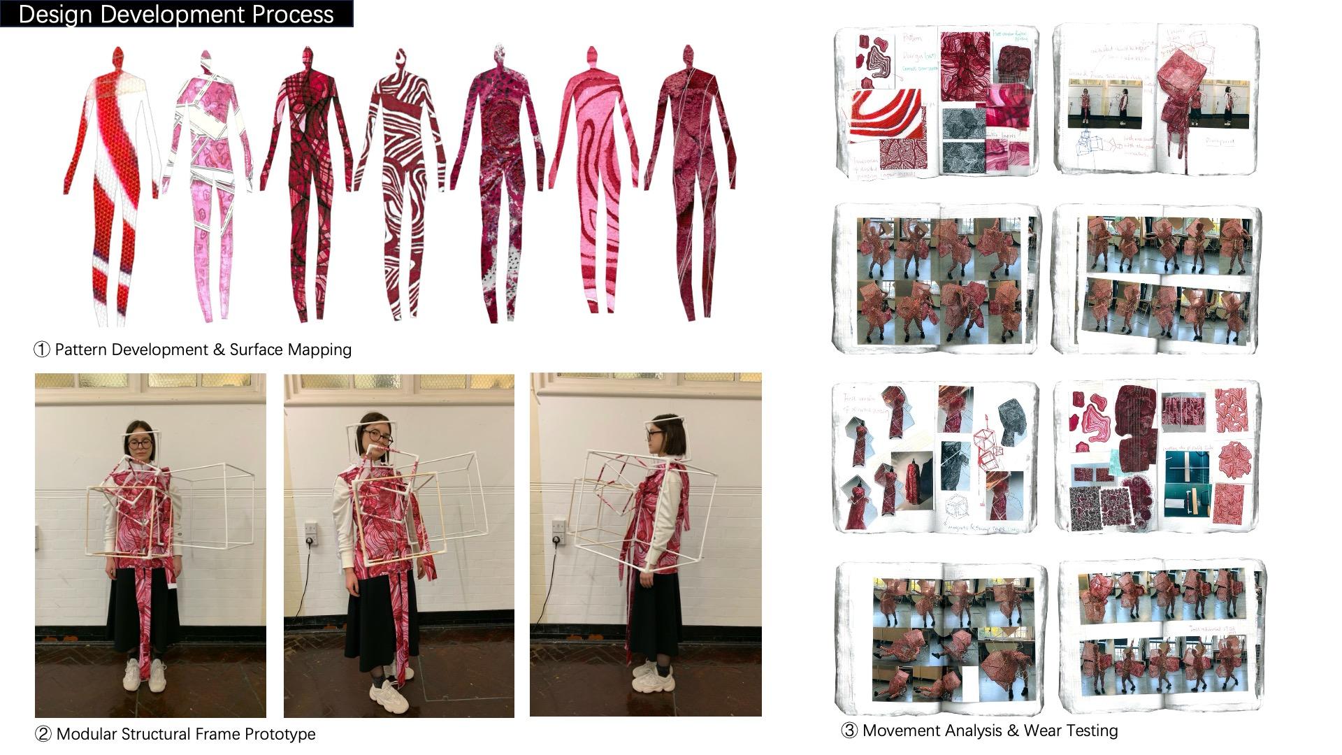 The character functions as an environmental sensor, using translucent layers and modular geometric structures to perceive and respond to surrounding spatial conditions. Through material experimentation and structural deconstruction, the garment system transforms rigid forms into fluid silhouettes, reflecting continuous identity reconstruction. Iterative prototyping and movement testing enable the character to adapt to body dynamics, environmental pressure, and emotional states.