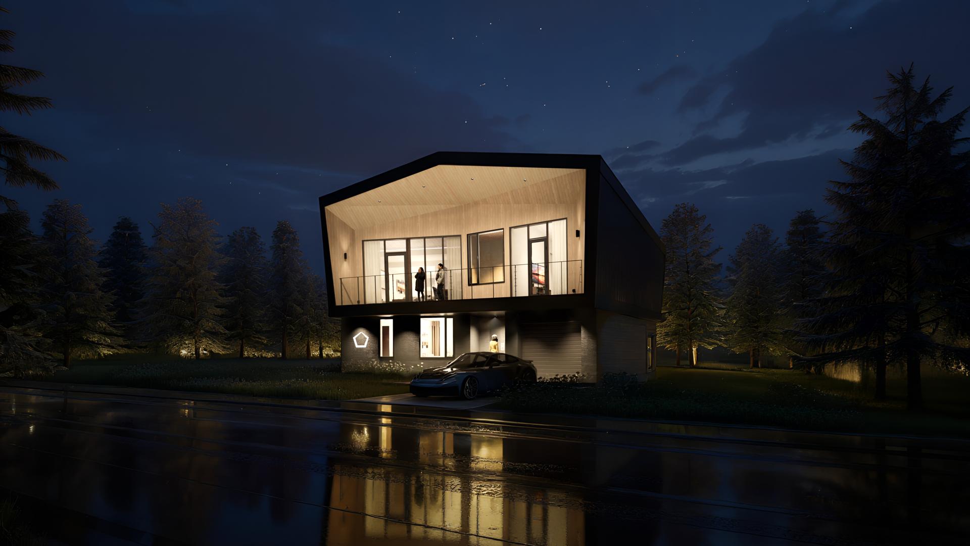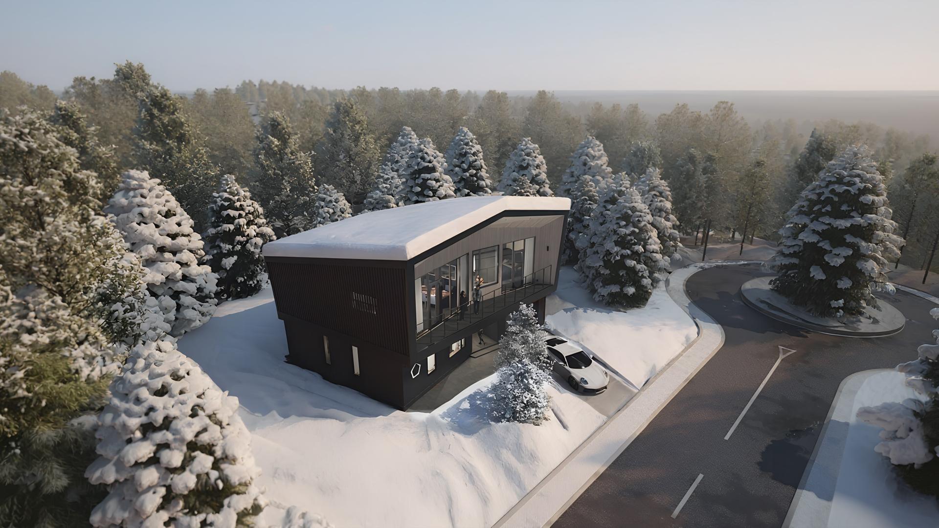 Conceived as a contemporary alpine residence, the architecture responds directly to its climate, surroundings, and distant vistas. Rather than a conventional orthogonal layout, the building adopts a pentagonal plan that simultaneously orients the interior toward Mount Yotei and the town of Kutchan while maintaining privacy and compact circulation. The geometry is expressed both horizontally through the balcony and cantilevered roof, and vertically through a continuous metal outline framing the glazed upper façade.